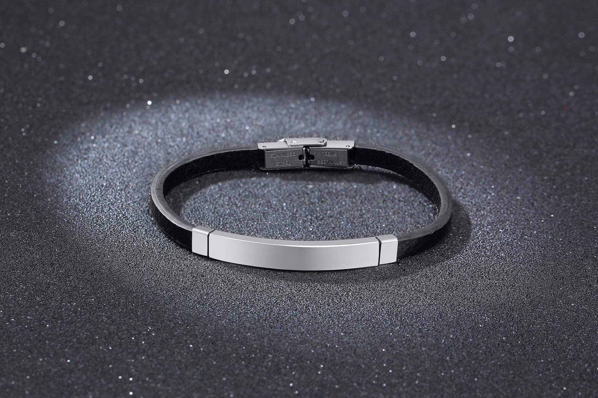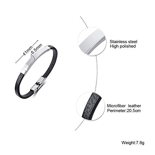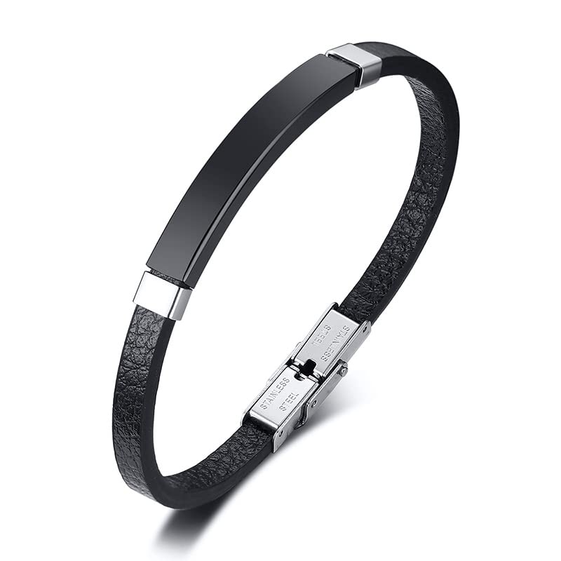 Rockyu ブレスレット メンズ 本革 プレートデザイン ステンレス製 金属アレルギー対応 レザーバングル