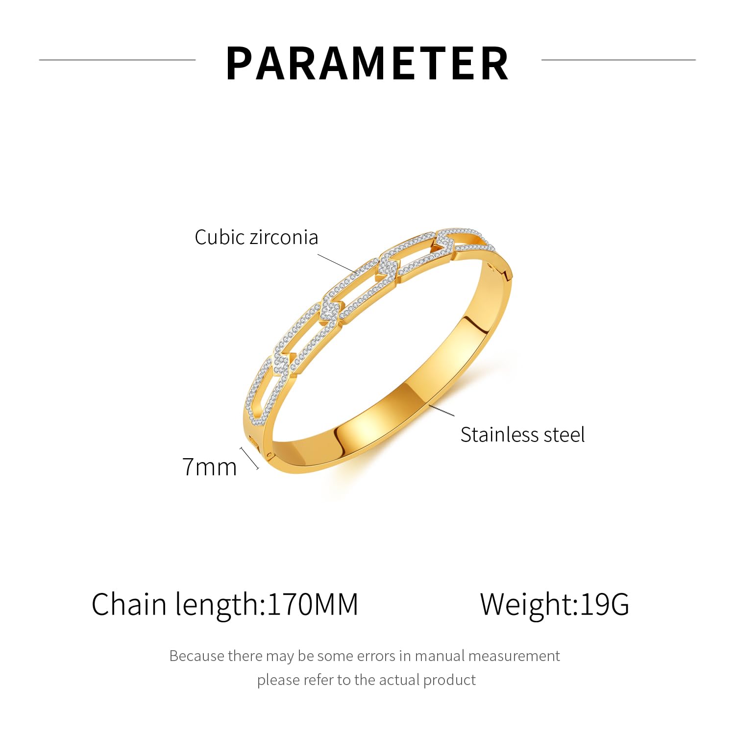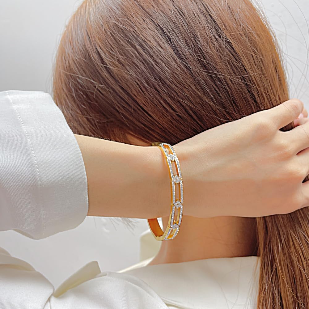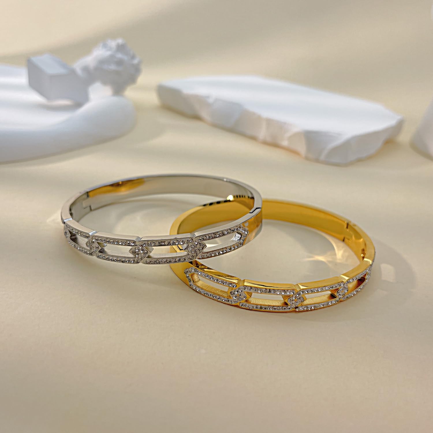 洗練された透かしデザインとキュービックジルコニアの輝きが魅力のレディースバングルです。上品なゴールドとクールなシルバーの2色展開で、スタイルやシーンに合わせて選べます。7mm幅の細身シルエットながら、精密にカットされた多粒ジルコニアが光を反射し、手元を華やかに演出。高品質ステンレス製で、金属アレルギーにも配慮された安心設計。手首周り170mm、重さ19gと快適な着け心地で、日常使いからフォーマルシーンまで幅広く活躍します。誕生日や記念日のギフトにも最適な、高級感と実用性を兼ね備えた一本です。