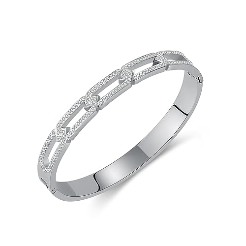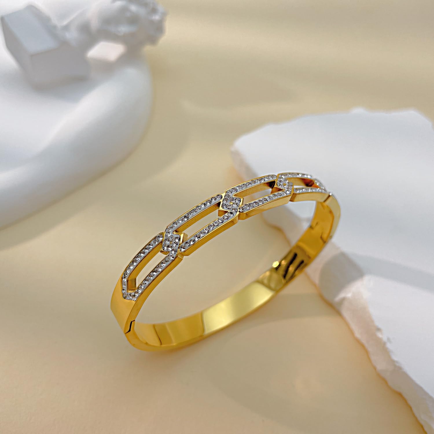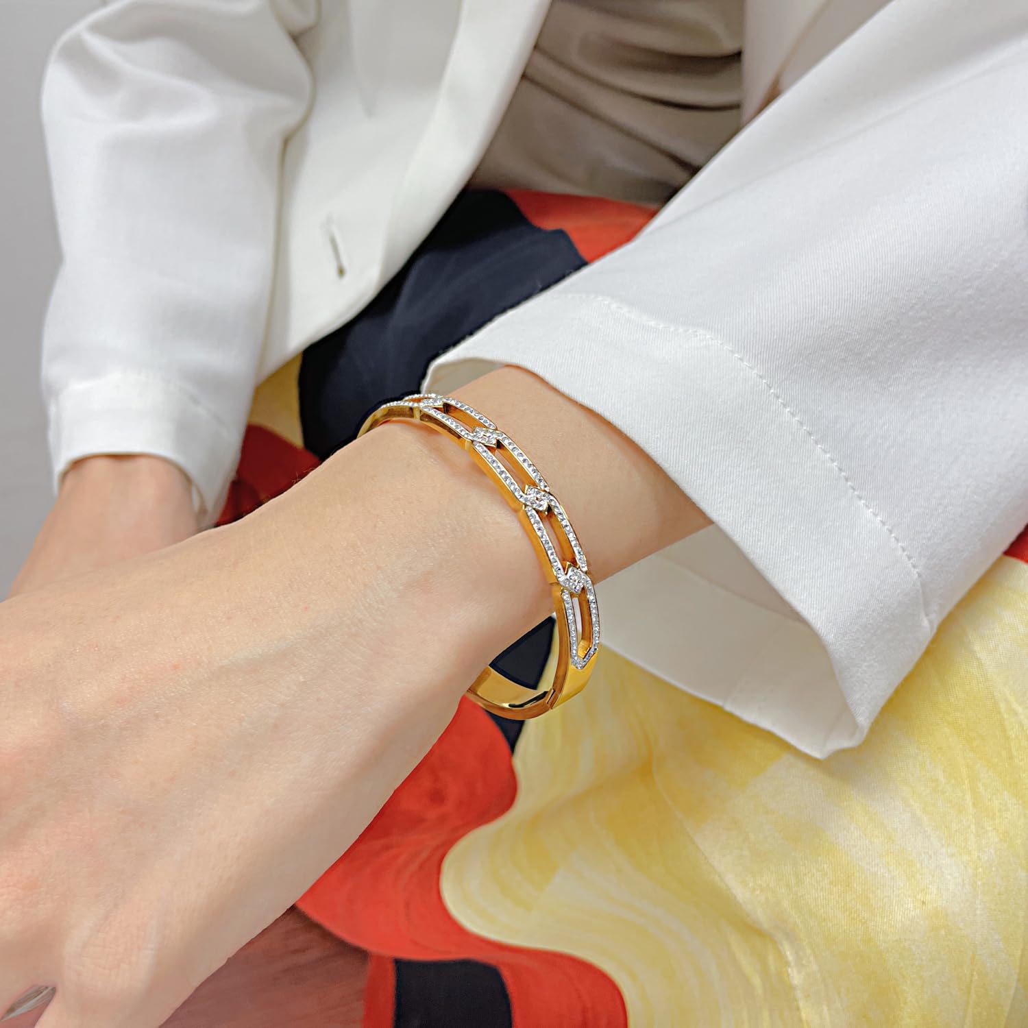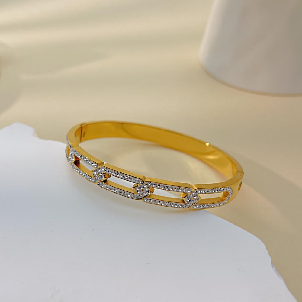 洗練された透かしデザインとキュービックジルコニアの輝きが魅力のレディースバングルです。上品なゴールドとクールなシルバーの2色展開で、スタイルやシーンに合わせて選べます。7mm幅の細身シルエットながら、精密にカットされた多粒ジルコニアが光を反射し、手元を華やかに演出。高品質ステンレス製で、金属アレルギーにも配慮された安心設計。手首周り170mm、重さ19gと快適な着け心地で、日常使いからフォーマルシーンまで幅広く活躍します。誕生日や記念日のギフトにも最適な、高級感と実用性を兼ね備えた一本です。