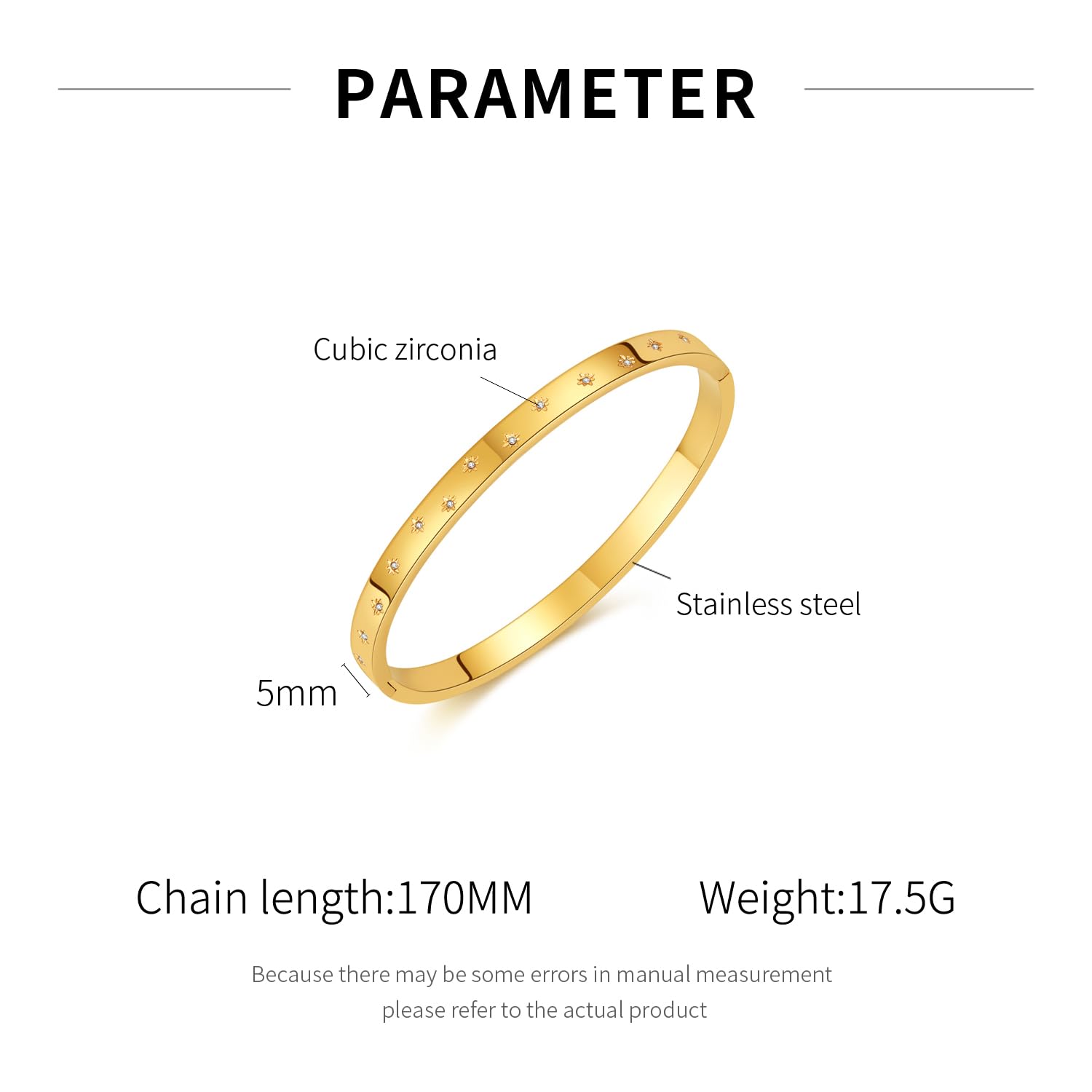 シンプルながらも上品な輝きを放つ、ジルコニア付きレディースバングルです。5mm幅のスリムなデザインに、均等に並んだ小粒のキュービックジルコニアがさりげないアクセントを加え、手元を華やかに演出します。高品質ステンレス製で、金属アレルギーにも配慮された安心設計。ゴールドとシルバーの2色展開で、フォーマルにもカジュアルにも合わせやすい万能アイテムです。手首周り170mm、重量17.5gと快適な着け心地。普段使いはもちろん、誕生日や記念日のギフトにも最適な、洗練されたデザインのバングルです。