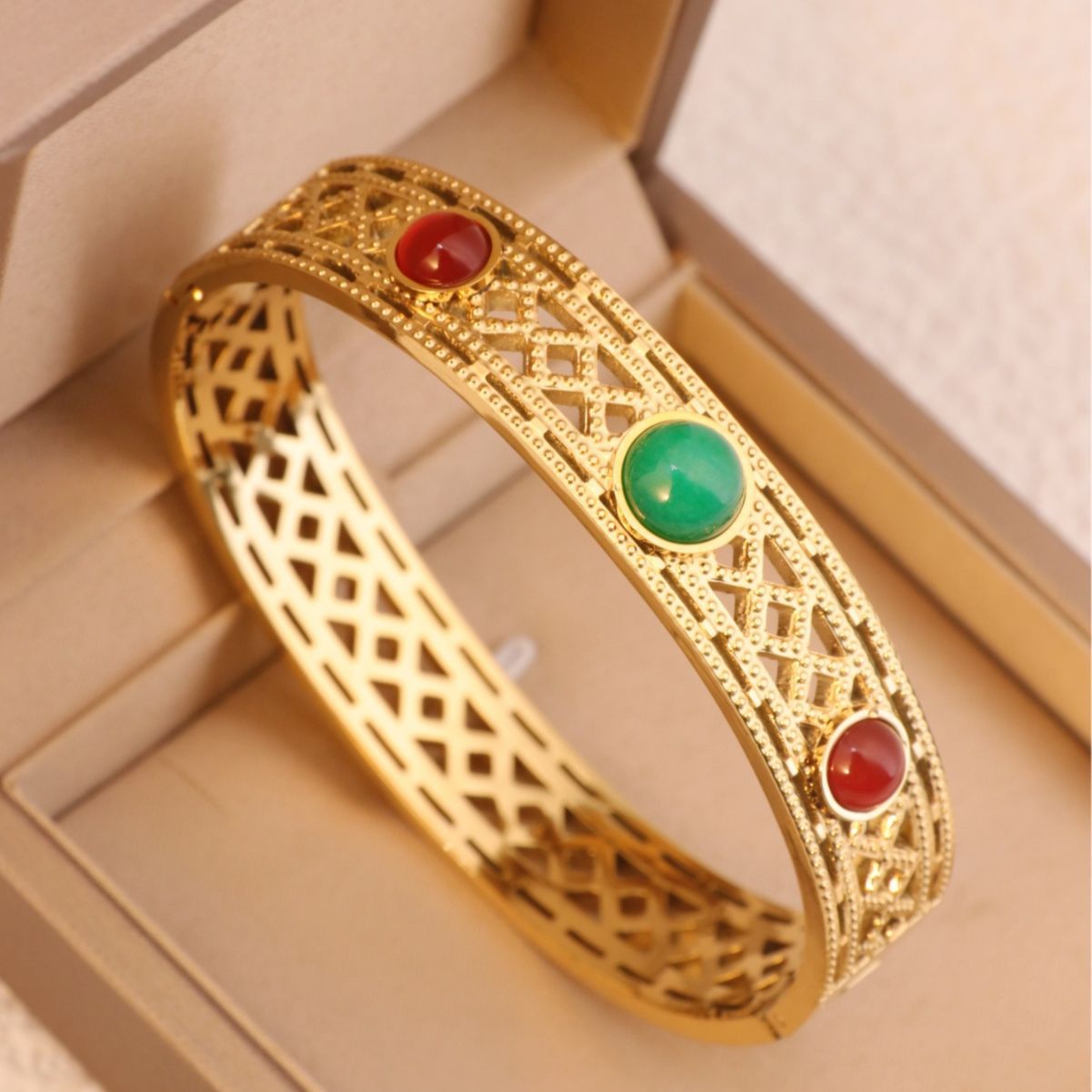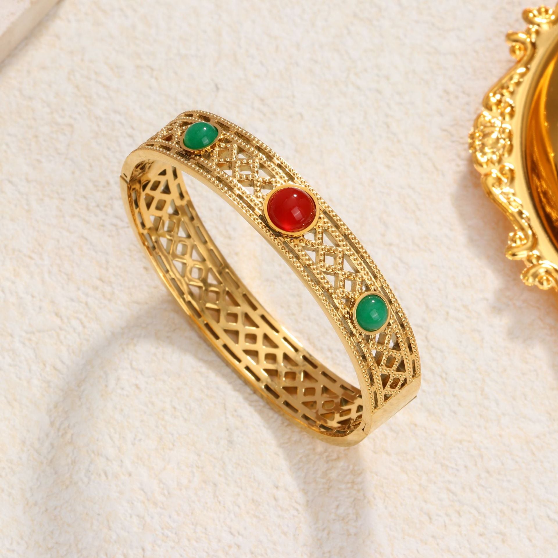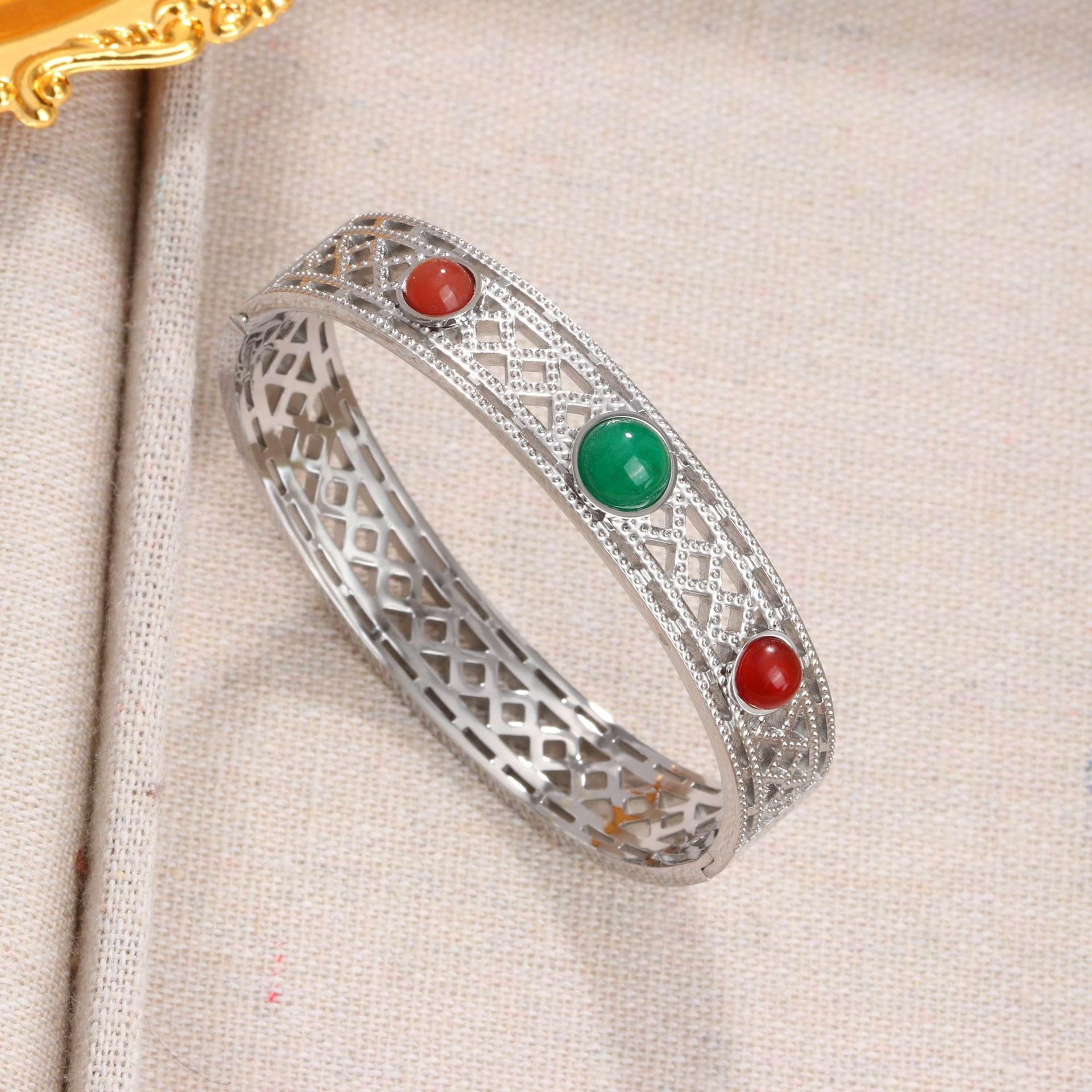 Rockyuが提案する、レトロで華やかな雰囲気のレディースバングル。精巧な透かし彫りデザインに、赤と緑の天然石を3つあしらった存在感のある仕上がりです。幅12mm、内径58mmの太めフォルムが手元をエレガントに彩り、カジュアルにもドレスアップにも映える万能デザイン。