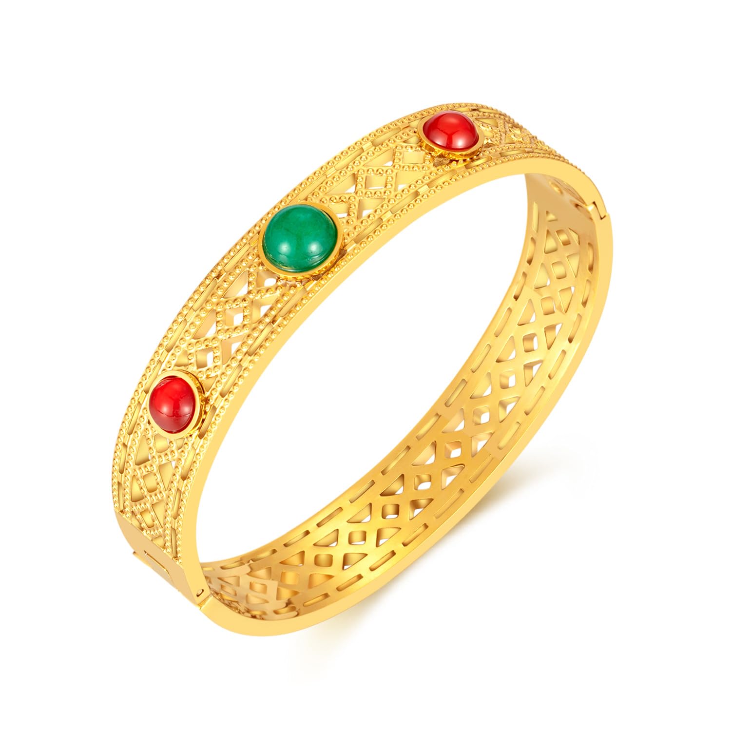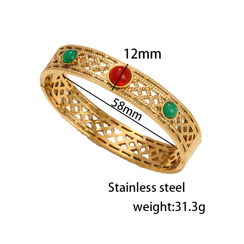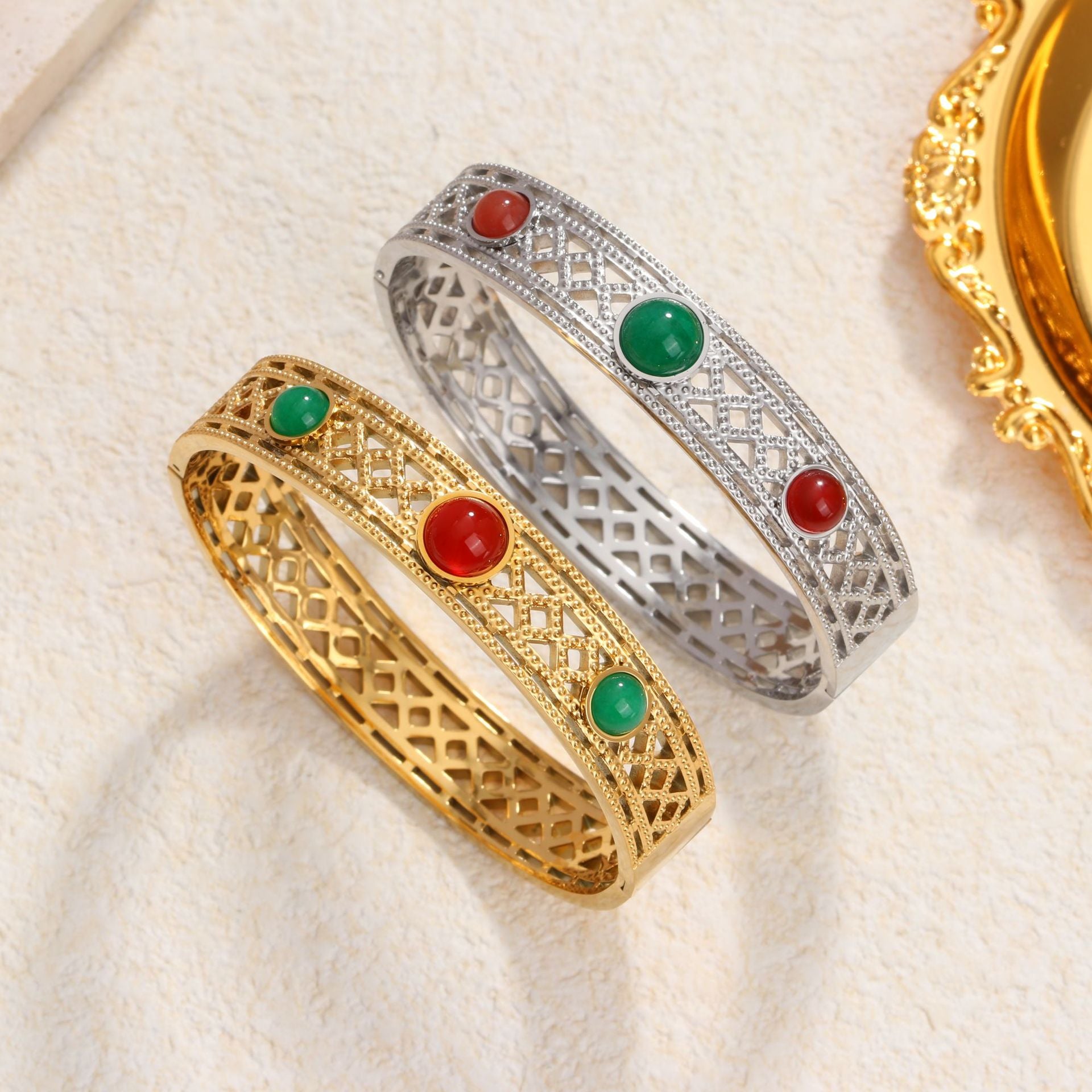 Rockyuが提案する、レトロで華やかな雰囲気のレディースバングル。精巧な透かし彫りデザインに、赤と緑の天然石を3つあしらった存在感のある仕上がりです。幅12mm、内径58mmの太めフォルムが手元をエレガントに彩り、カジュアルにもドレスアップにも映える万能デザイン。