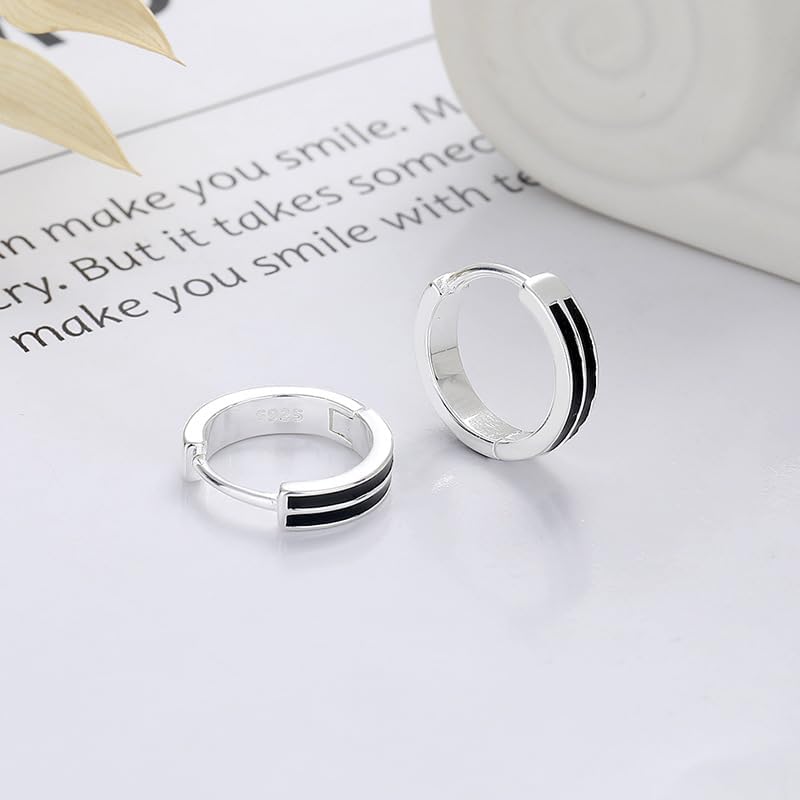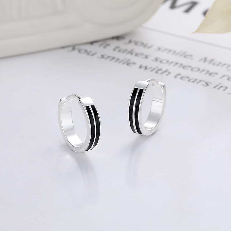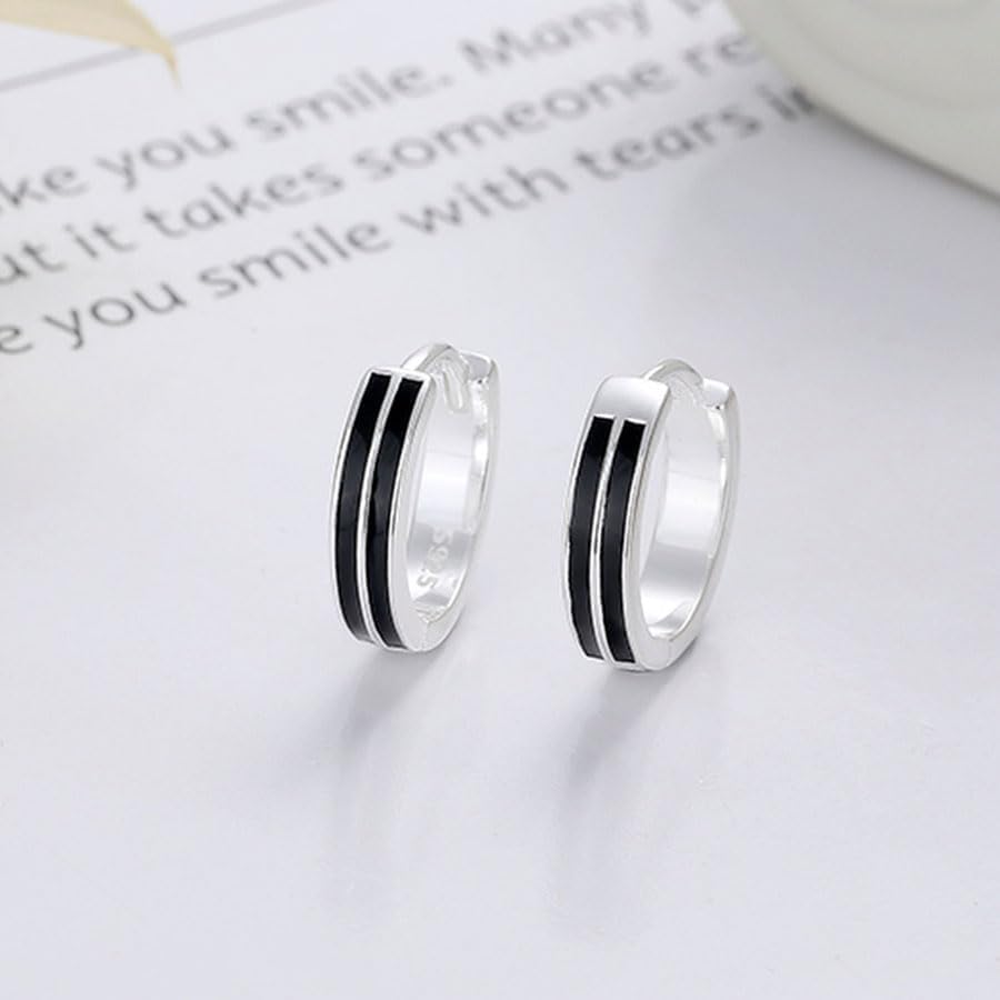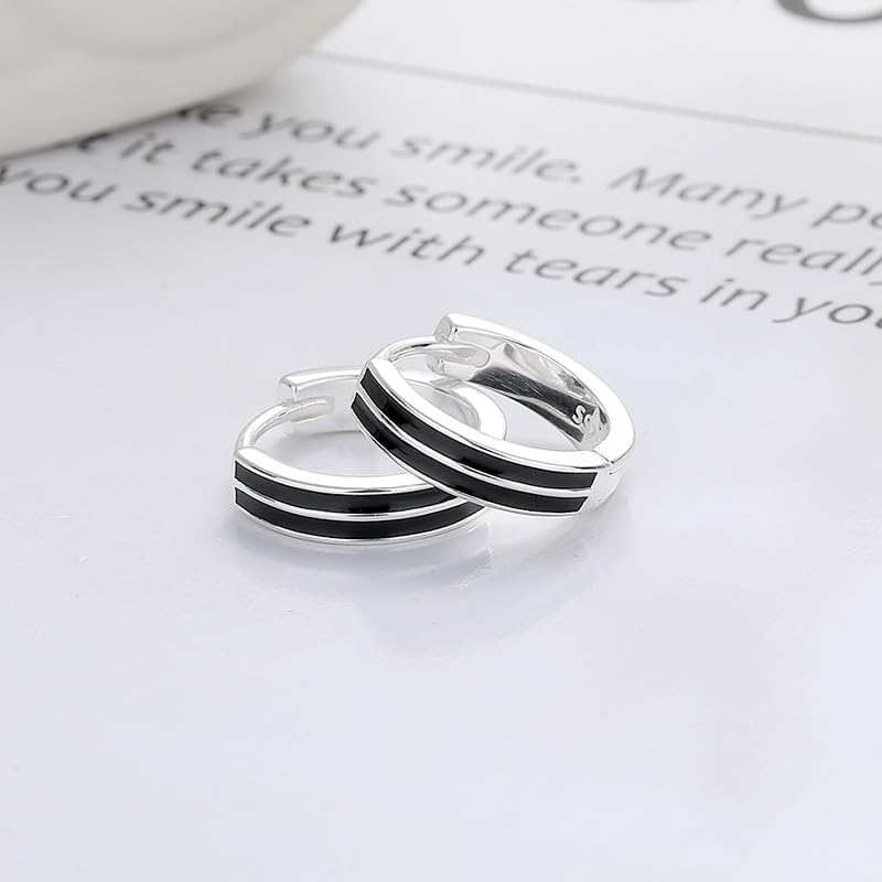 スタイリッシュなラインが魅せる大人の余裕──Rockyuのシルバー925ダブルブラックラインフープピアスは、洗練されたシンプルさの中に個性を宿すアクセサリー。耳輪内径1.1cm、幅3.5mmのバランス設計で、耳元にさりげない存在感を与えます。光沢あるシルバー925に艶やかなブラックエナメルを2本ラインで配置し、都会的でモードな印象を演出。男女兼用で、ペア使いやリンクコーデにも最適。ビジネスシーンからオフタイムまで幅広く対応し、誕生日や恋人の日、記念日のギフトとしても喜ばれる逸品です。耐久性と高級感を兼ね備え、長く愛用できる大人のマストアイテム。