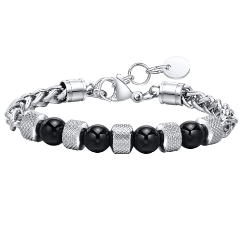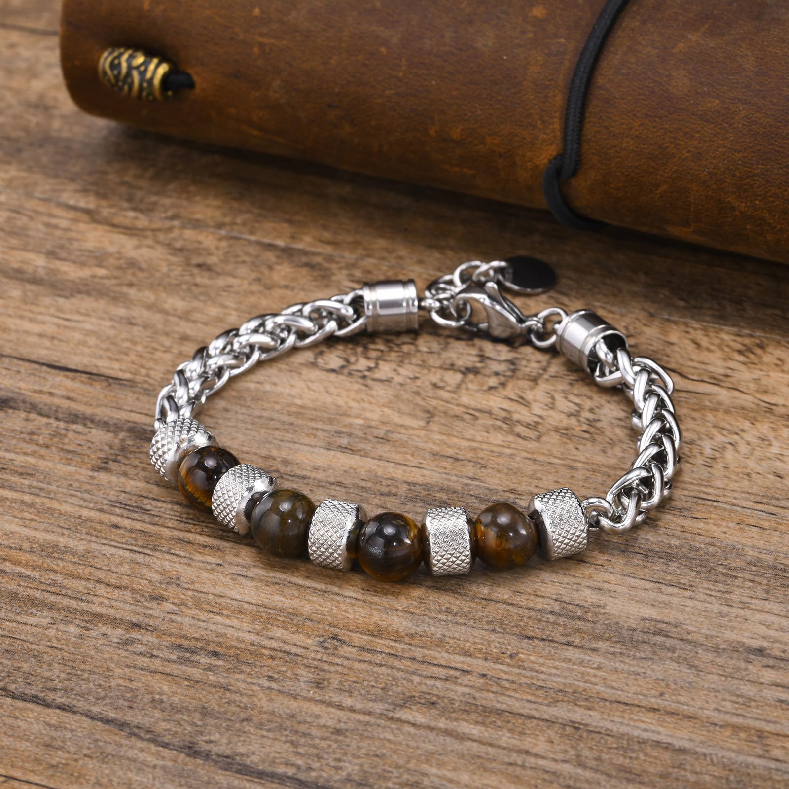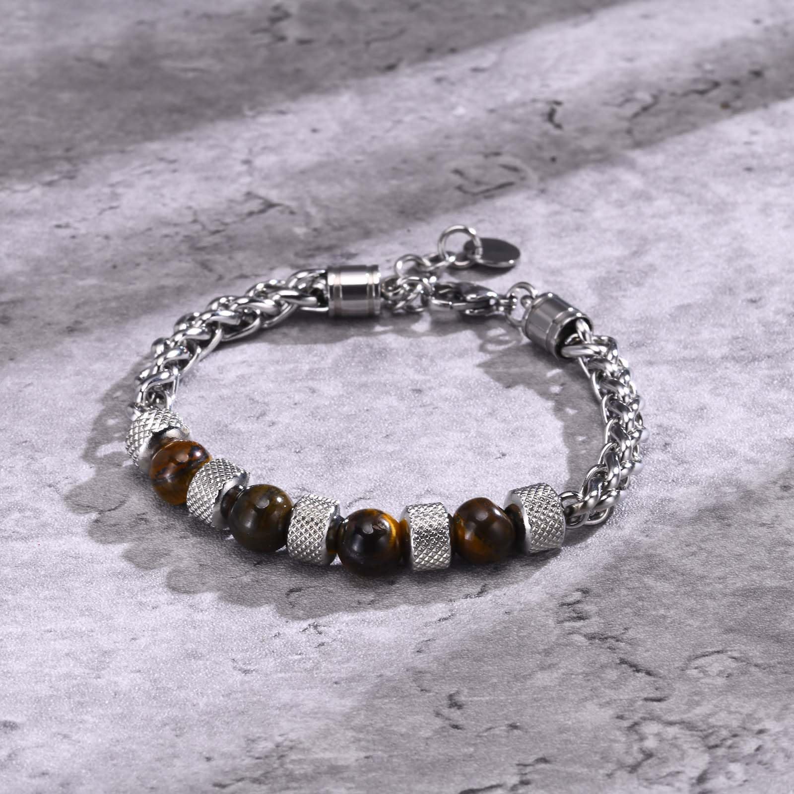 耐久性に優れたステンレスと高品質な天然石を組み合わせたメンズブレスレット。虎眼石(タイガーアイ)、ラピスラズリ、黒瑪瑙(オニキス)の3種類から選べ、それぞれ金運や守護の意味を持ちます。8mmの天然石ビーズとシルバーカラーのターラントチェーンが高級感を演出。長さ18〜21cmの調節可能デザインで、金属アレルギーにも対応。カジュアルからフォーマルまで幅広く活躍し、ギフトにも最適です。
