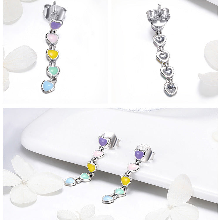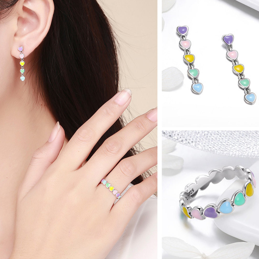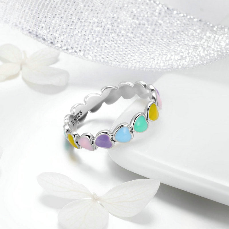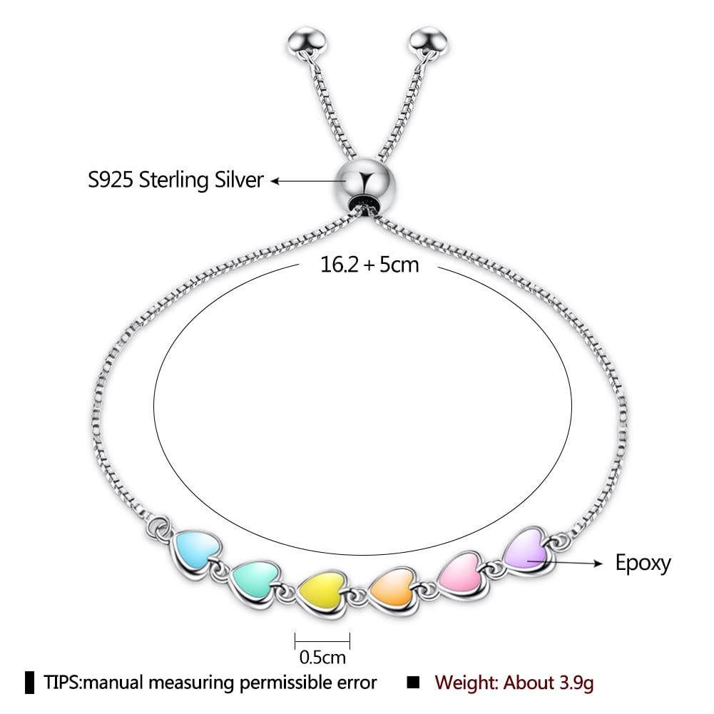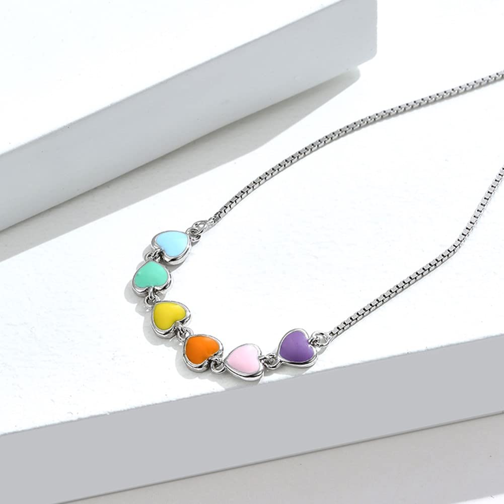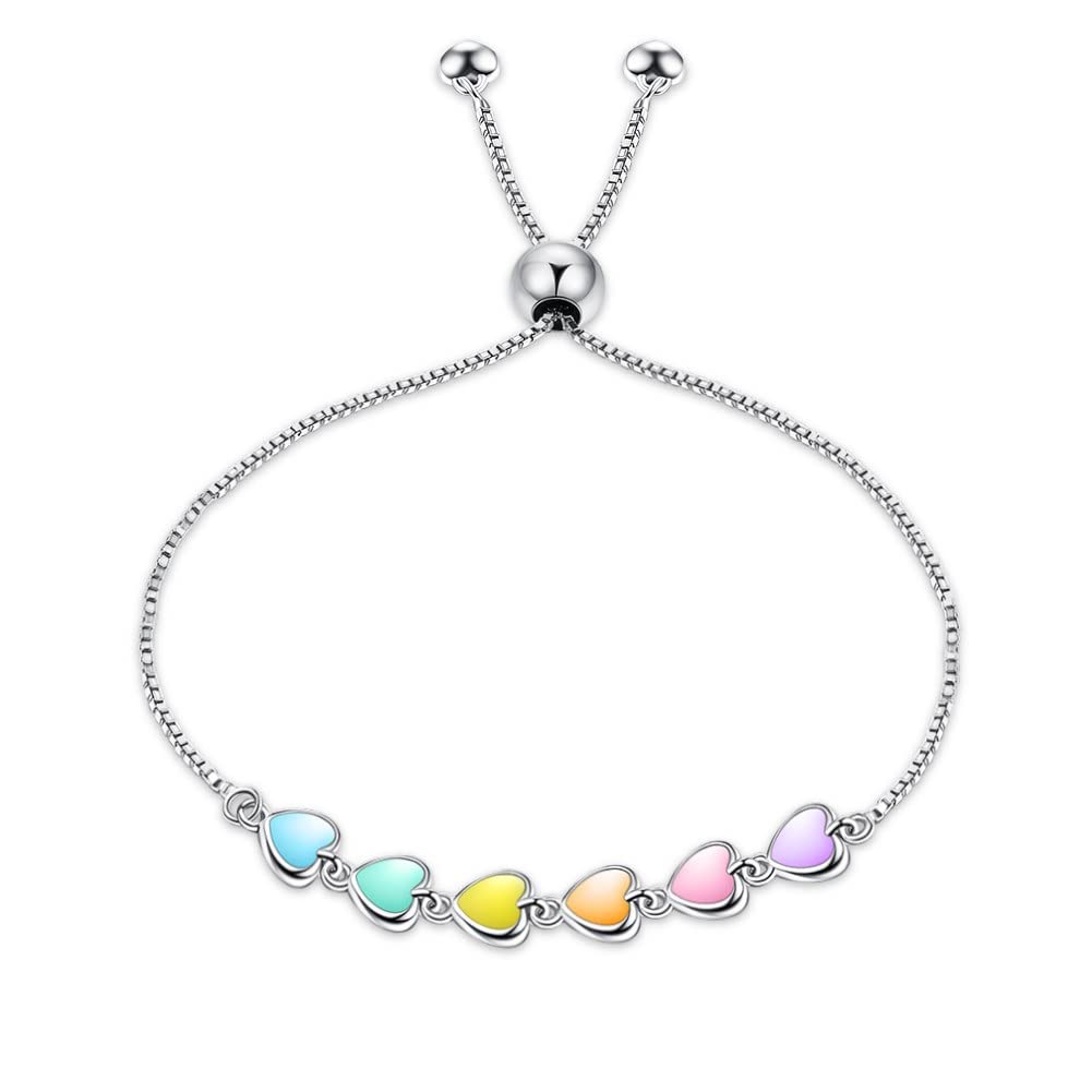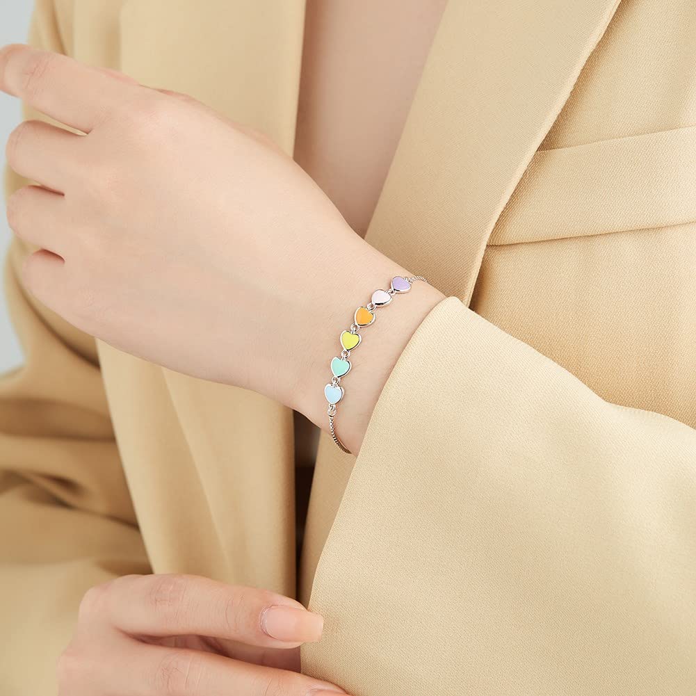 Rockyu が贈るレディースシルバーブレスレットは、カラフルなハートが並んだ遊び心あふれるデザインが魅力的。純銀製の輝きにパステルカラーのハートが映え、手元を華やかに彩ります。ベネチアンチェーンを採用し、長さを自由に調整できるので、誰でもぴったりのフィット感で楽しめます。
