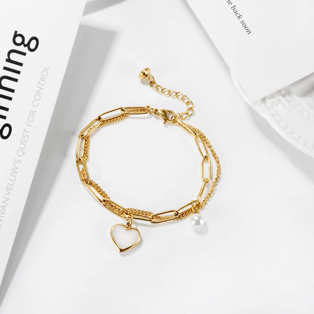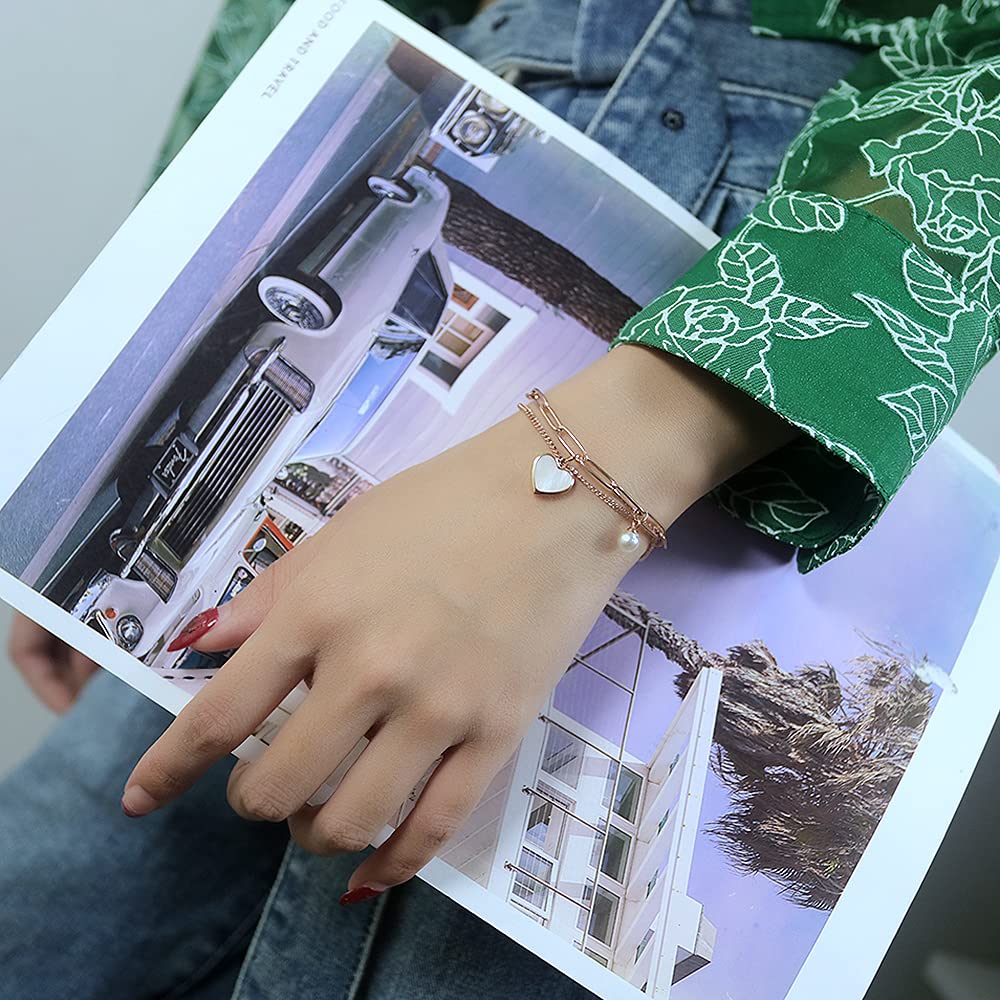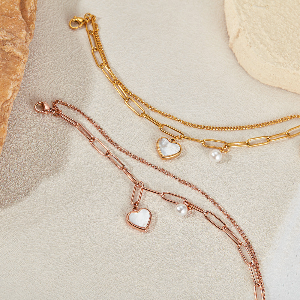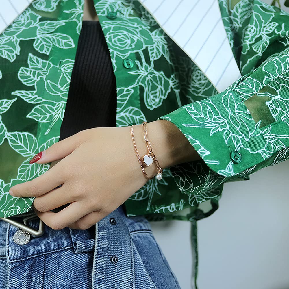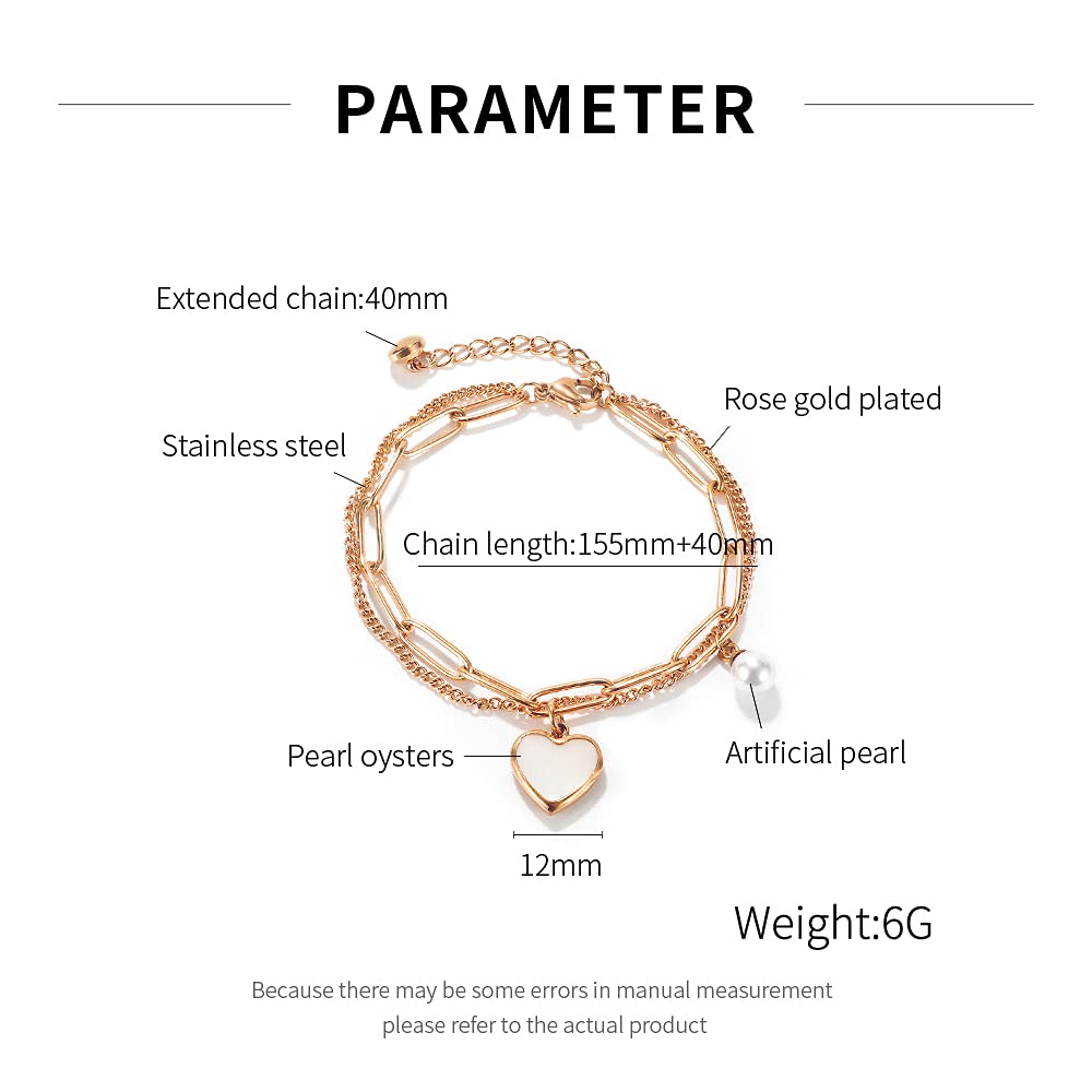 Rockyu ブレスレット レディース 二連チェーン ハート&パールモチーフ チタン製