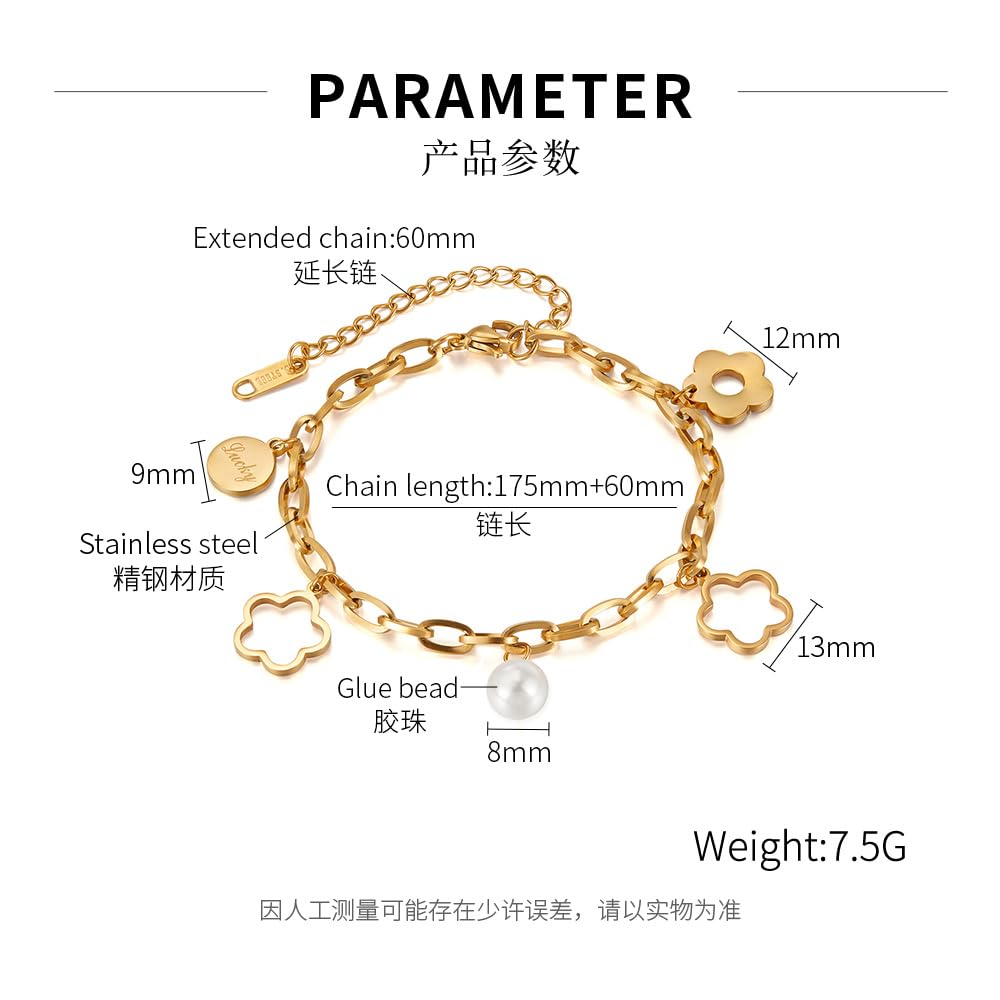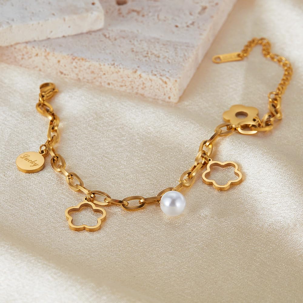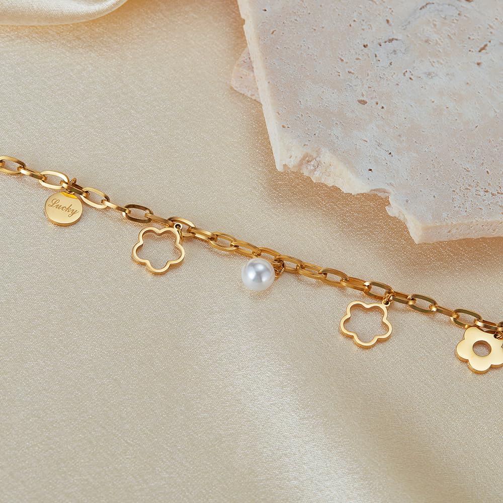 ブレスレット レディース ステンレス製 花モチーフ 18Kゴールド仕上げ パールチャーム付き