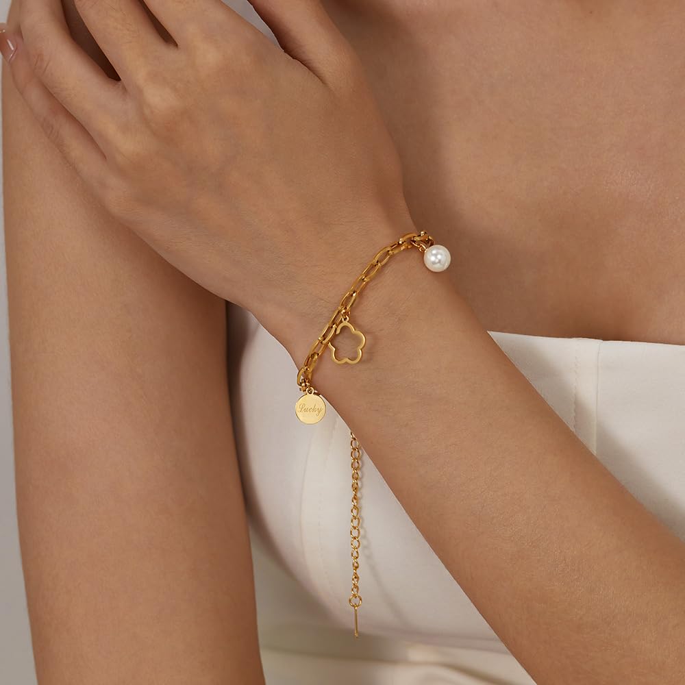 このレディースブレスレットは、ステンレス製に18Kゴールド仕上げを施し、上品な輝きと高い耐久性を両立したデザインです。可愛らしい花モチーフチャームと、直径8mmのパールチャームが揺れ動き、手元にフェミニンで華やかな印象をプラス。チェーン長さは175mm+60mmの延長チェーン付きで、手首のサイズに合わせて調整可能。金属アレルギーにも配慮した素材を使用し、普段使いから特別な日まで幅広く活躍します。誕生日やクリスマスなど、大切な人へのギフトにもぴったりのアイテムです。