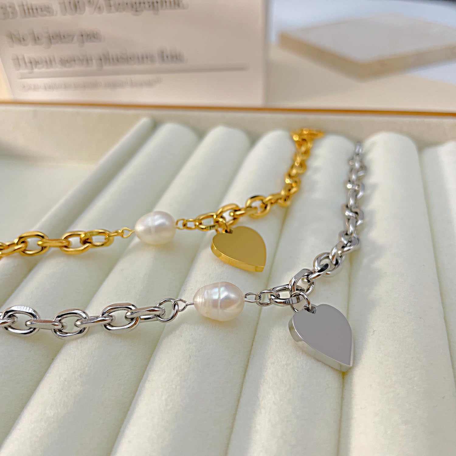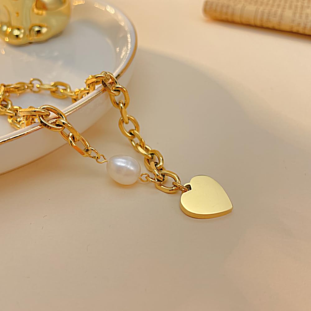 Rockyu のハートブレスレットは、女性らしさと遊び心を絶妙に融合させた大人かわいいアクセサリー。存在感のあるあずきチェーンに、愛らしいハートチャームと上品な人工パールをあしらい、手元を華やかに彩ります。