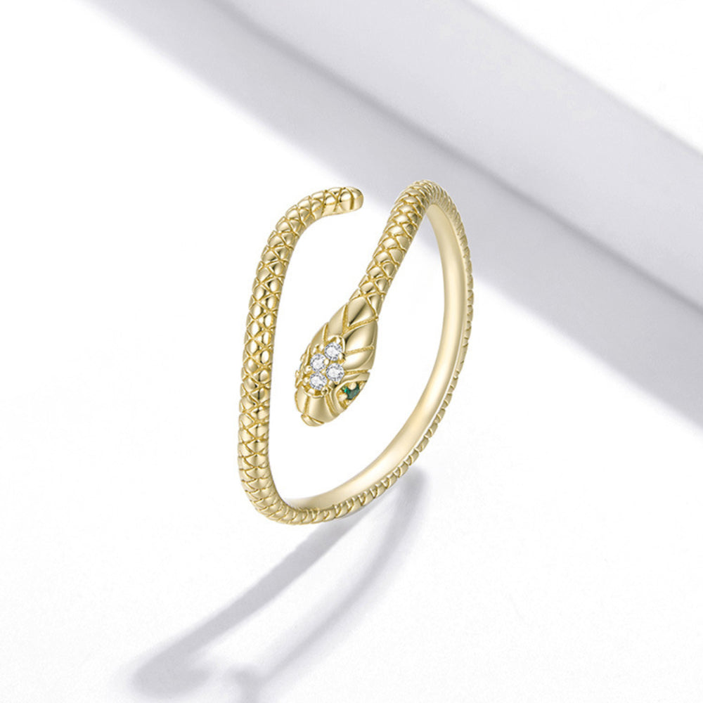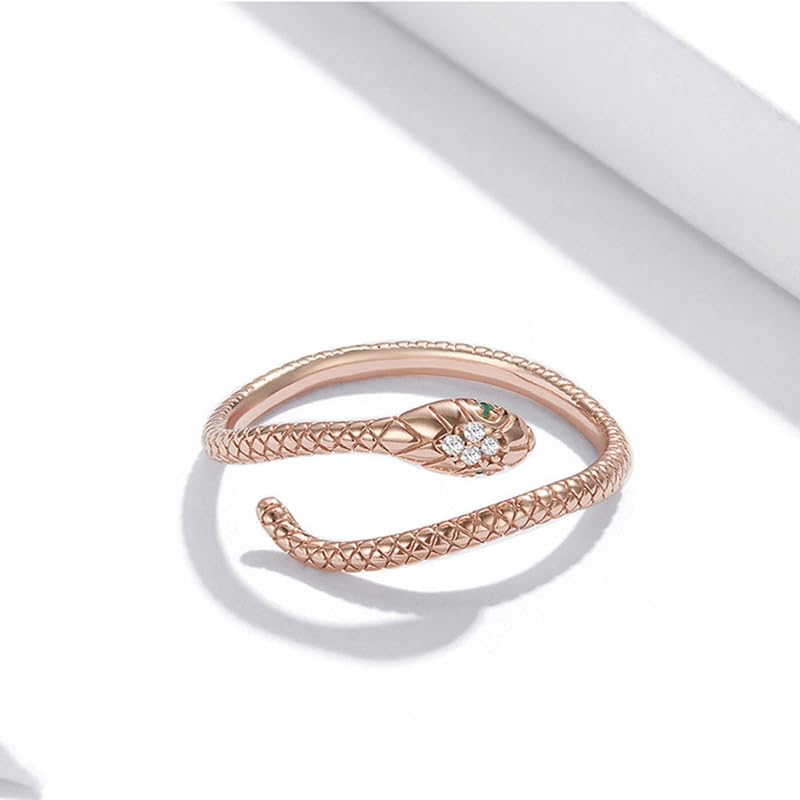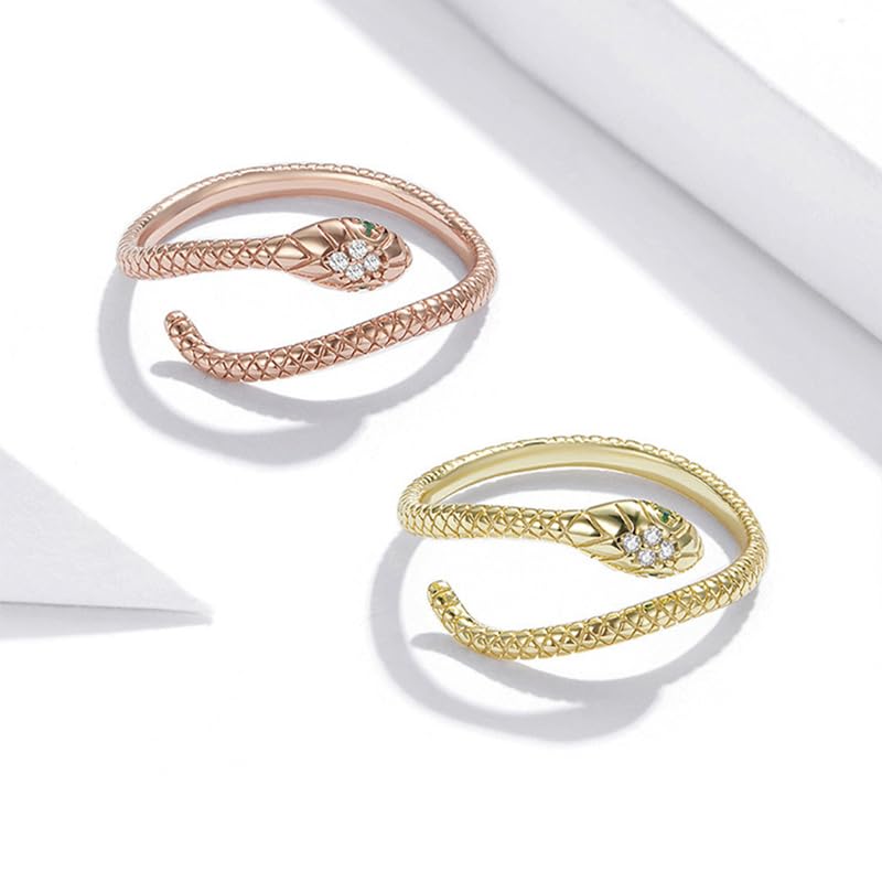 Rockyuから登場した、ミステリアスな輝きを放つスネークリング。しなやかに指に巻き付く蛇モチーフは、知恵・守護・魅力を象徴し、着ける人の個性をさりげなく引き立てます。シルバー925の上質な質感に、ブラック・シルバー・18金ゴールド・ローズゴールドの4色展開。目元にはグリーンのエメラルド風ストーンがきらりと光り、視線を釘付けにします。フリーサイズ仕様で指のサイズに合わせやすく、金属アレルギー対応だから敏感肌の方も安心。日常のコーデにスパイスを加えるもよし、特別な日のアクセントにするもよし。Rockyuのスネークリングで、あなたの指先に小さな魔法を。