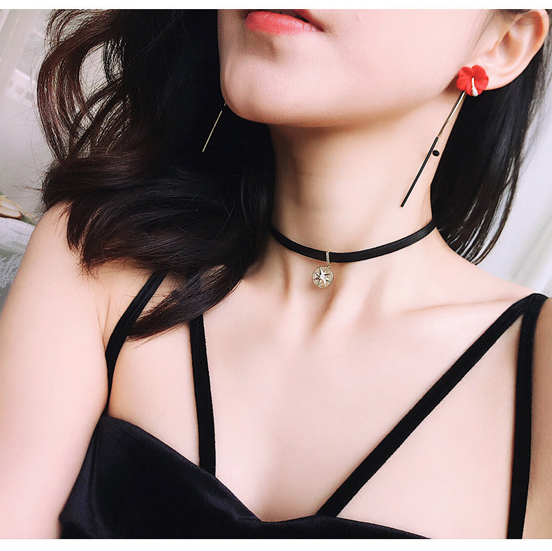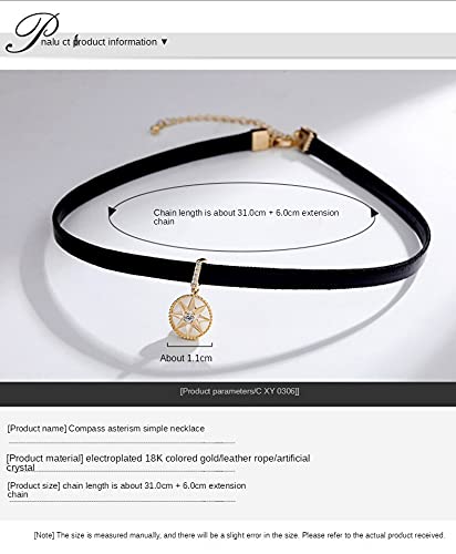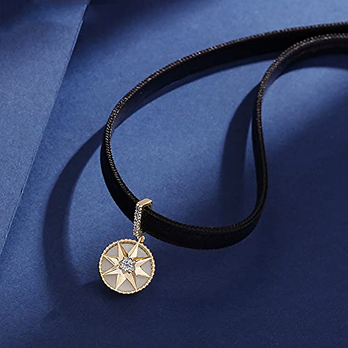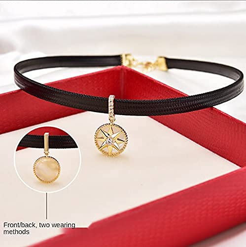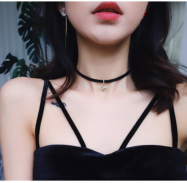 夜空にきらめく星を首元に閉じ込めたような、Rockyu の黒レザーチョーカー。コンパスのような星モチーフにクリスタルジルコニアが輝き、視線を惹きつけるアクセントを放ちます。シンプルなブラックレザーと繊細なゴールド装飾の組み合わせは、大人の女性の魅力を引き立てながら、ほんのり神秘的な雰囲気もプラス。