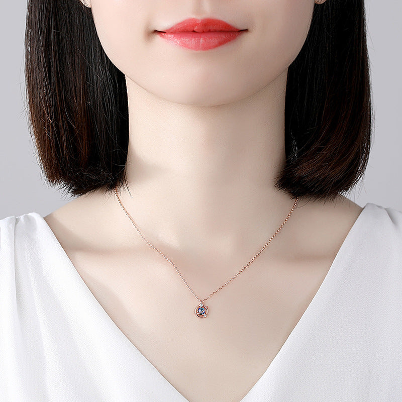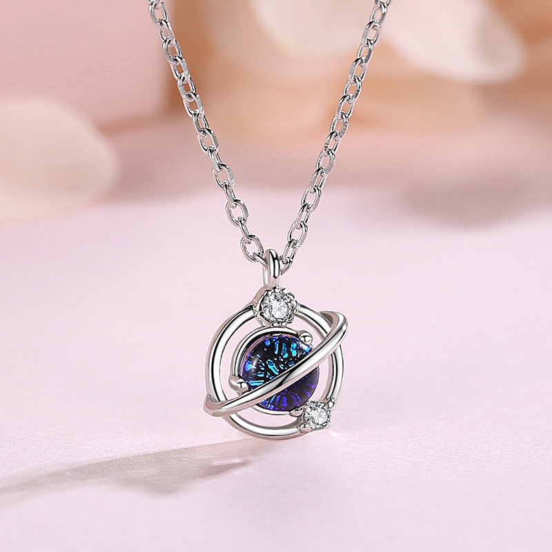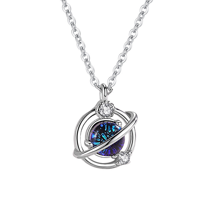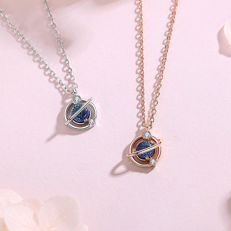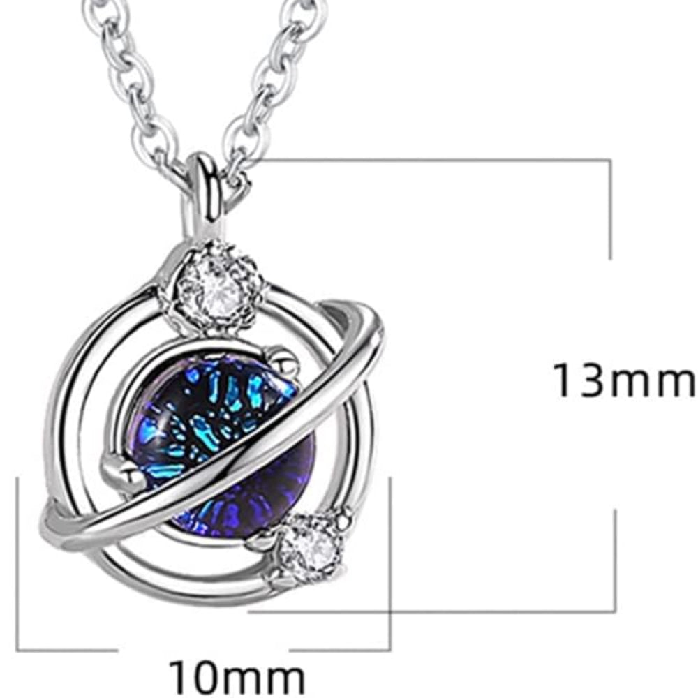 Rockyuの惑星モチーフネックレスは、星と月の煌めきを閉じ込めたような、土星風ペンダントが特徴のフェミニンで幻想的なデザイン。中心には幻想的に輝くブルーのラメ入りガラスストーンを配し、リングのように囲むメタルラインとキュービックジルコニアがアクセントを加えます。
