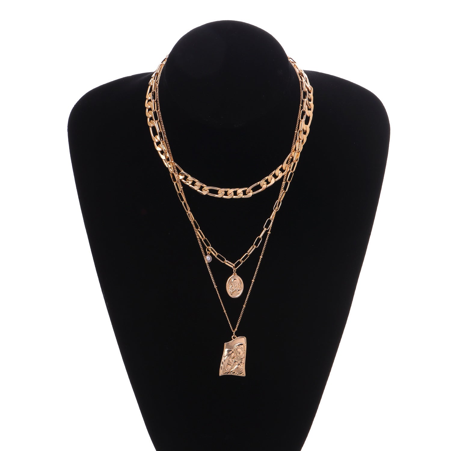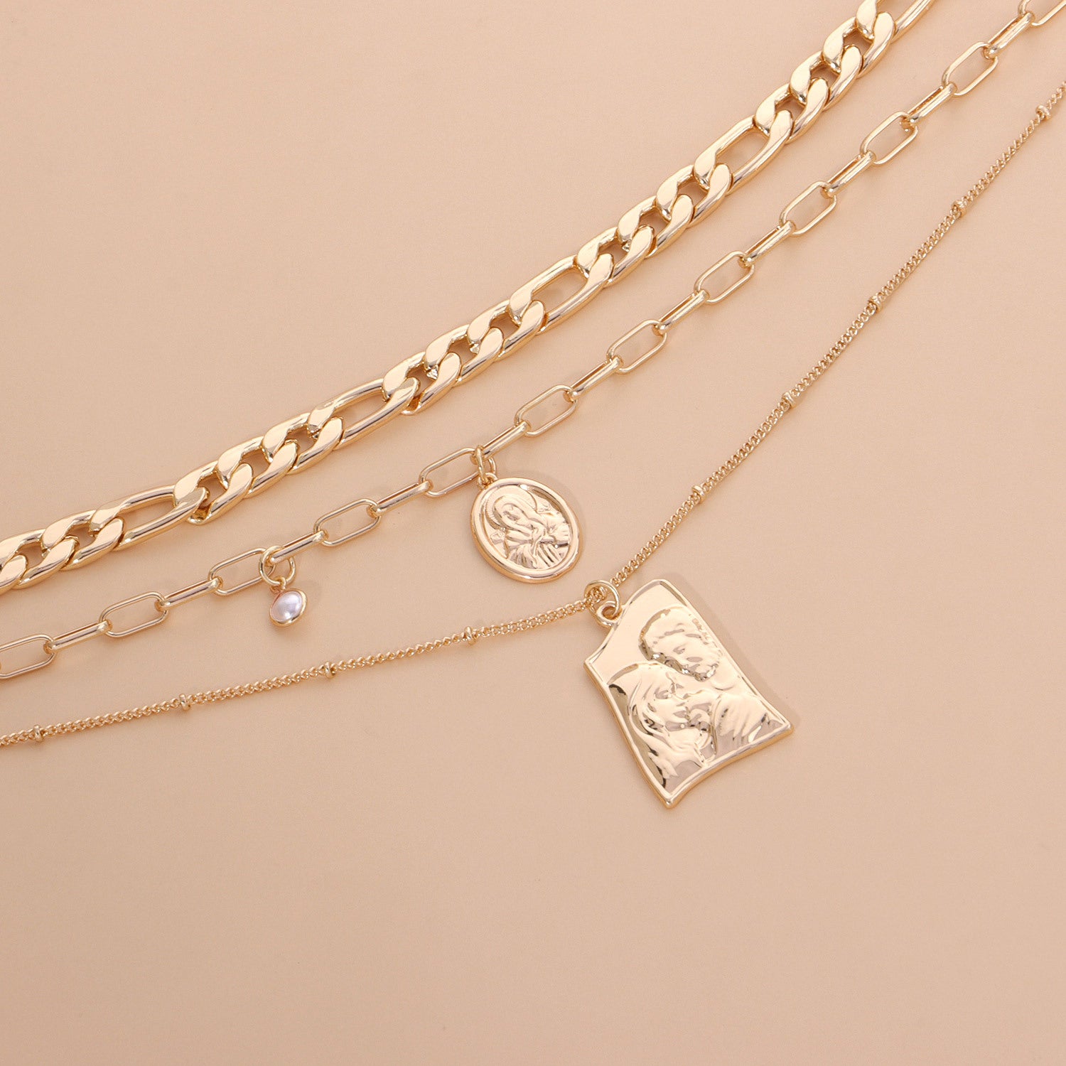 Rockyu レディースネックレス 3連チェーン 仏像ペンダント ゴールド 18金メッキ