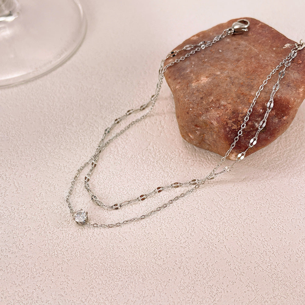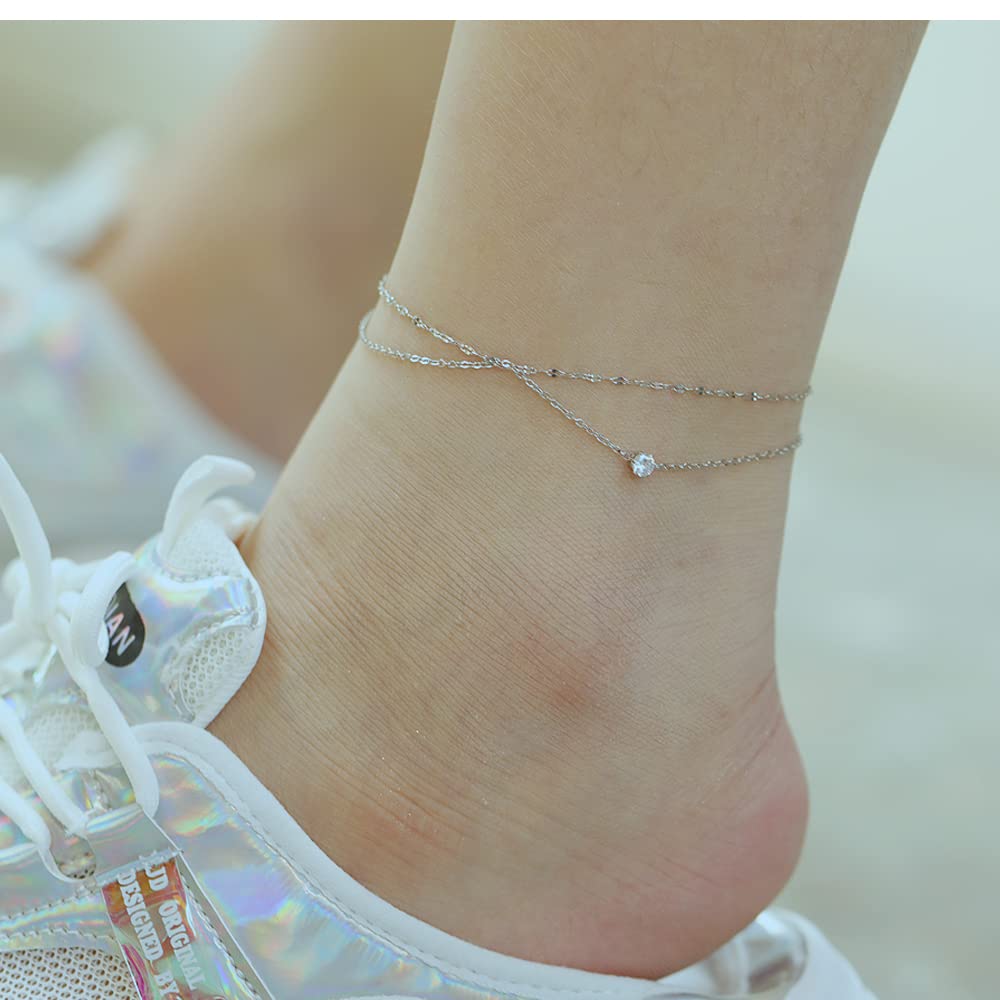 Rockyuが贈る、足元に優雅な存在感を与える華奢デザインのアンクレット。光を受けてきらりと反射する繊細なチェーンが2本重なり、絶妙な立体感ときらめきを生み出します。中央に輝くジルコニアが、シンプルながらも洗練された印象をプラスし、まるで宝石を纏っているかのような足元を演出します。