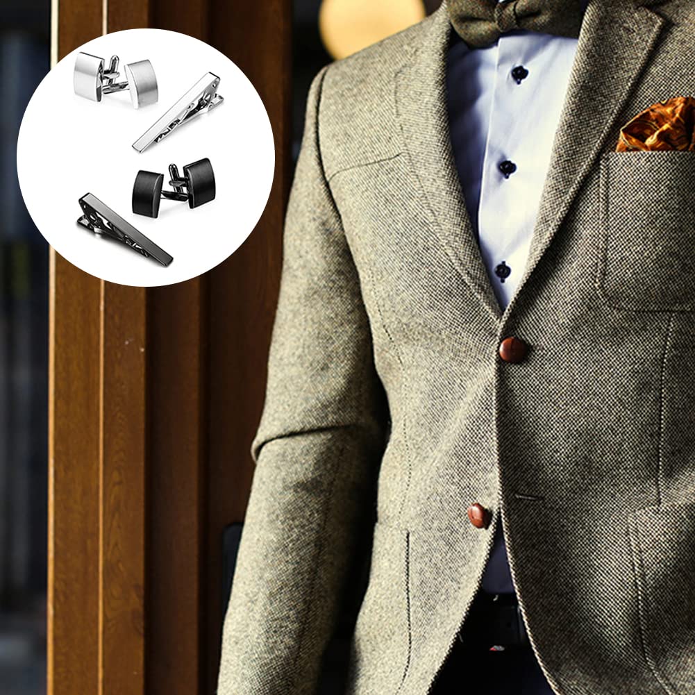 Rockyuの艶消しカフス&タイピンセットは、無駄を削ぎ落としたモダンデザインで、シャツやネクタイに確かな存在感と洗練を添えるメンズアクセサリーの完成形。スタイリッシュな長方形タイピンと、程よいボリューム感のあるカーブデザインのカフスがセットで、フォーマルからビジネスまで幅広く対応します。