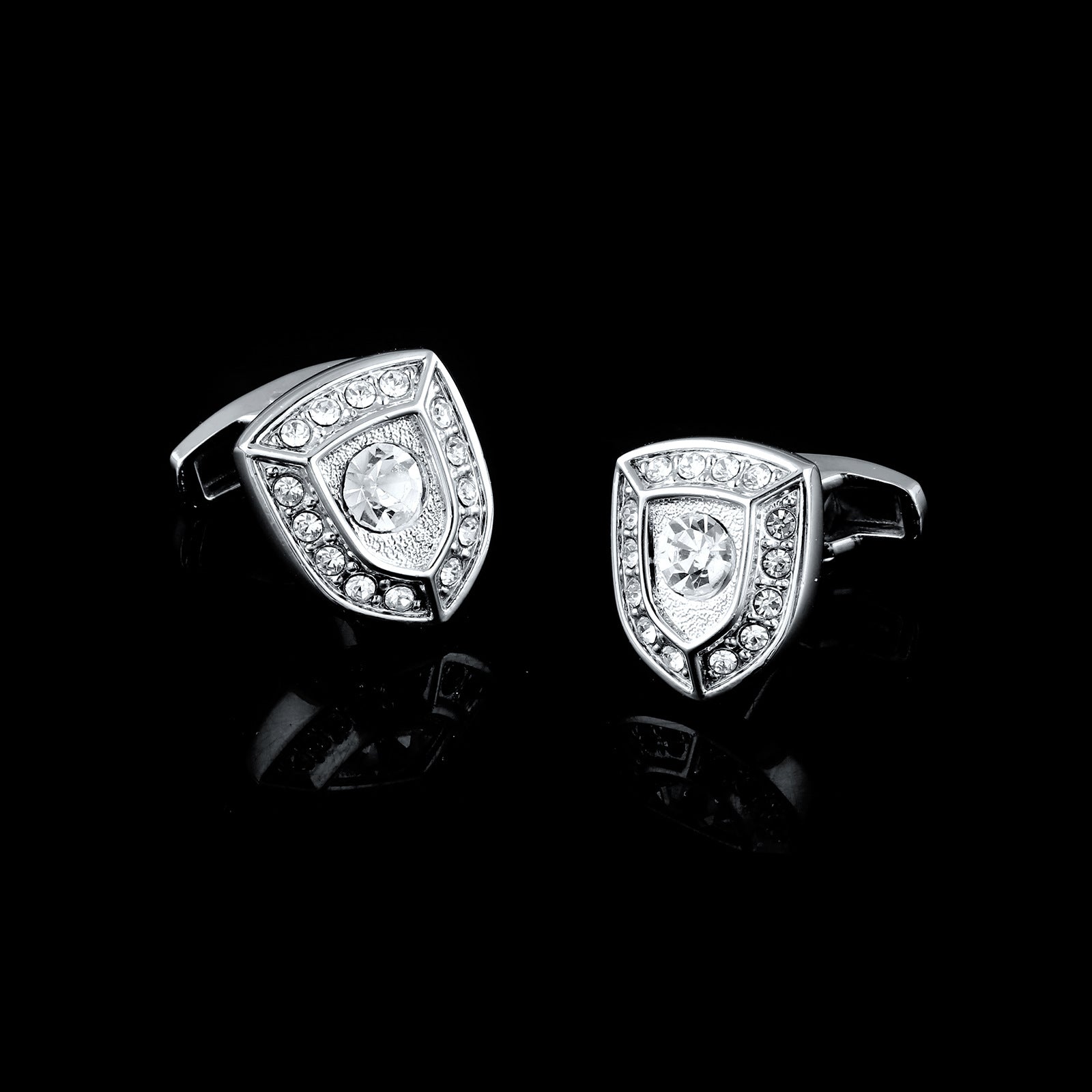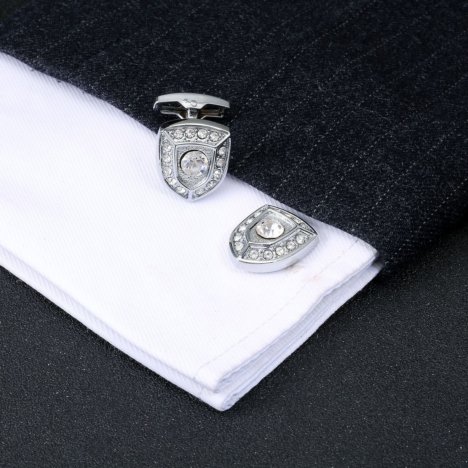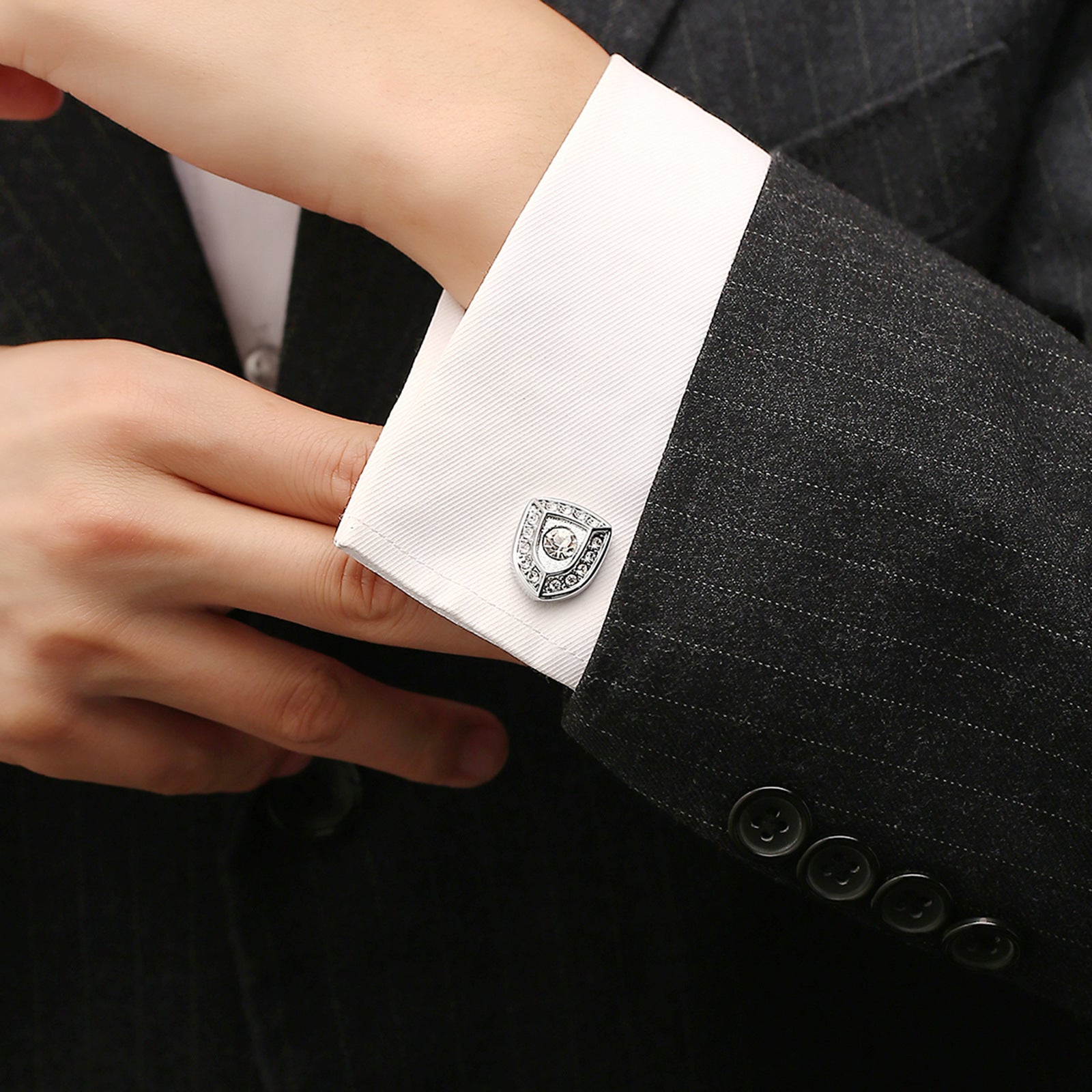 シンプルなスーツ姿に「あと一歩の個性」を添えるのが、Rockyuの盾型ジルコニアカフス。中央に輝くジルコニアを囲むように配置されたクリスタルが、まるで盾のように存在感を放ち、紳士の手元をさりげなく格上げします。