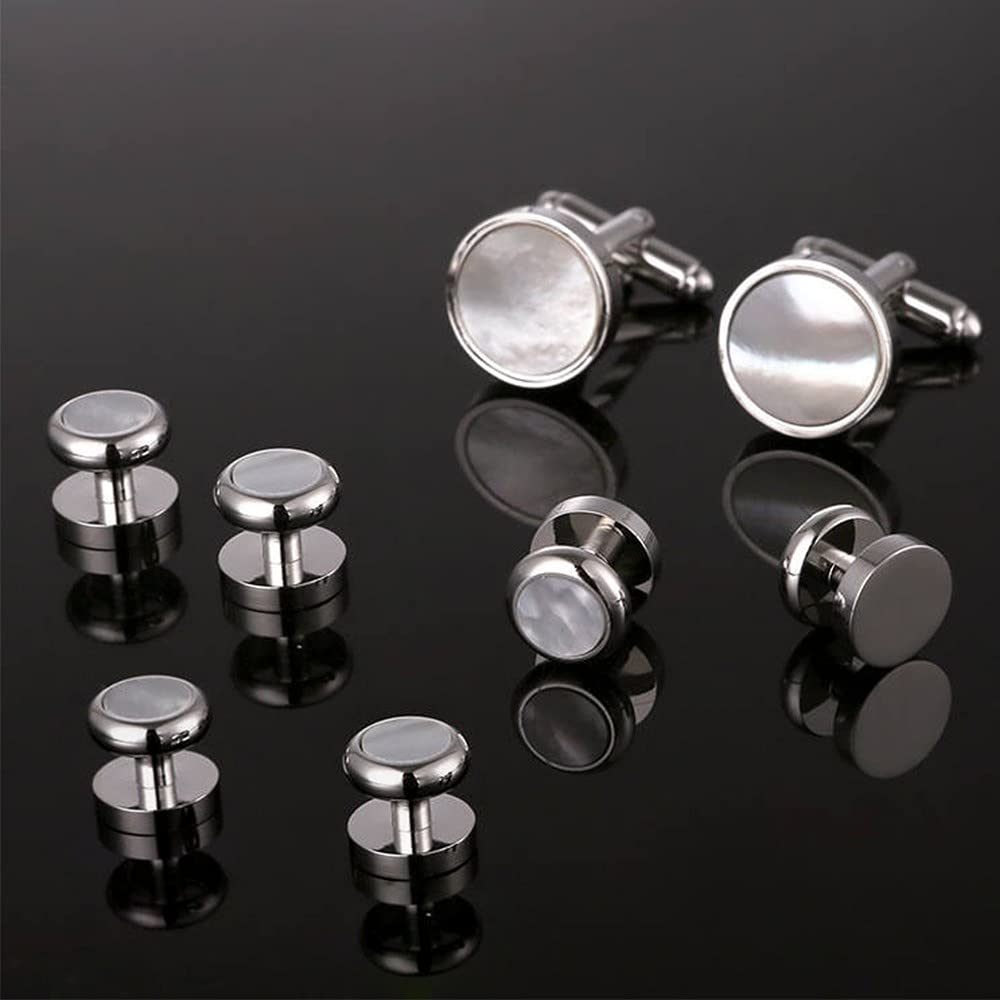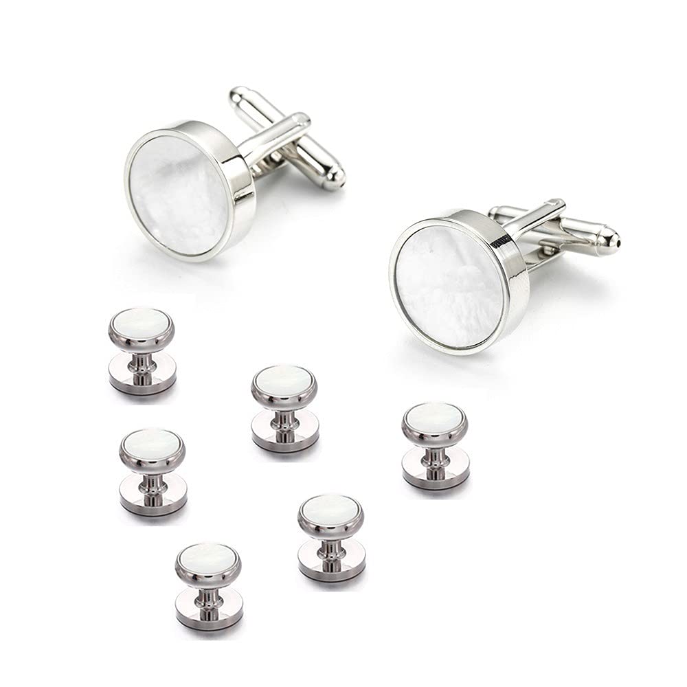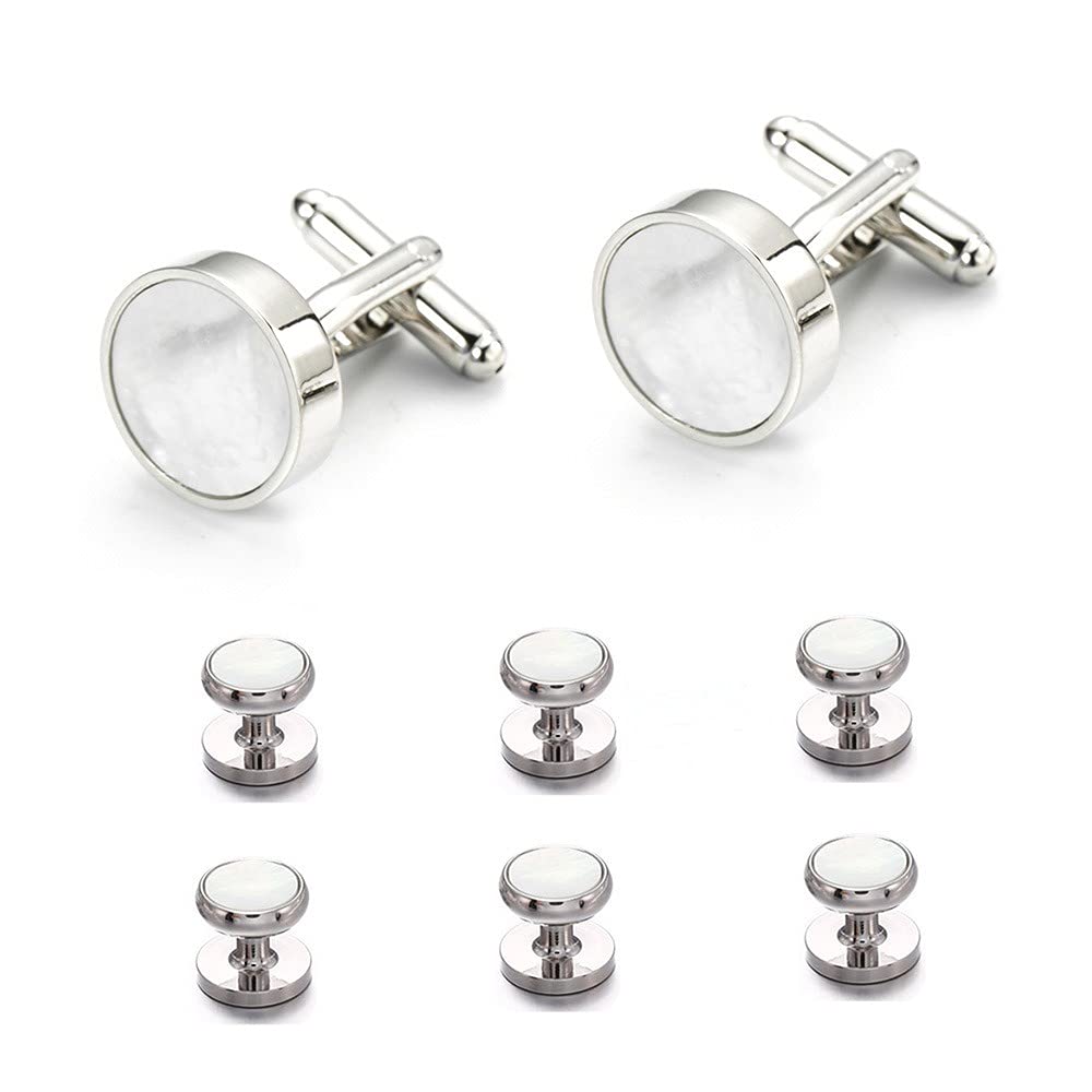 Rockyu カフス&スタッドセット 白蝶貝デザイン ラウンド型 シルバー仕上げ フォーマルアクセサリー