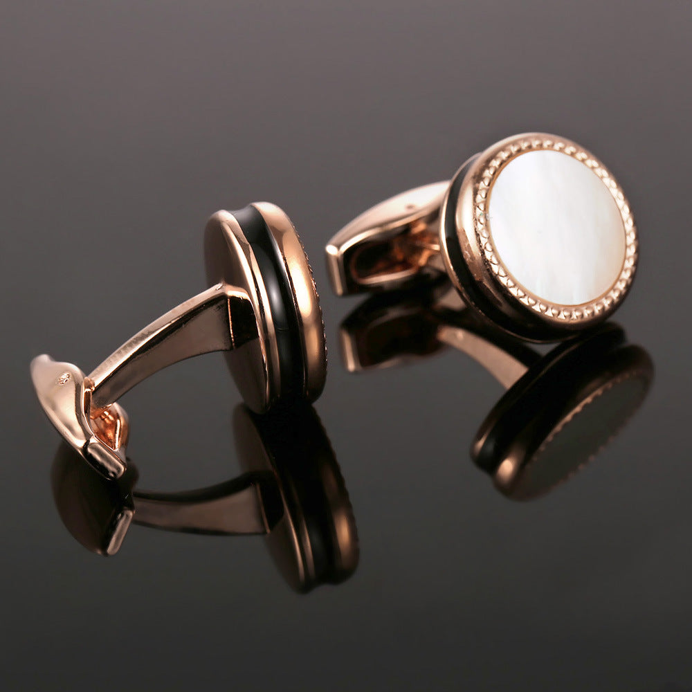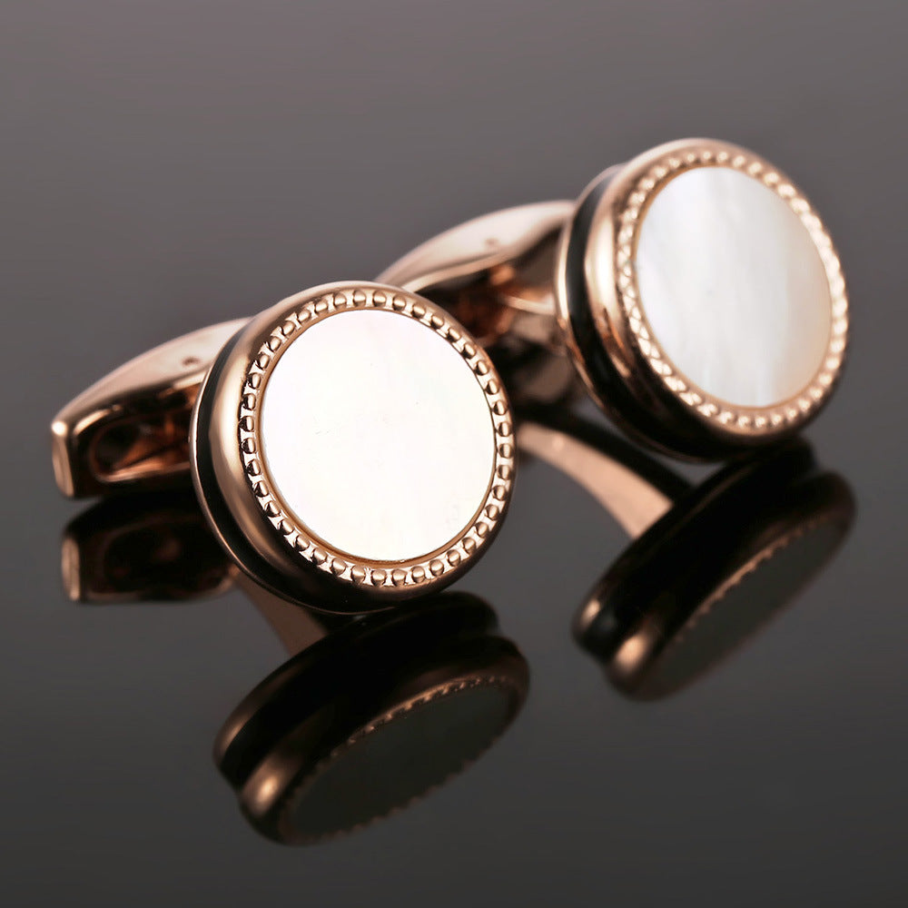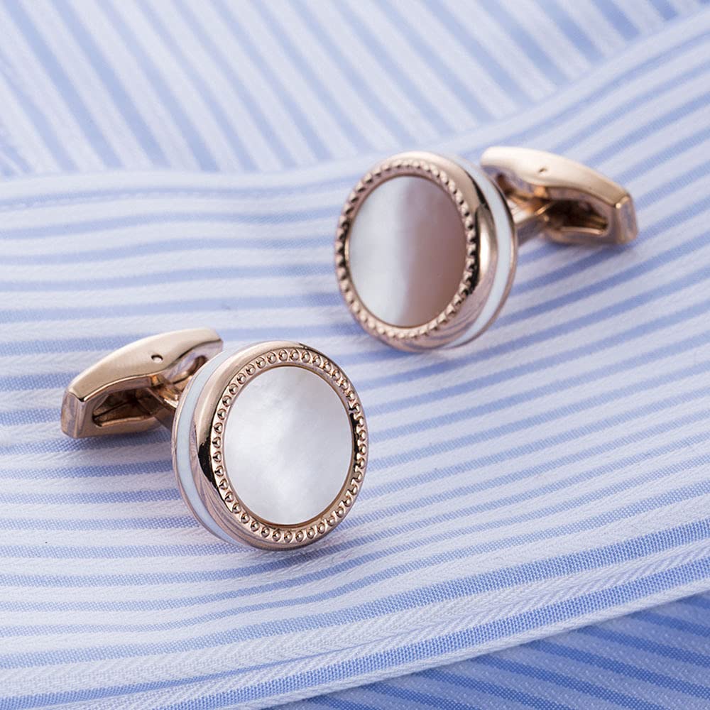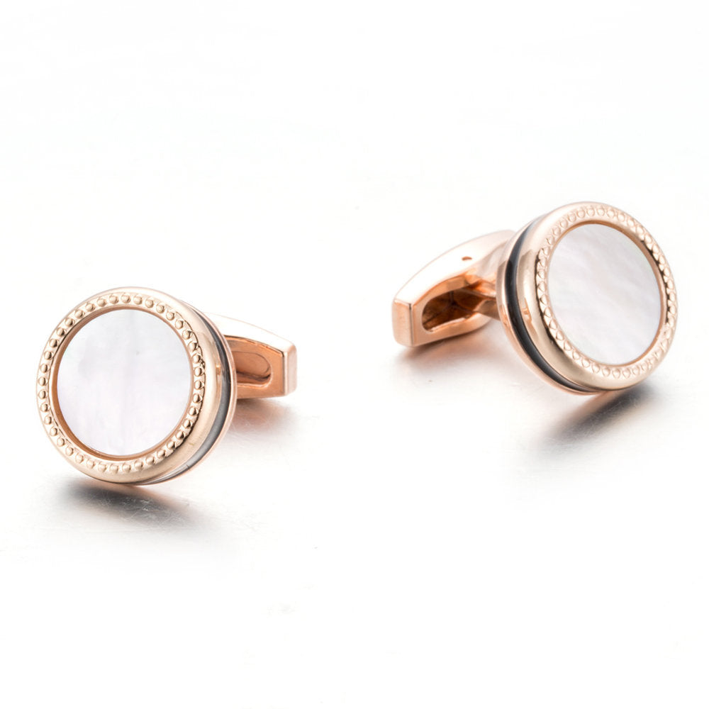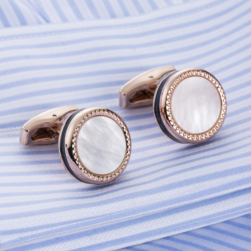 Rockyuが贈る、シンプルで上品な大人のための白蝶貝カフス。ピンクゴールドの艶やかなフレームに、白蝶貝の滑らかな光沢が映えるラウンドデザインは、フォーマルにもビジネスにも溶け込む万能アクセサリー。