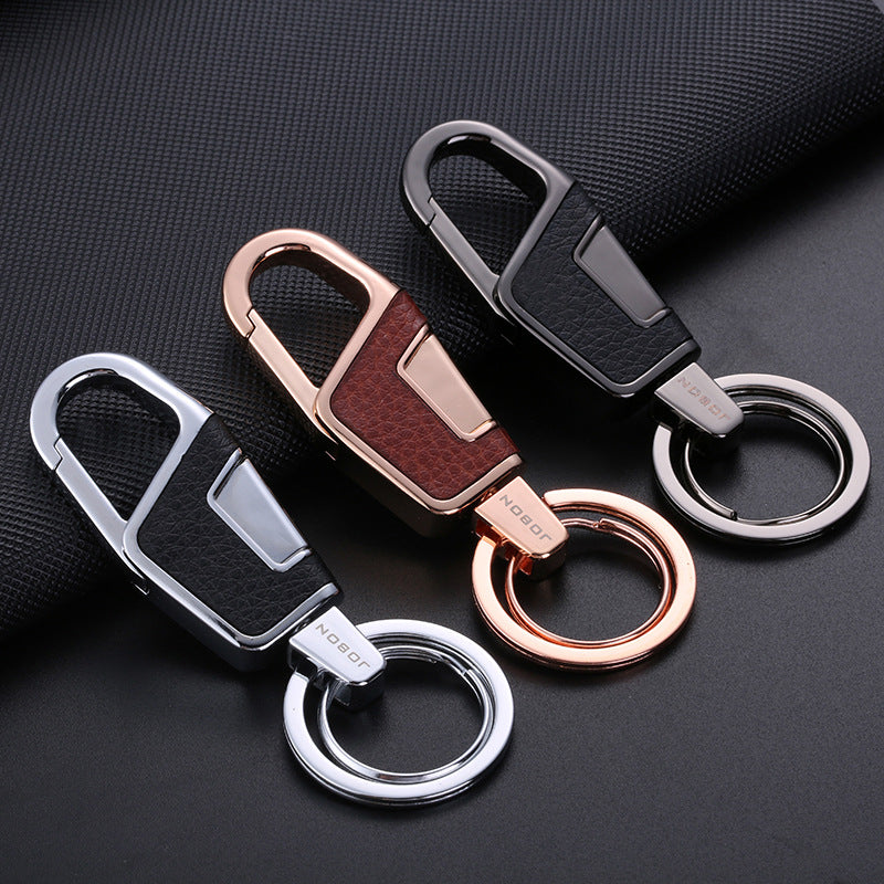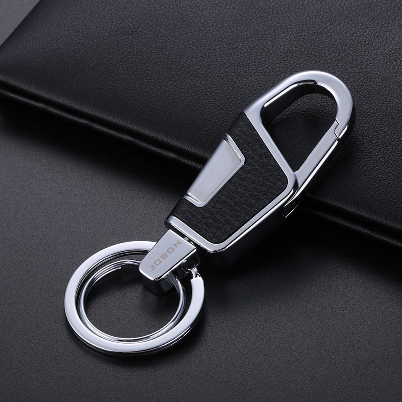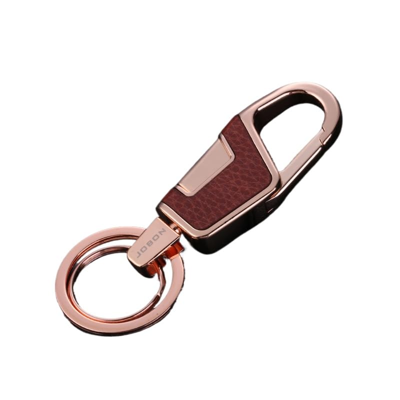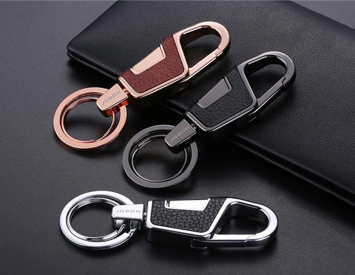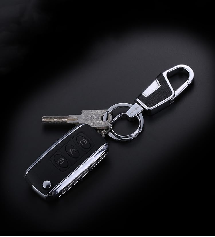 重厚感のある亜鉛合金ボディにレザー調デザインを組み合わせ、まるで高級車のキーを引き立てるような存在感を放ちます。シルバー、ブラック、ゴールドの3カラー展開で、男女問わず持ちやすく、ビジネスシーンからカジュアルまで幅広くマッチ。