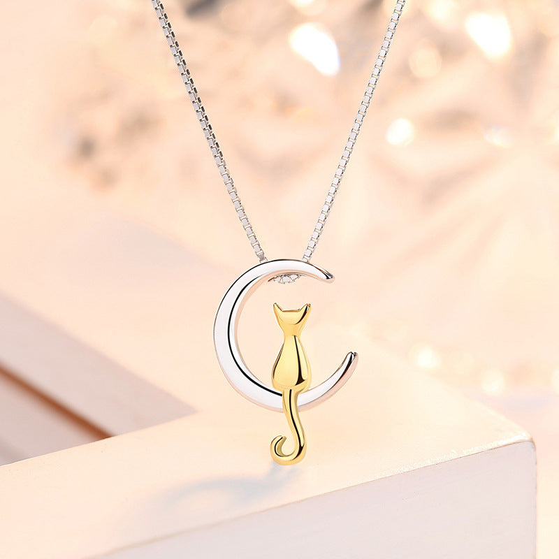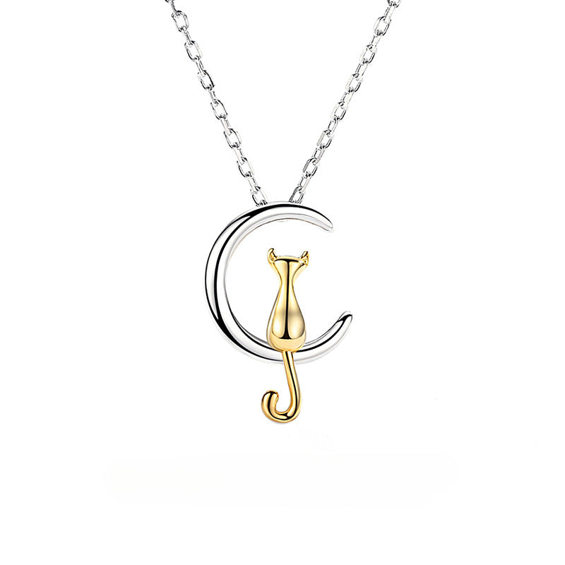 Rockyu 月と猫のネックレス レディース シルバー925 ゴールドアクセント ペンダント 40+5cm/45+5cm