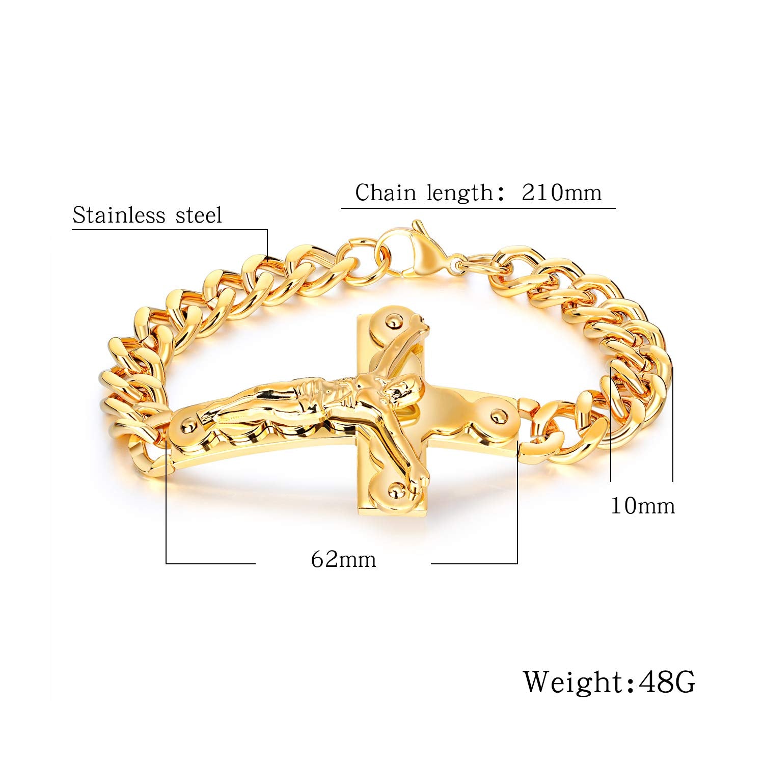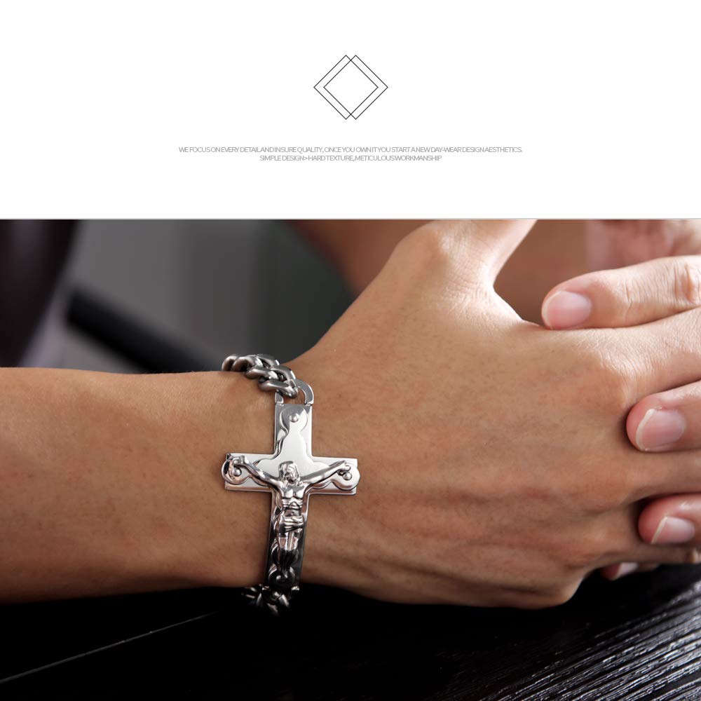 ステンレス素材を使用しており、耐久性と美しい光沢を両立。210mmのチェーン長と62mmのクロスサイズが、男性の手首にしっかりフィットしながらも圧倒的な存在感を演出します。重さ48gのずっしりとした着け心地は、まさに大人のアクセサリー。Rockyu ブレスレットは、シンプルなコーデに合わせても力強さをプラスし、パーティーやナイトシーンでも視線を集めるアイテムです。特別な日のギフトとしてもおすすめ。