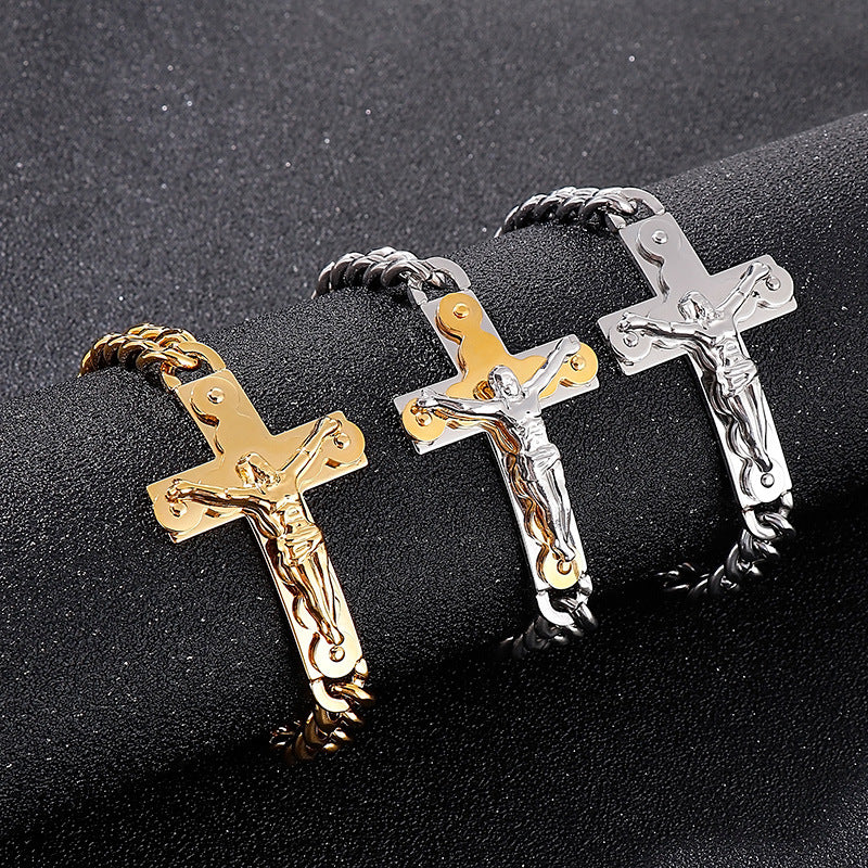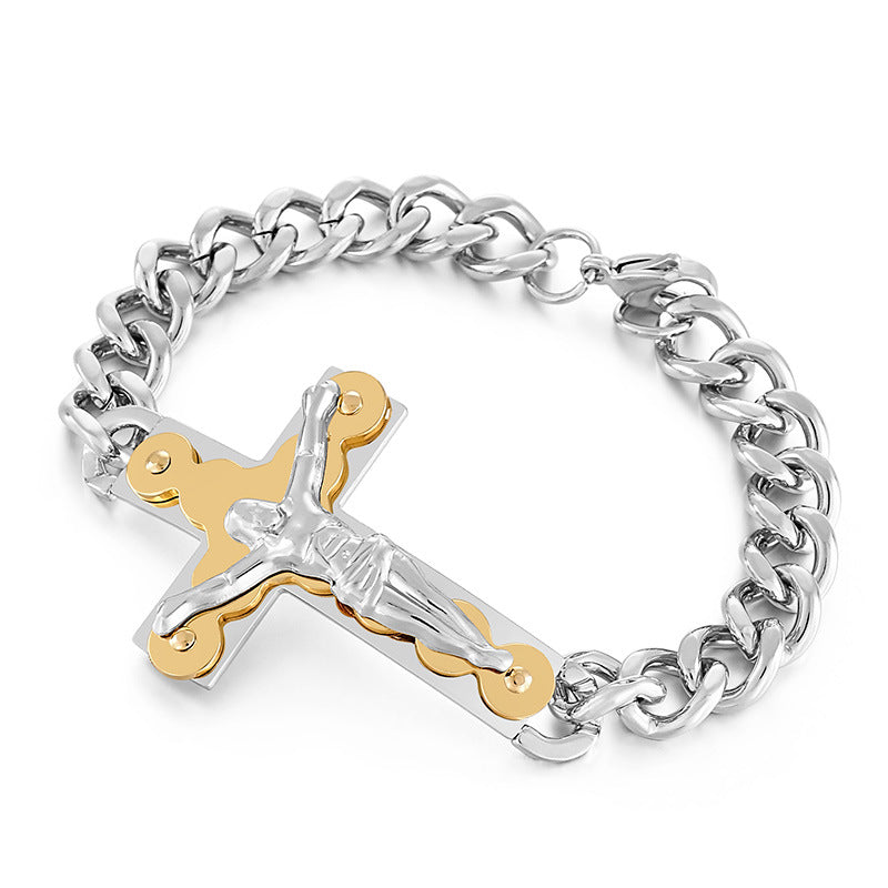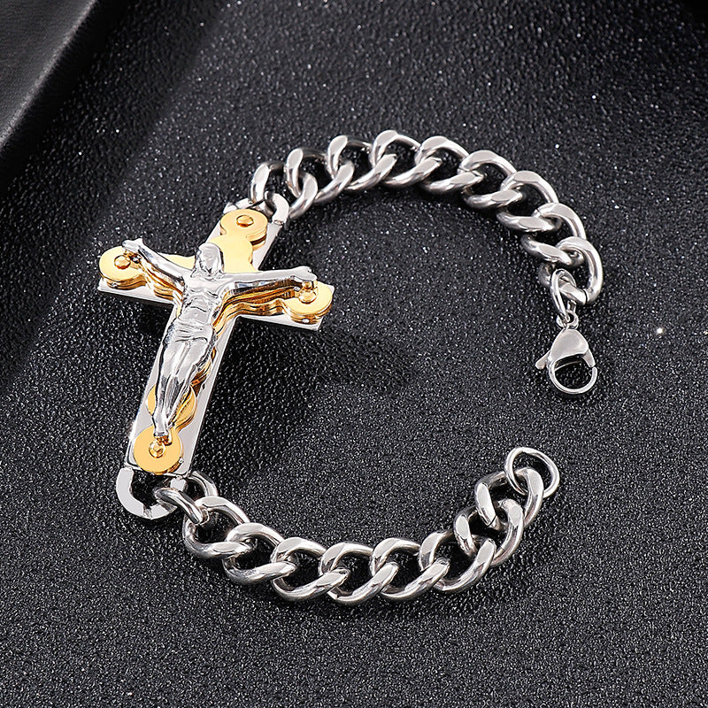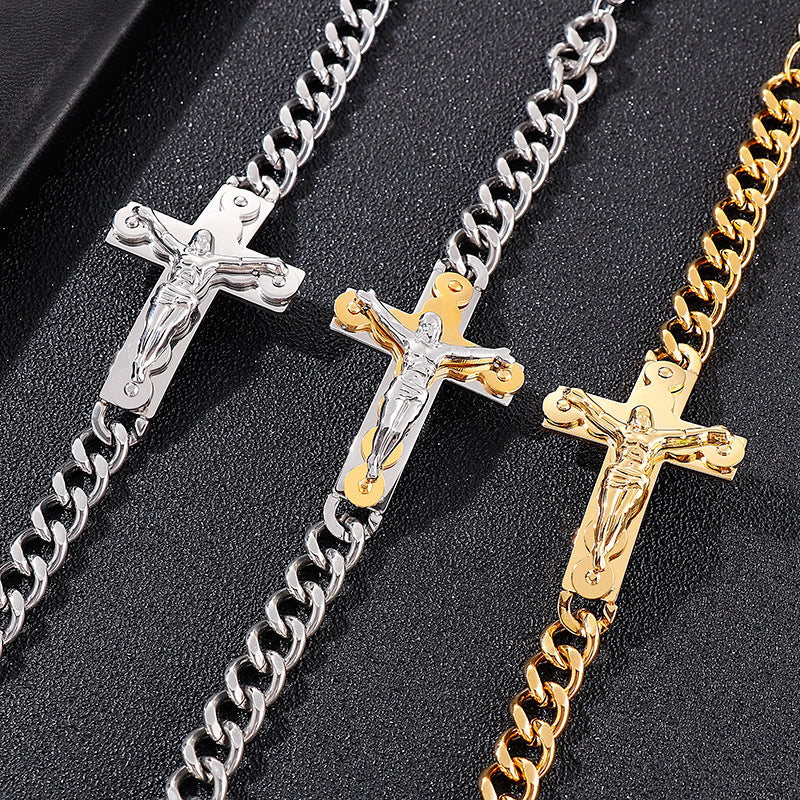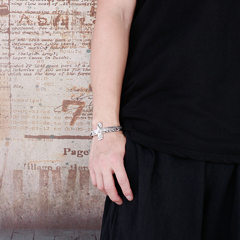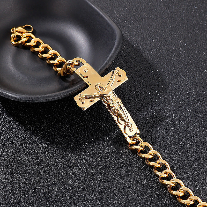 Rockyu が贈る、存在感抜群のクロスデザインブレスレット。重厚な喜平チェーンと立体的な十字架モチーフが組み合わさり、手首で強烈なインパクトを放ちます。ゴールドの艶やかな輝きがコーディネートを格上げし、シルバーとのカラー展開でシーンやスタイルに合わせて選べるのも魅力。