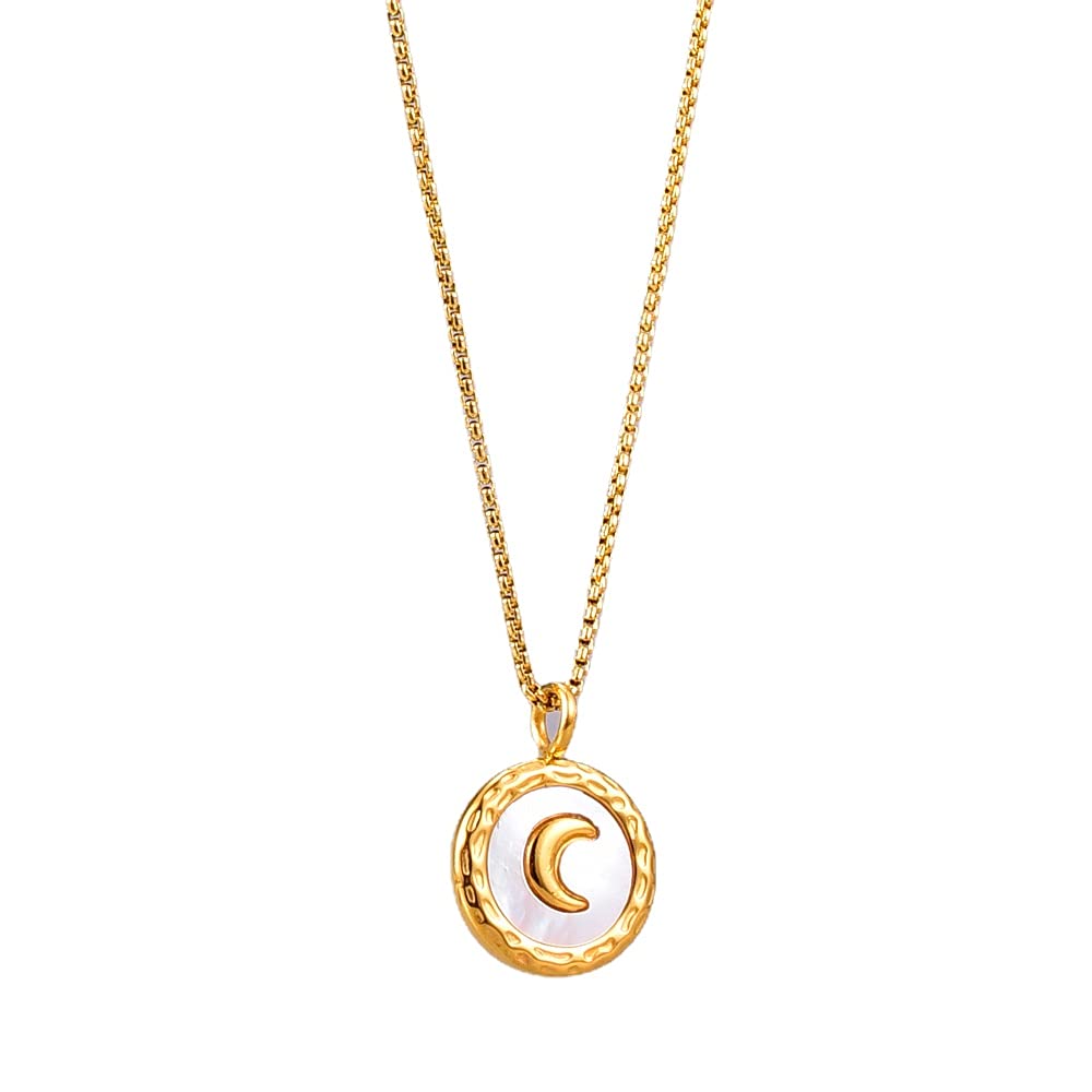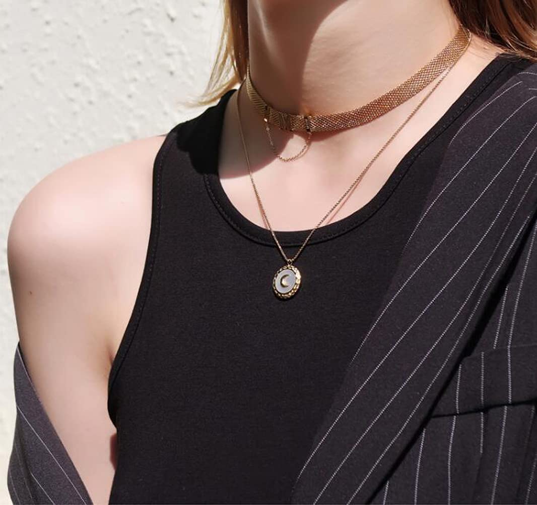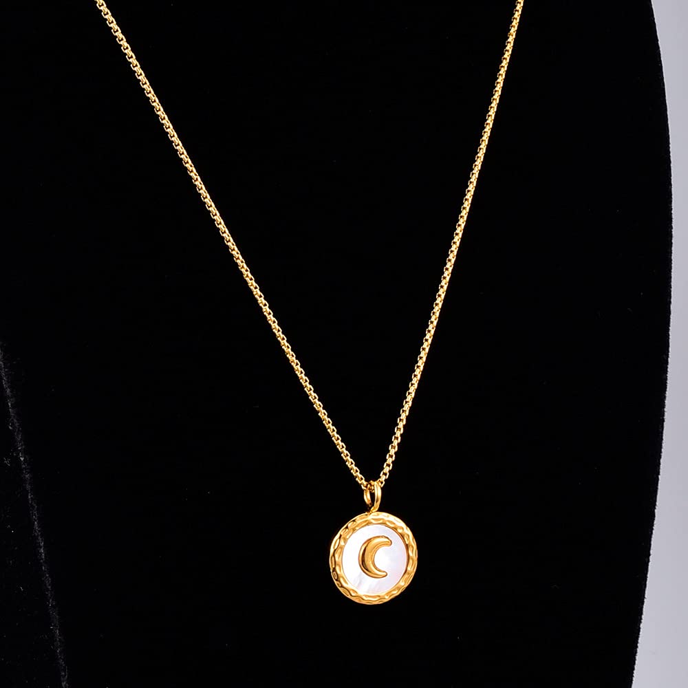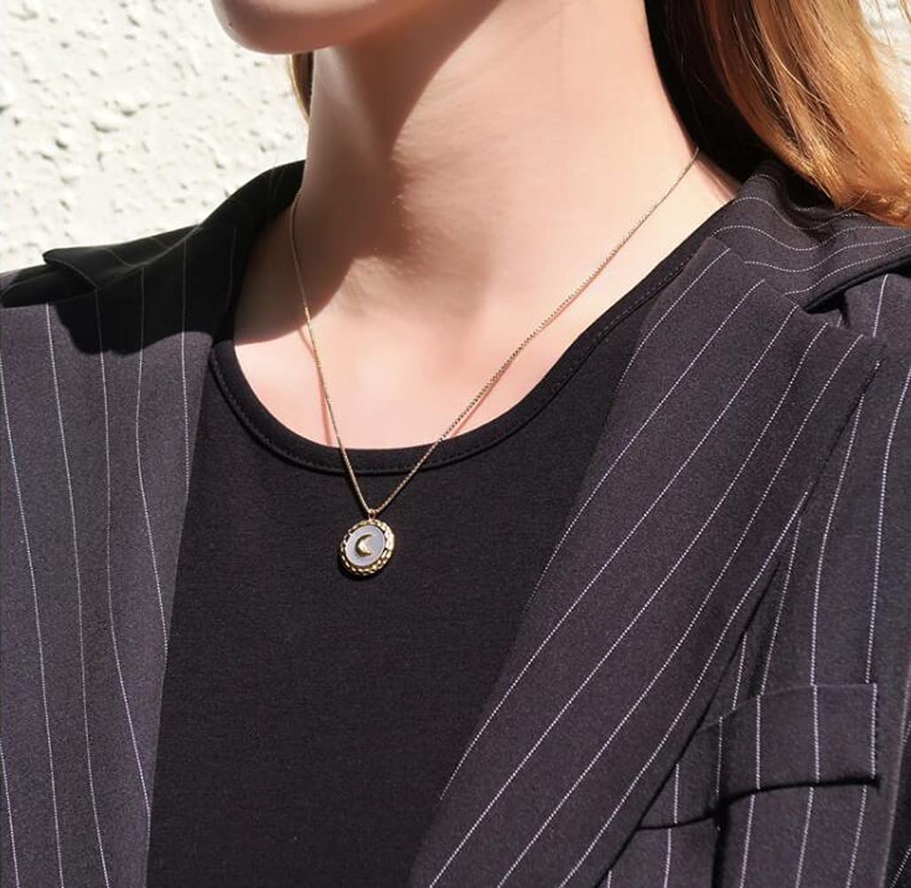 Rockyuの三日月ネックレスは、ゴールドフレームに浮かぶやさしい月のモチーフが特徴のロマンチックな一品。まるで星に願いをかけたような、女性らしい華やかさと優しさを演出します。