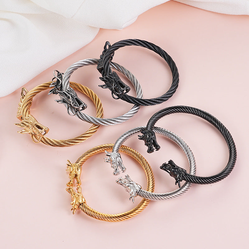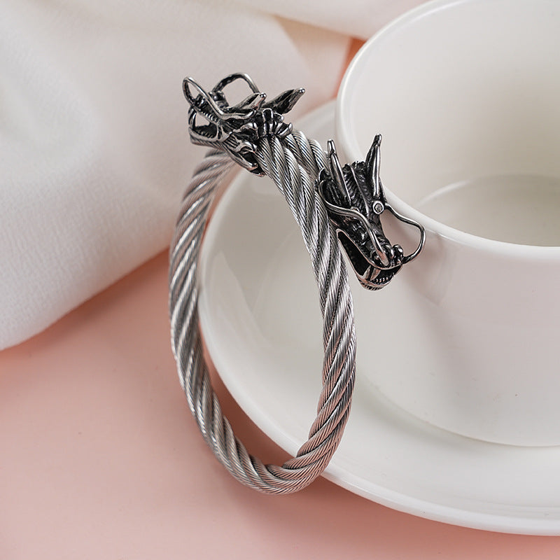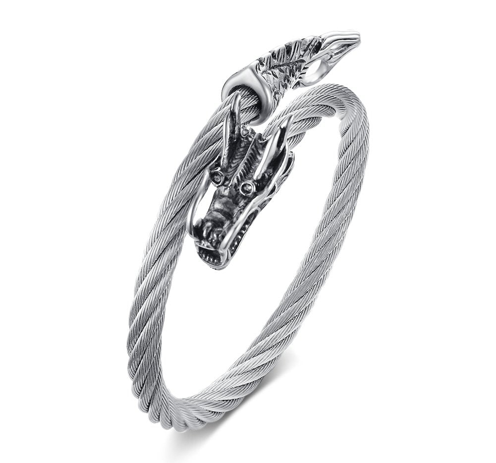 Rockyu ワイヤードラゴンバングル|メンズ向けシルバーステンレスブレスレット
