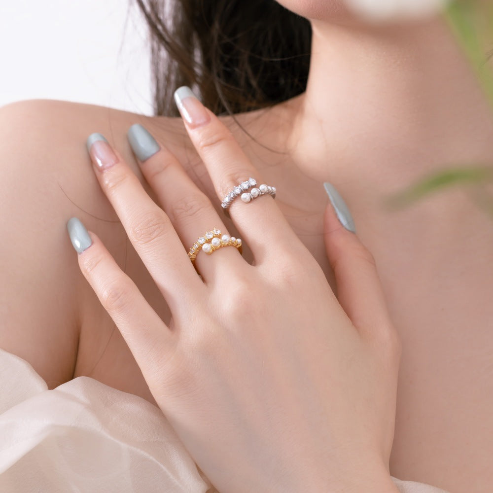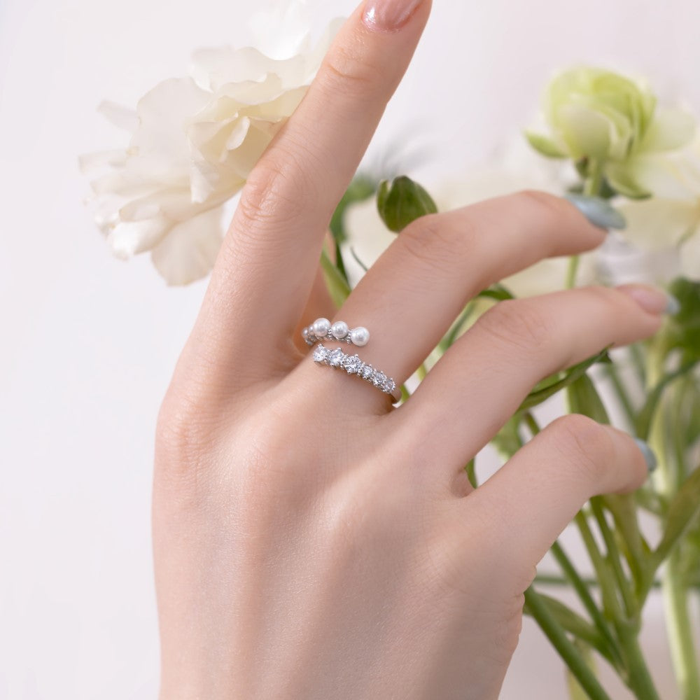 Rockyuから登場、指先でちょっとした魔法がかかるような、パールとストーンの絶妙バランスが光るフリーサイズリング。シンプルながら、目を引くデザインで、どんなスタイルにもすっと馴染みます。