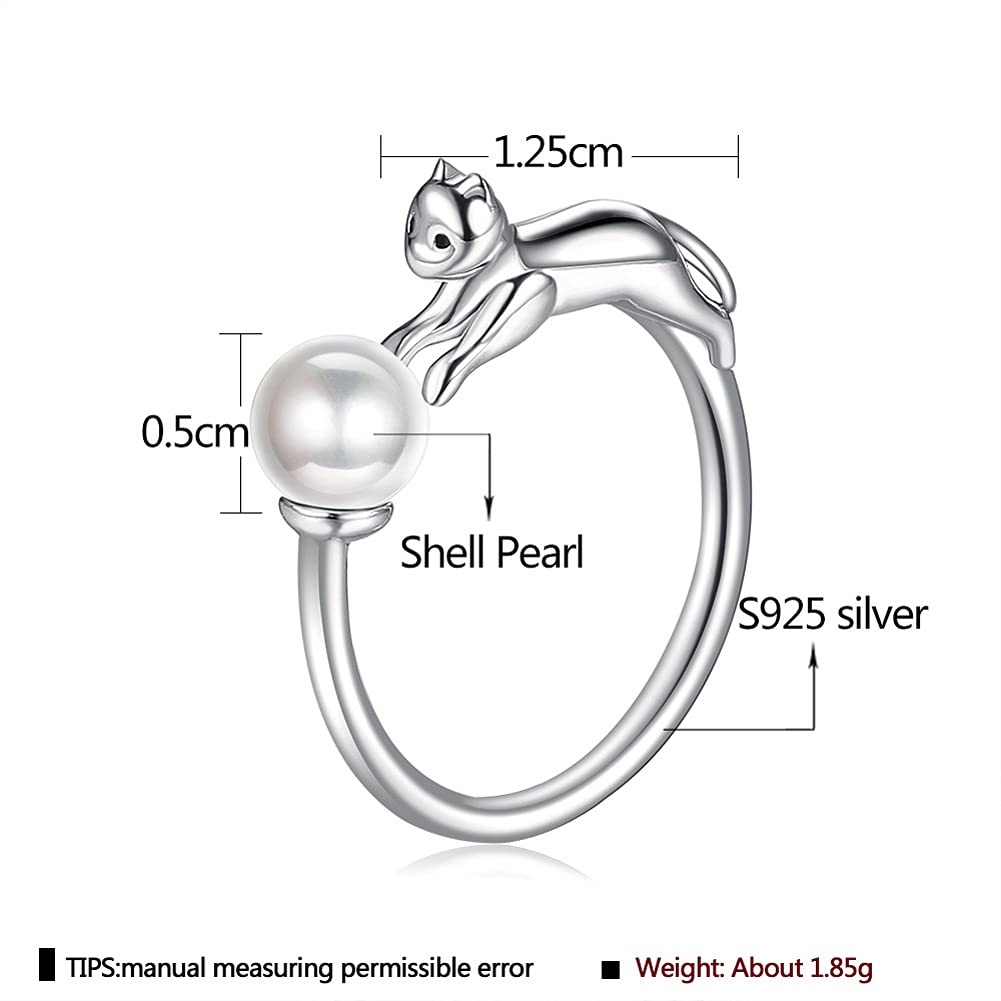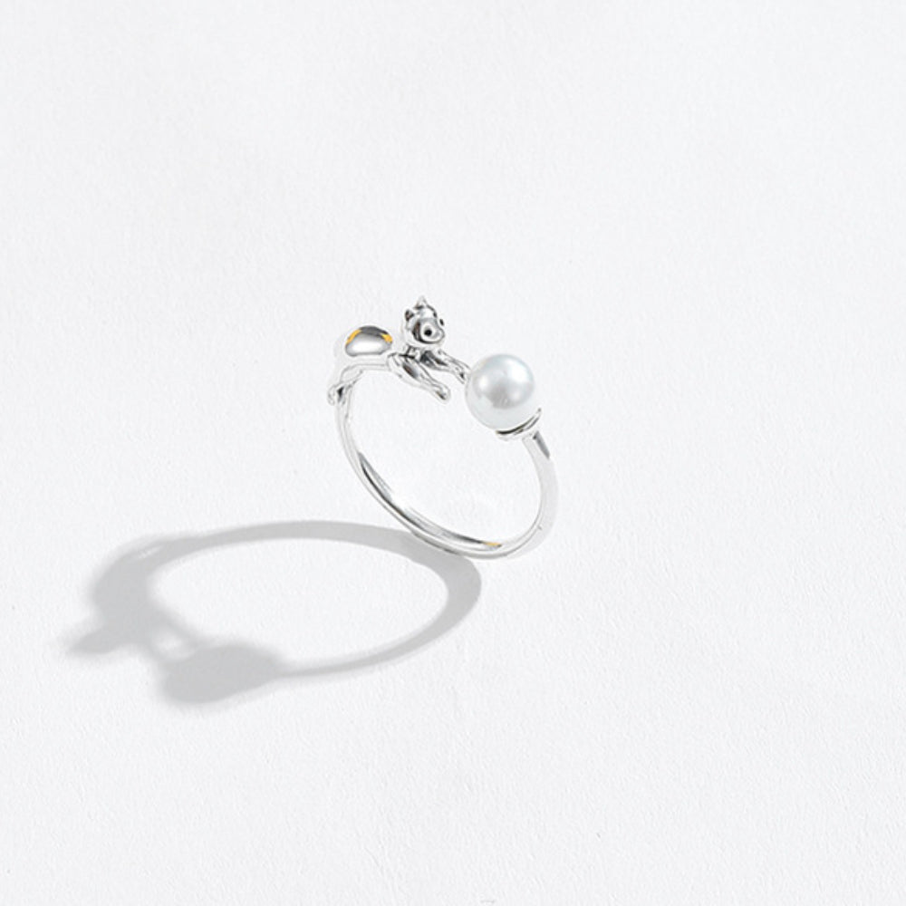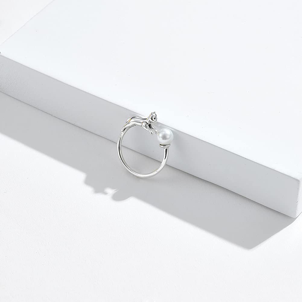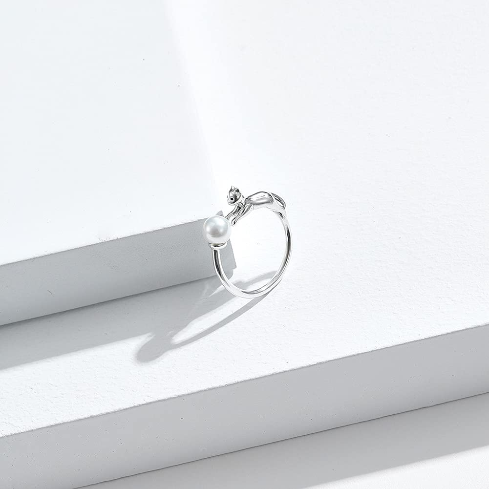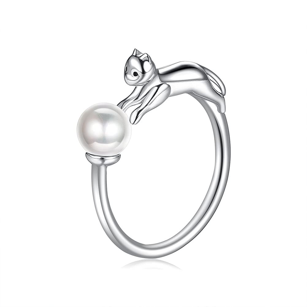 Rockyu レディースリング フリーサイズ 猫とパールのシルバー925指輪