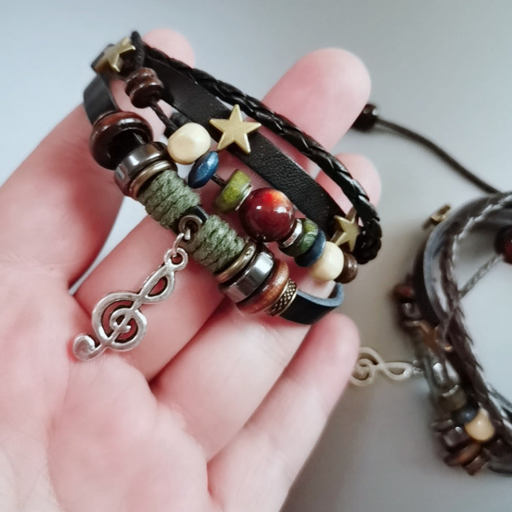 音楽と冒険心を腕元に。Rockyuの多連レザーブレスレットは、音符チャームとカラフルなビーズのコンビネーションが目を引く、ちょっぴりワイルドで個性的な一本。編み込みレザーと麻紐、ウッドビーズ、アンティーク調のスター装飾を重ね、まるで異国を旅して手に入れたようなストーリーを感じさせてくれます。