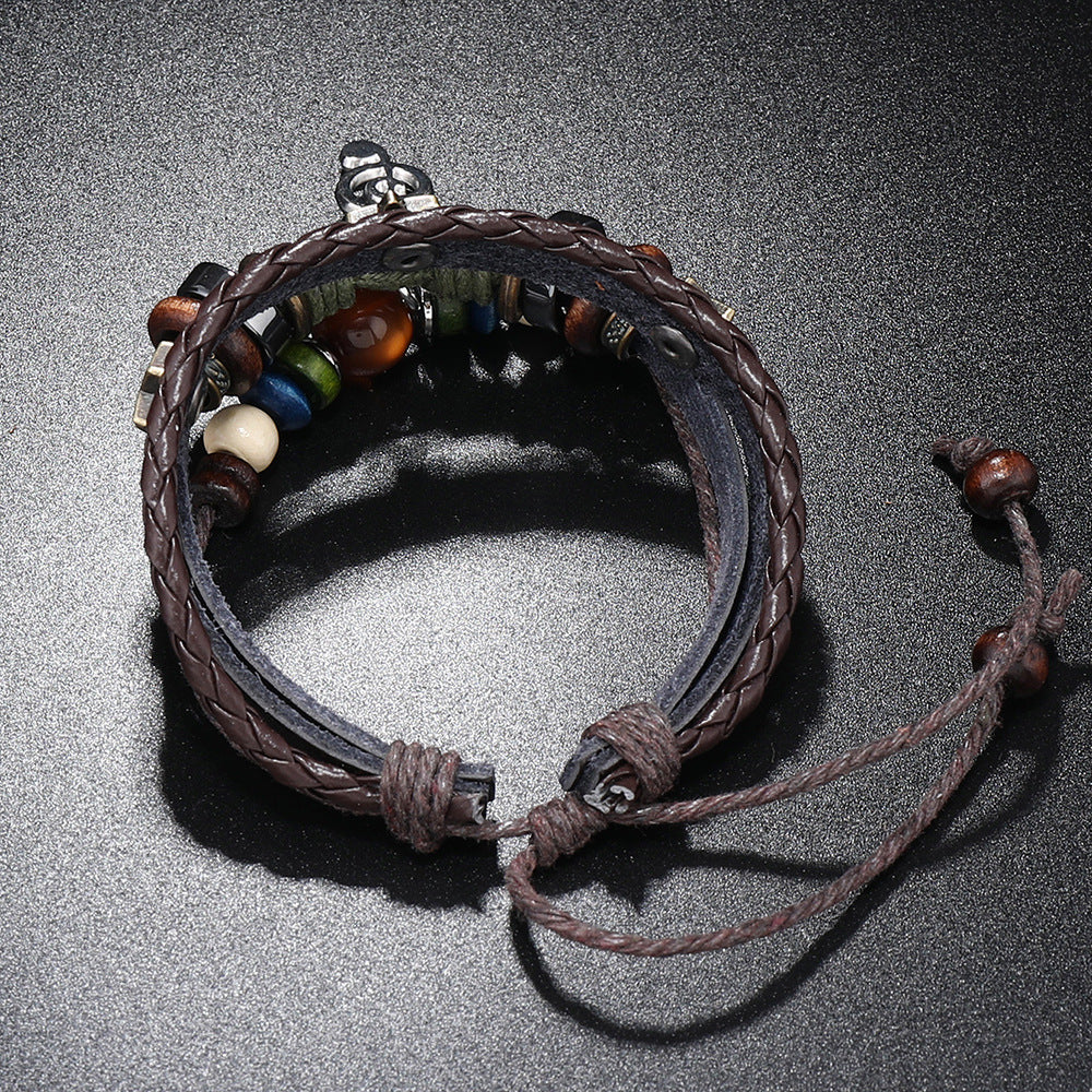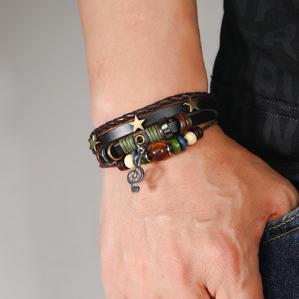 Rockyu メンズブレスレット 多重レザー 音符チャーム付き 編み込みバングル