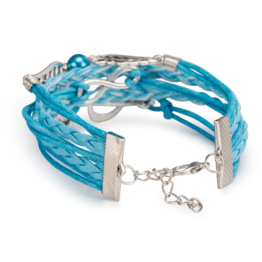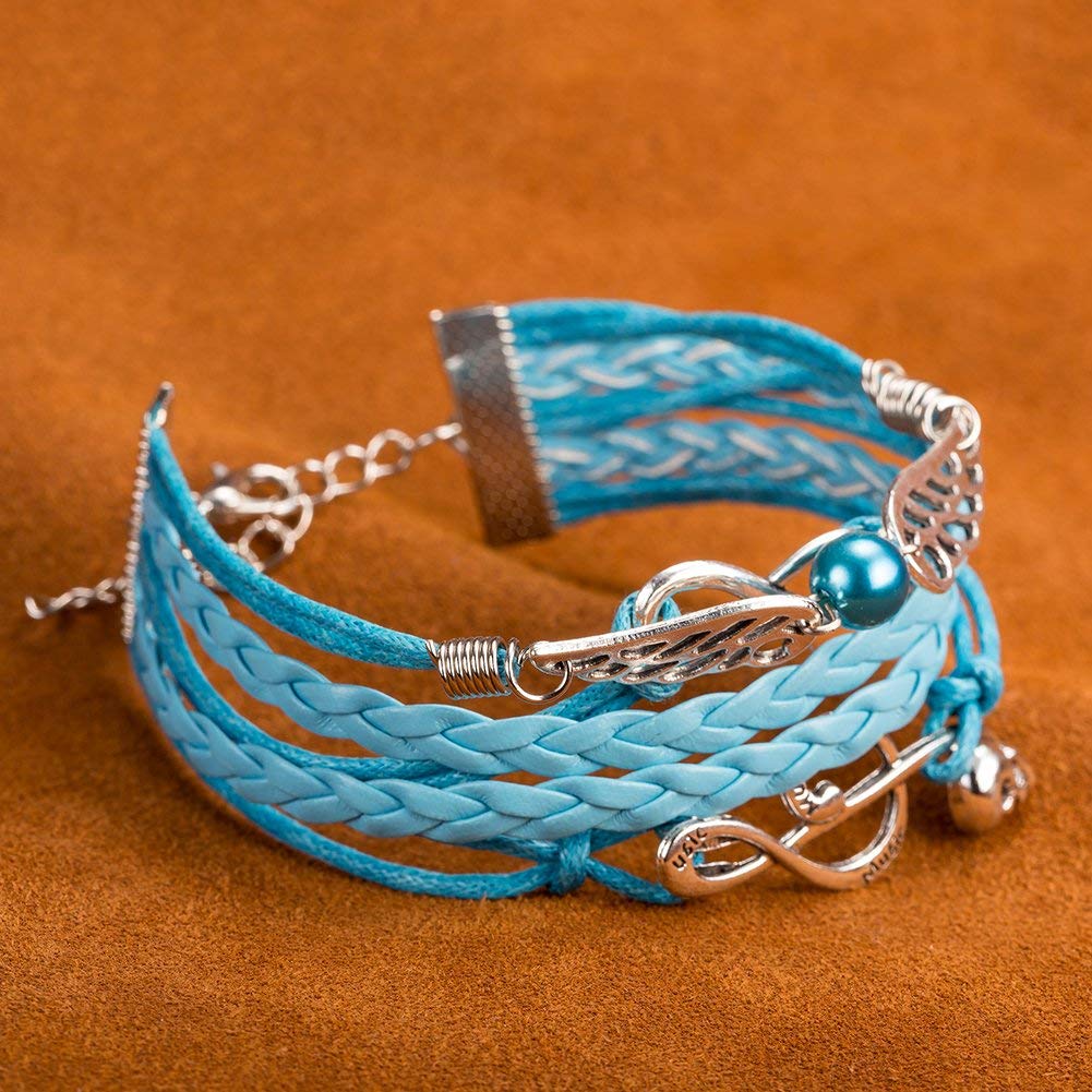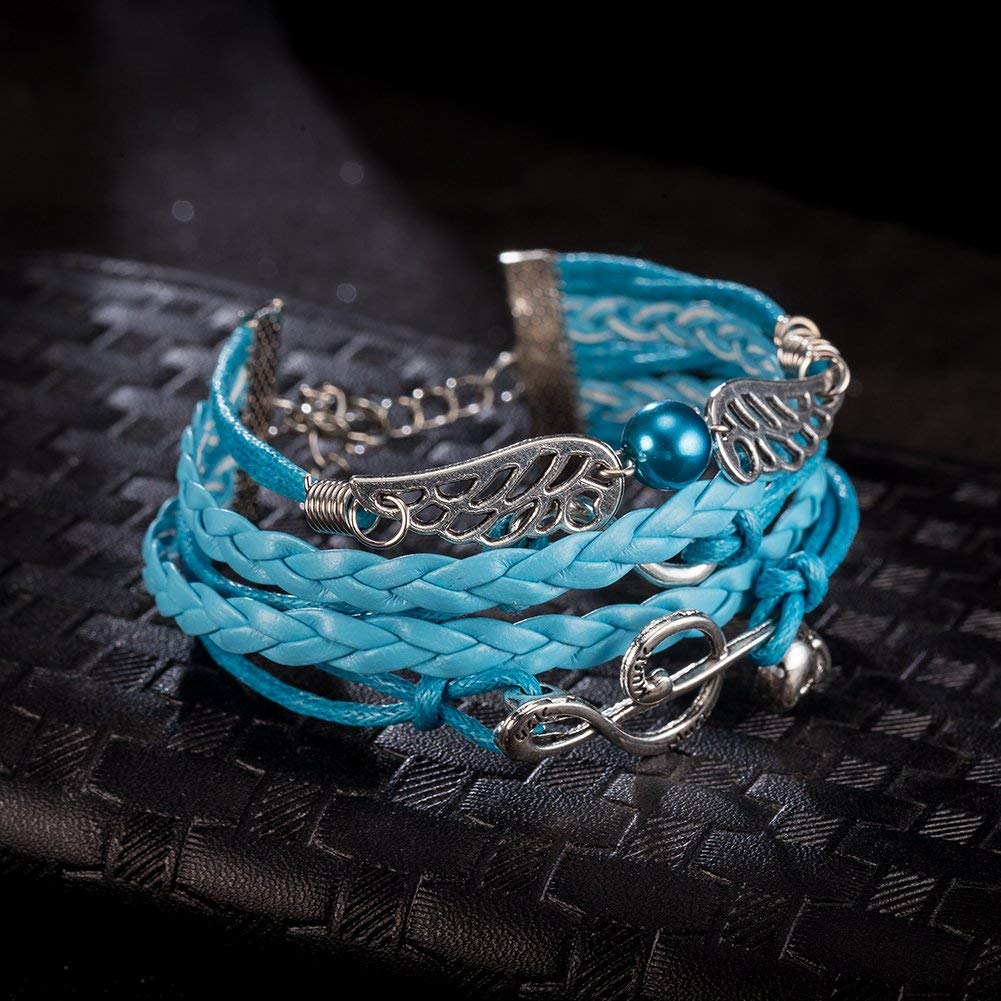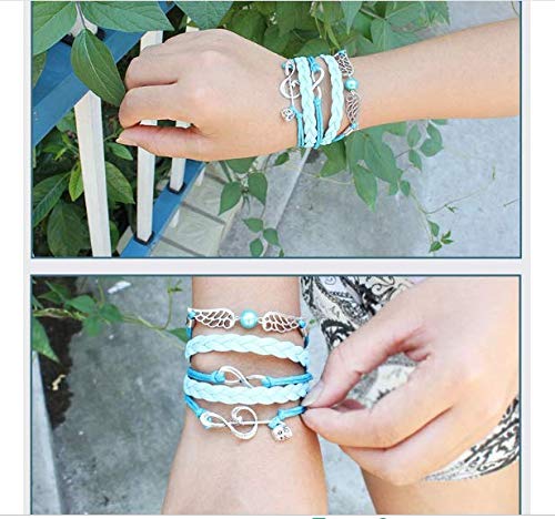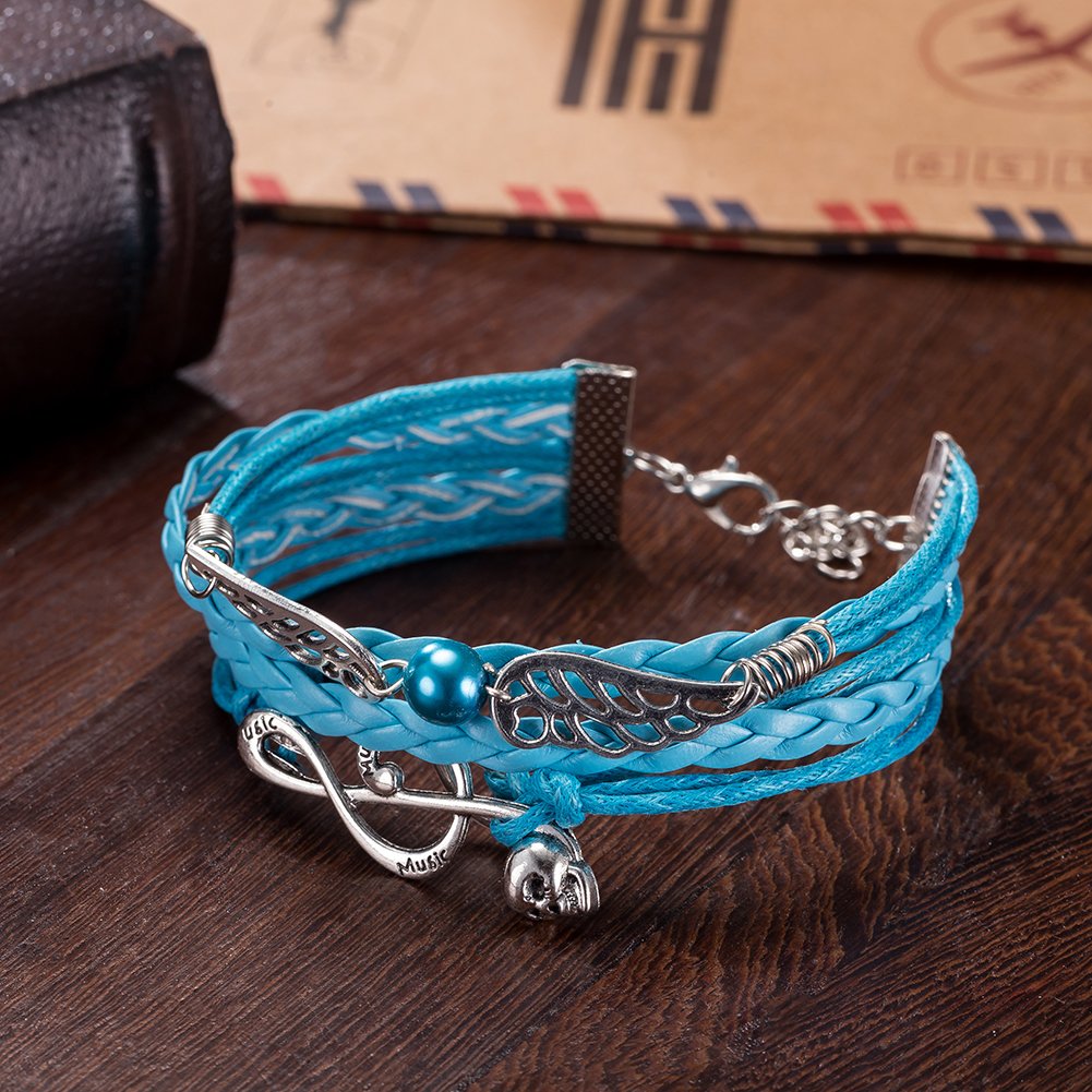 翼&音符チャーム付き ターコイズ編みレザーブレスレット【多層スタイル】