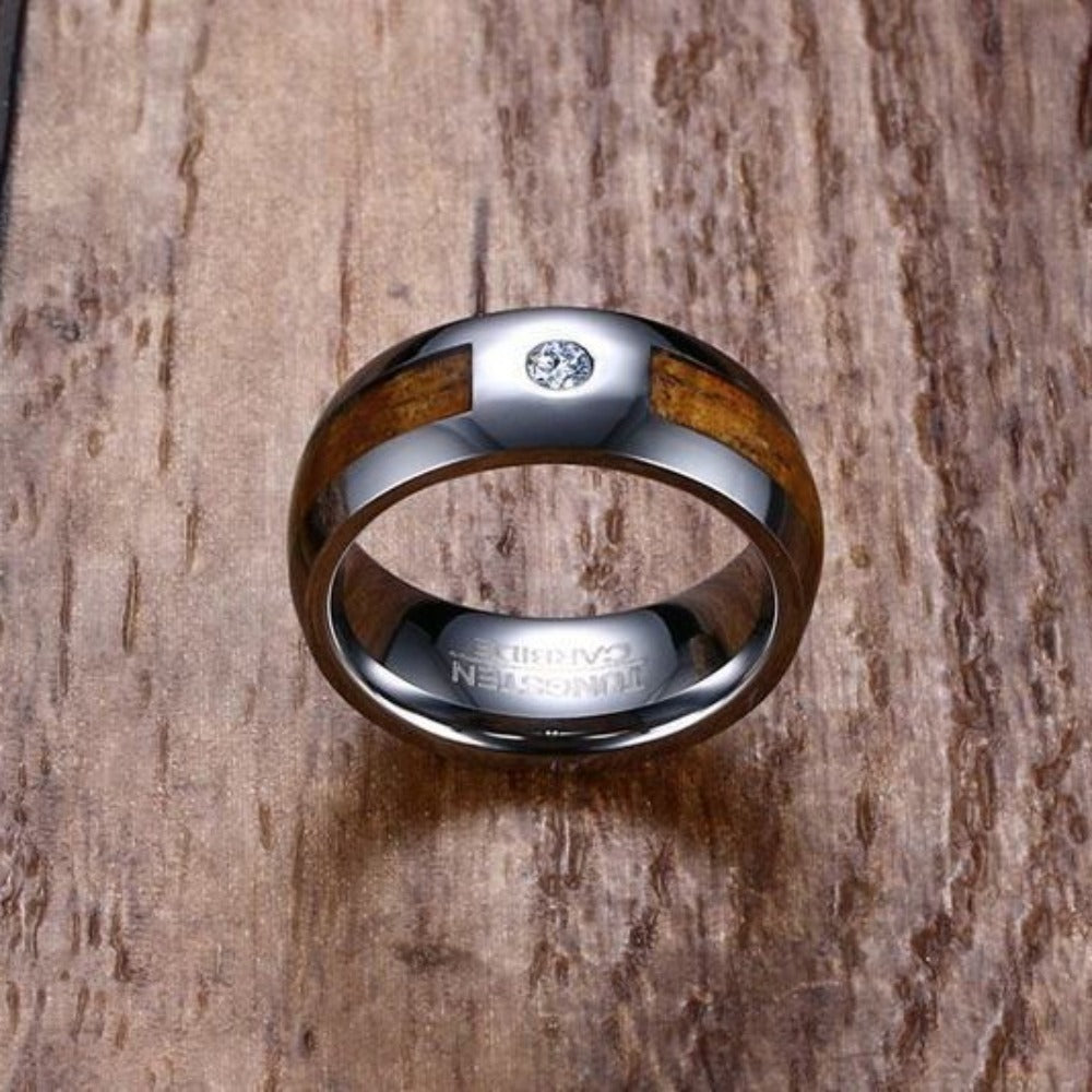 Rockyuが贈る、タングステンカーバイド製のメンズリング。8mm幅の力強いフォルムに、温もりある木目インレイとAAAランクのキュービックジルコニアをセットし、スタイリッシュさと自然な質感を融合させました。表面はなめらかな光沢仕上げで、タングステン特有の重量感と存在感をしっかり感じられます。キズや摩耗に強く、長期間の使用でも美しさを保ちやすいのが魅力。カジュアルスタイルにもスーツにも馴染み、日常使いからビジネス、パーティー、記念日まで幅広いシーンに対応。結婚指輪やペアリングとしても人気が高く、大切な人へのプレゼントにもおすすめ。Rockyuリングで、大人の手元に上品さと力強さをプラスしましょう。