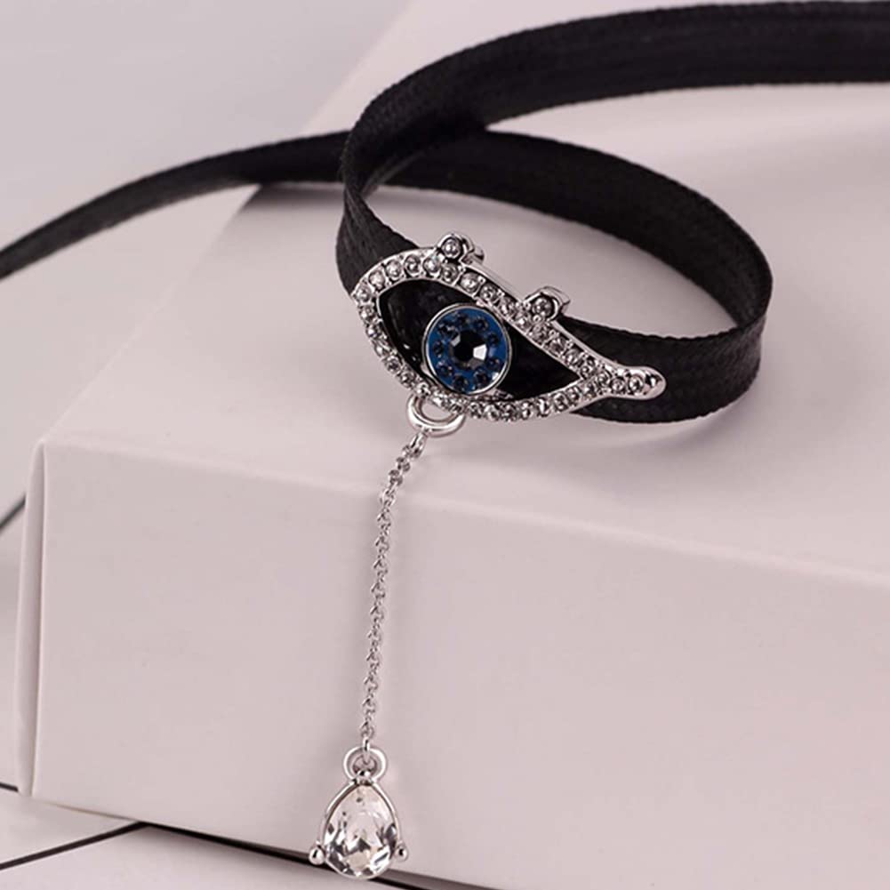胸元に小悪魔的な魅力をプラスする、Rockyu の「悪魔の目」チョーカー。ブラックレザーのしなやかな質感に、ブルージルコニアの目が印象的に輝きます。さらに雫のように揺れるクリスタルペンダントが動くたびに煌めき、視線を惹きつける大胆なデザイン。