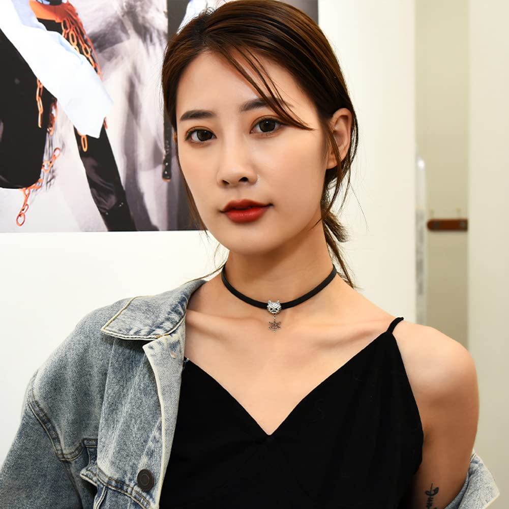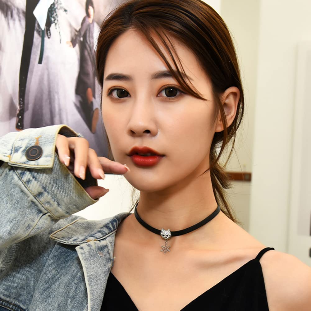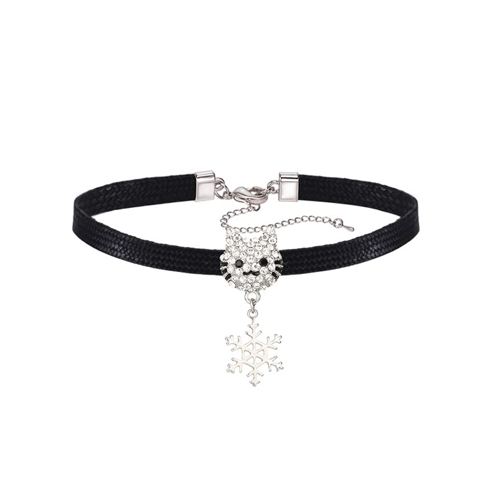 Rockyu チョーカー レディース 黒 レザー 猫 ジルコニア 雪華ペンダント