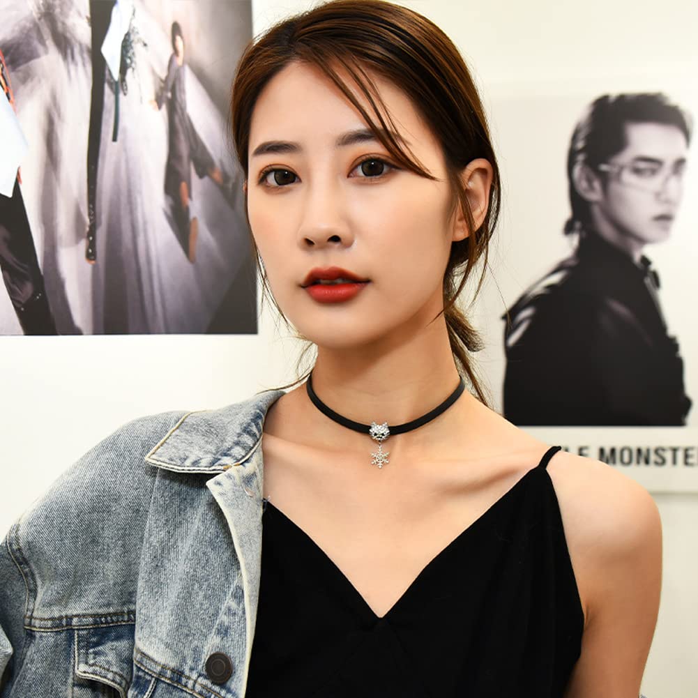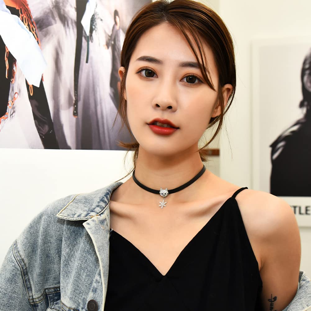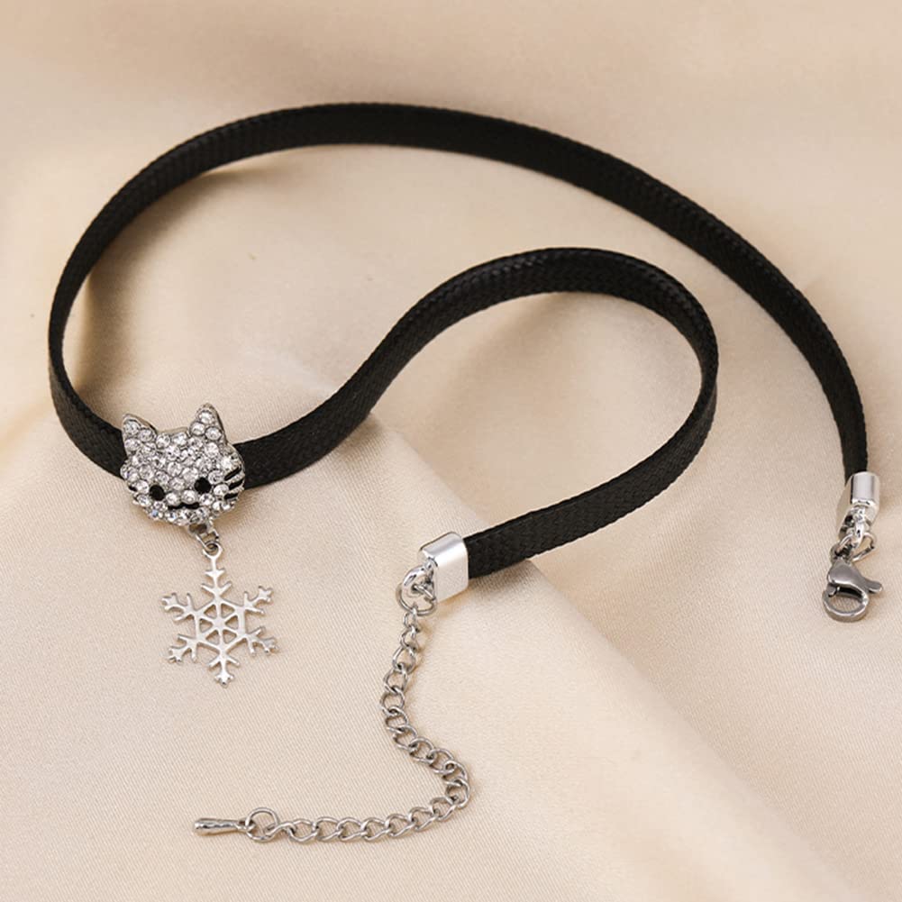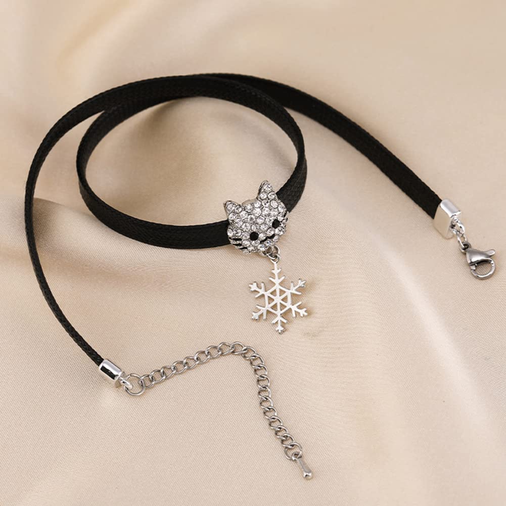 胸元に可憐なきらめきを添える、Rockyu の猫モチーフチョーカー。ブラックレザーのシンプルなベルトに、ジルコニアが輝く猫の顔と雪の結晶ペンダントを組み合わせた、遊び心あふれるデザインです。小さなネコの瞳がきらりと光り、揺れる雪華チャームが女性らしい華やかさを演出します。