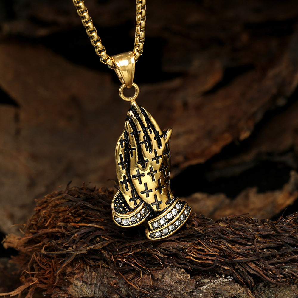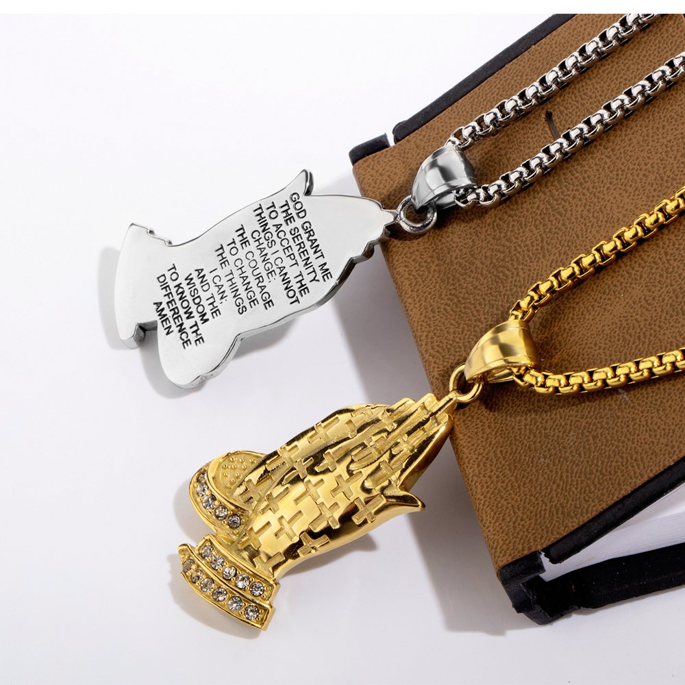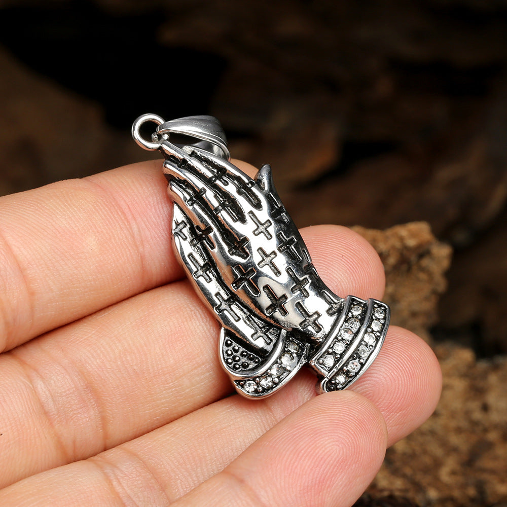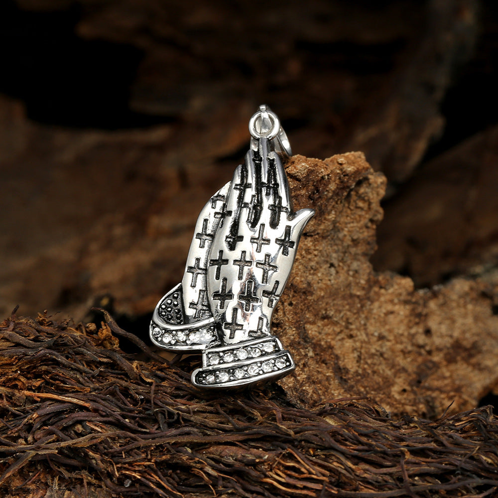 Rockyu 手の祈りネックレス ステンレス製 十字架×刻印入りメンズアクセ