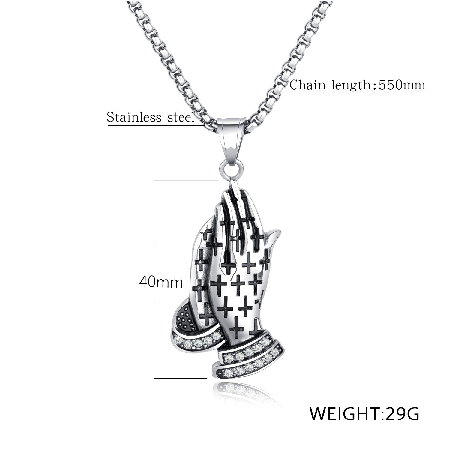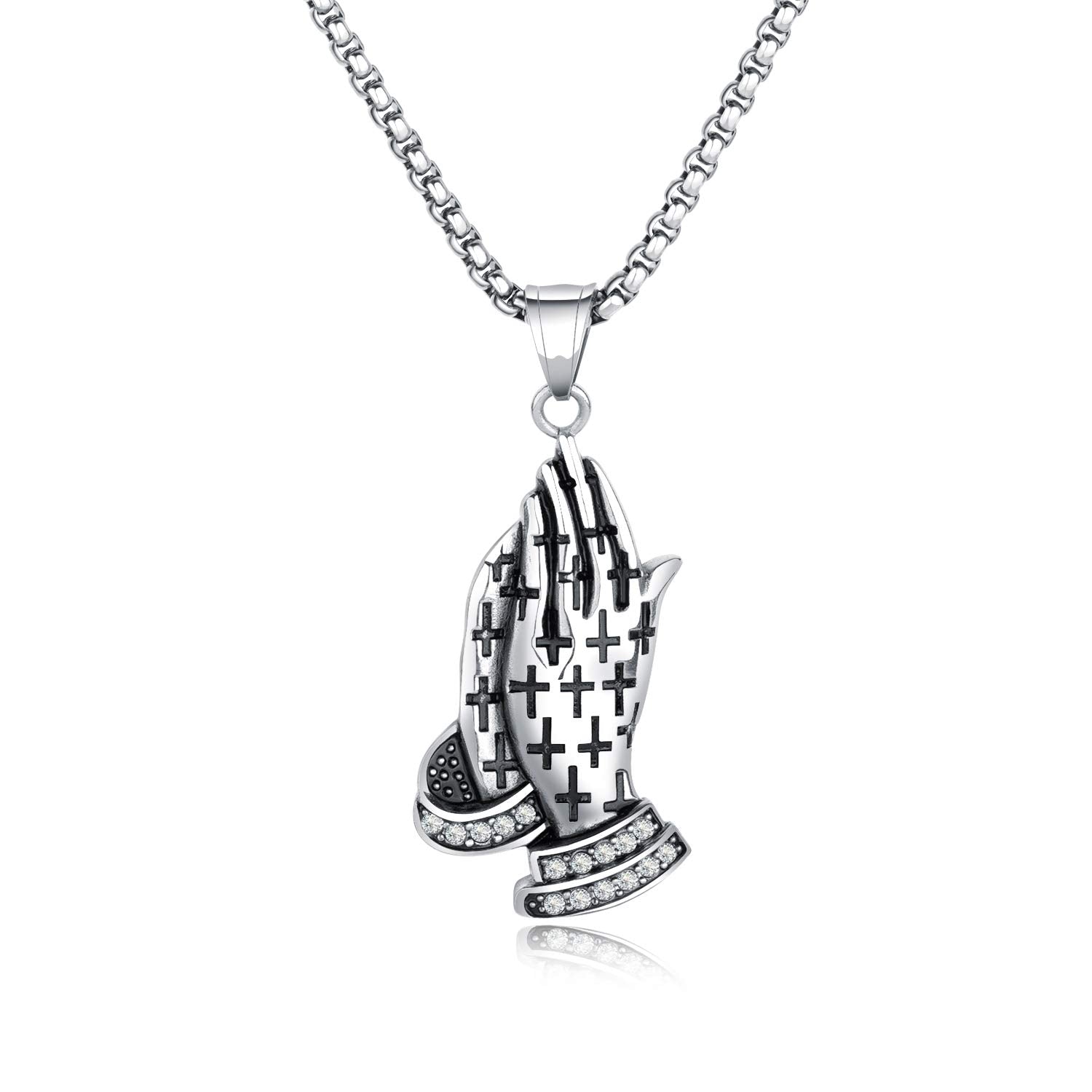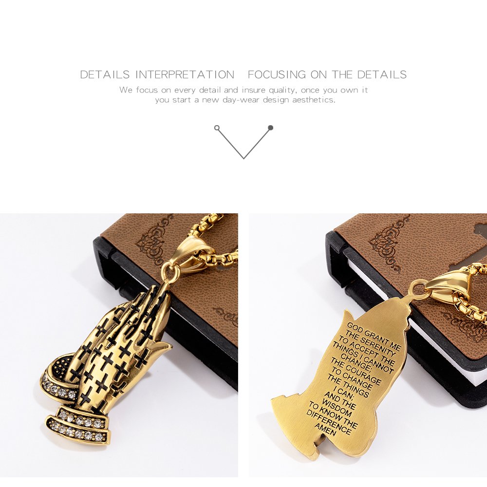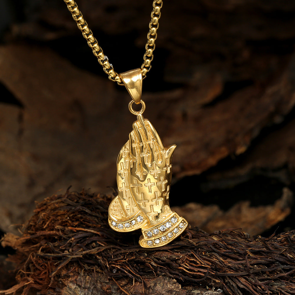 Rockyu 手の祈りネックレス ステンレス製 十字架×刻印入りメンズアクセ