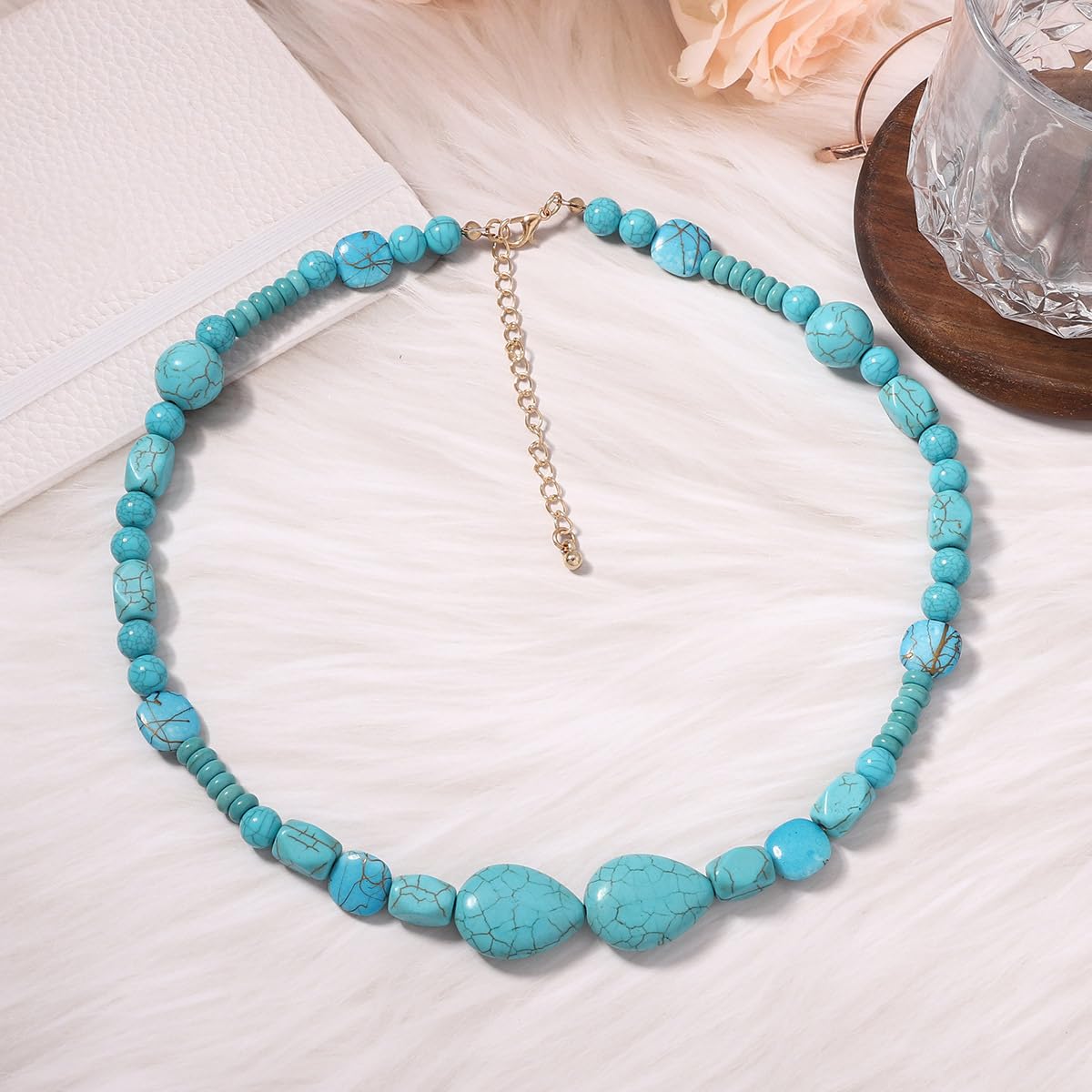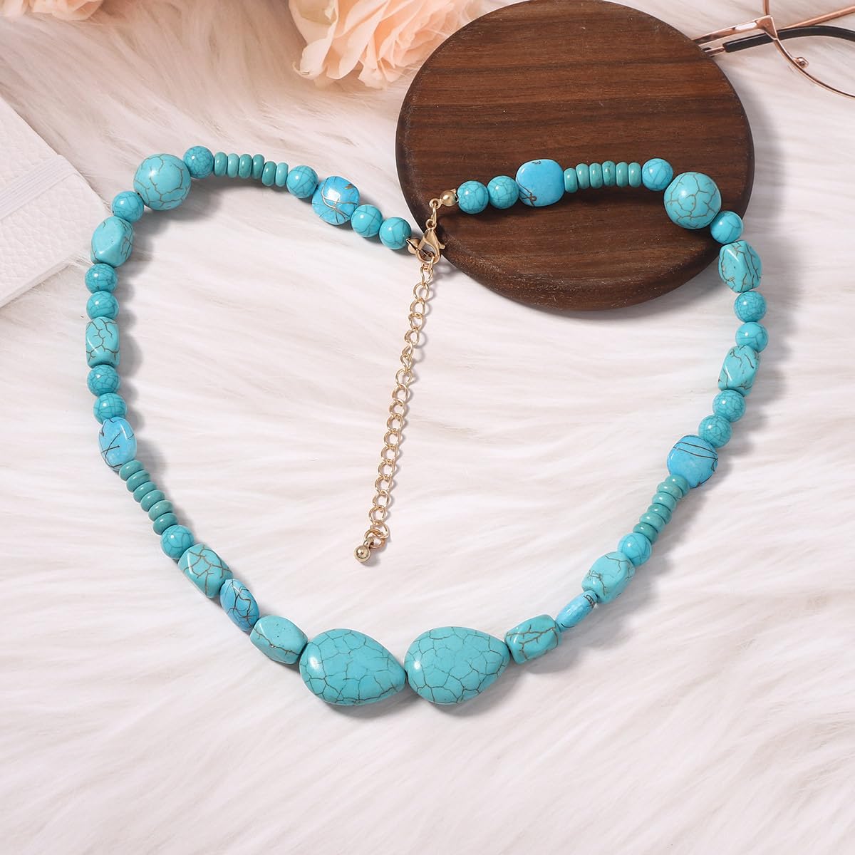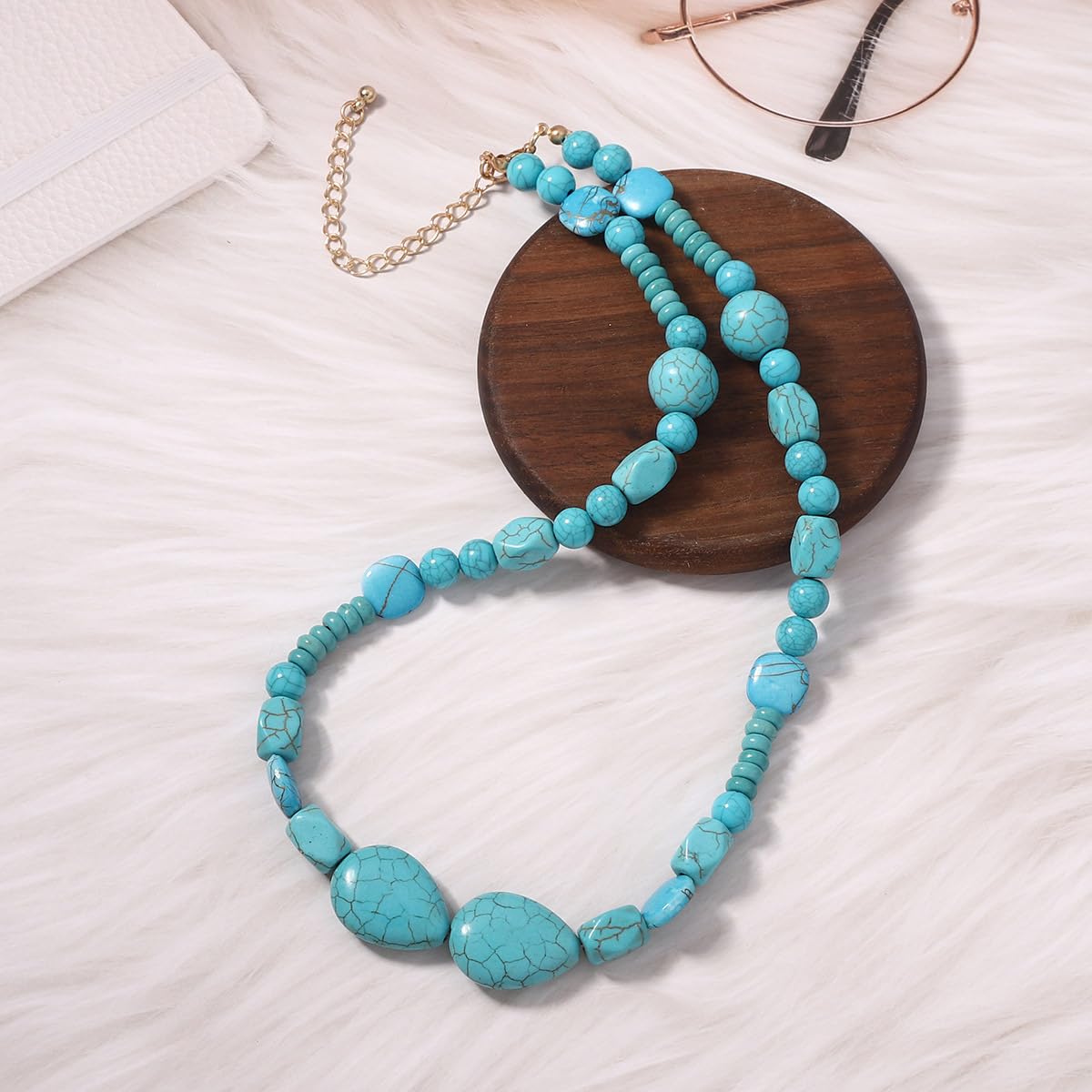 Rockyu ターコイズ天然石ネックレス レディース ビーズデザイン 調整可能 46cm+7cm