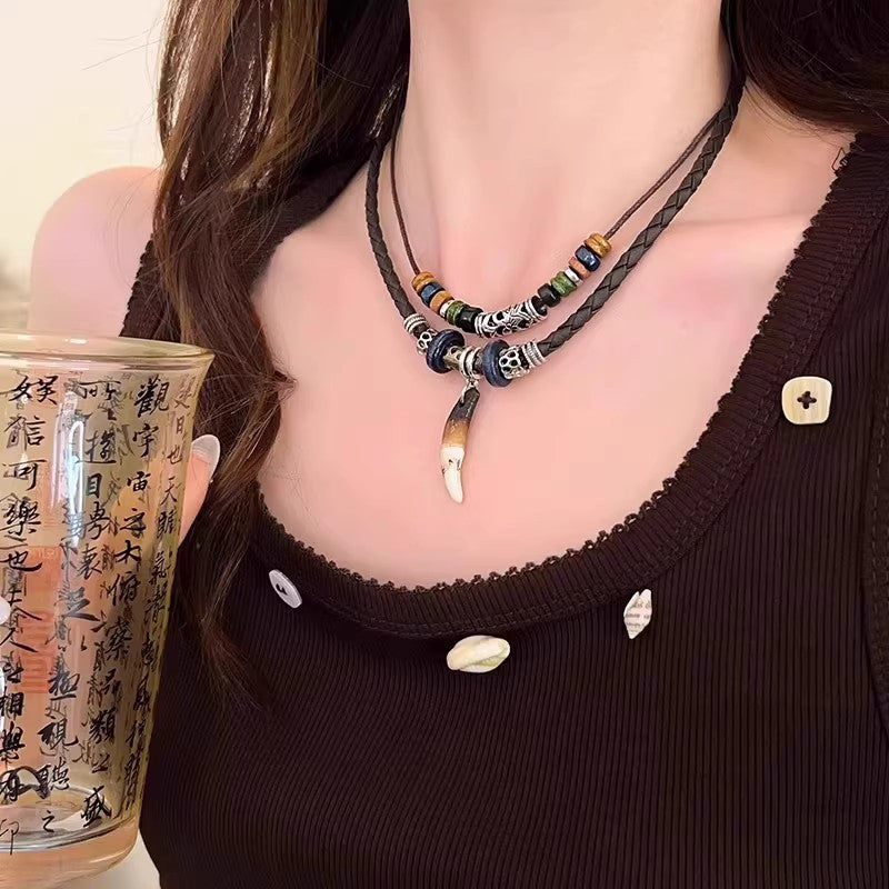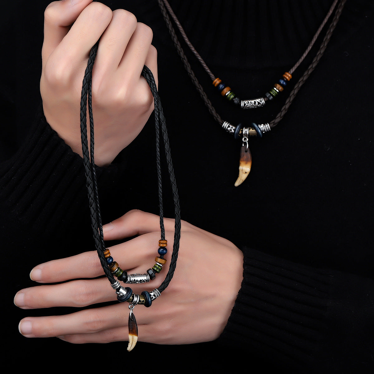 Rockyu ネイティブスタイルネックレス 狼牙ペンダント ビーズデザイン 調整可能コード付き