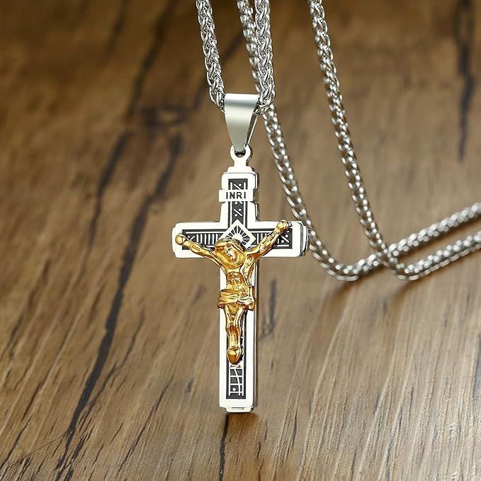 信念を胸に刻む、美しい輝き。Rockyuのクロスペンダントネックレスは、イエス・キリストを中央に配した重厚感あるデザインで、ただのアクセサリーでは終わらない“意味”を纏います。存在感たっぷりのゴールドトーンに高級IPゴールドメッキを施し、滑らかで美しい光沢が胸元を印象的に彩ります。