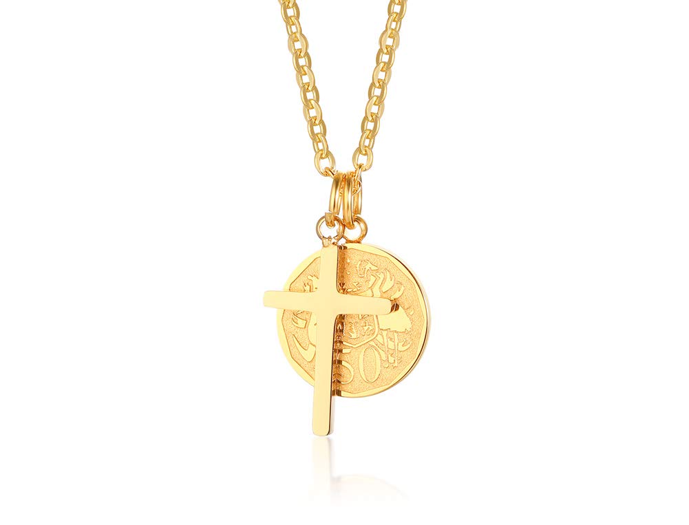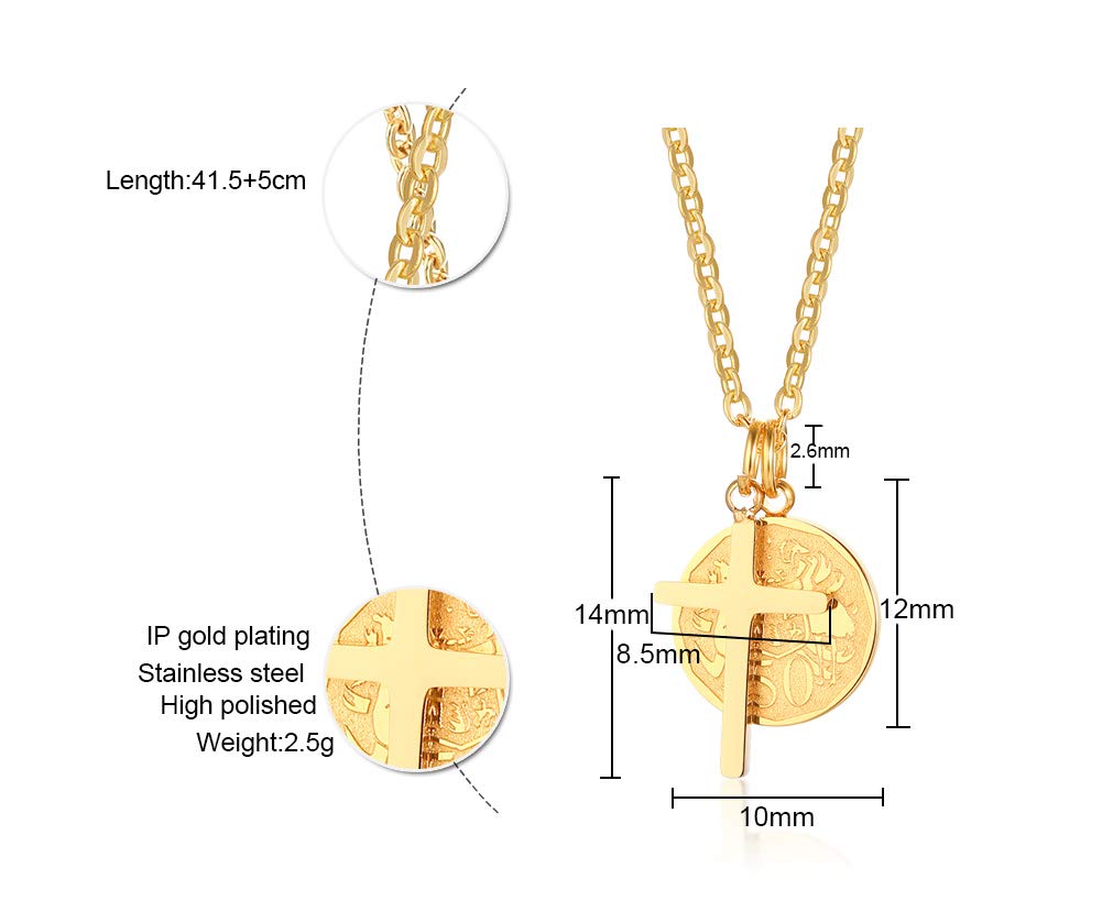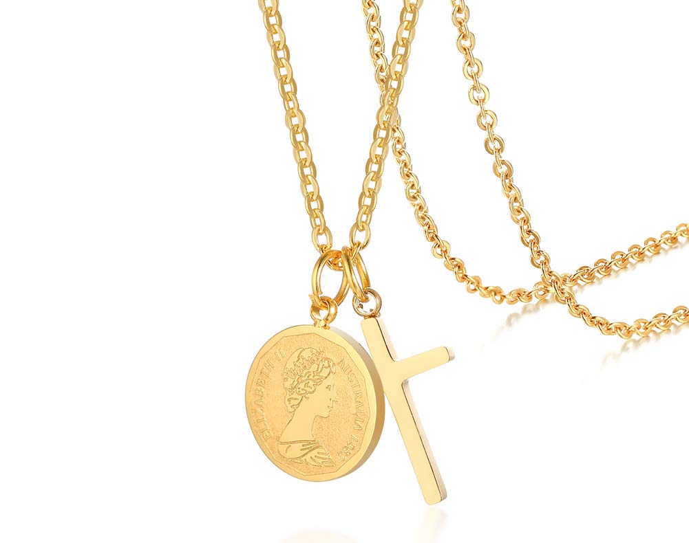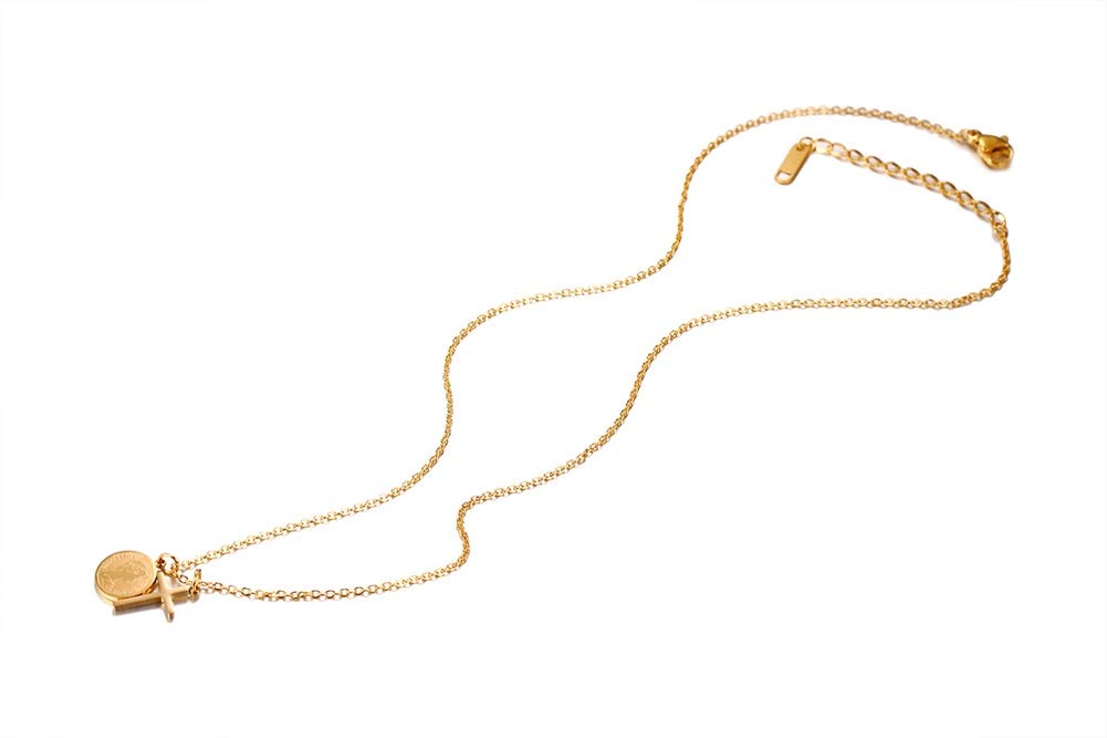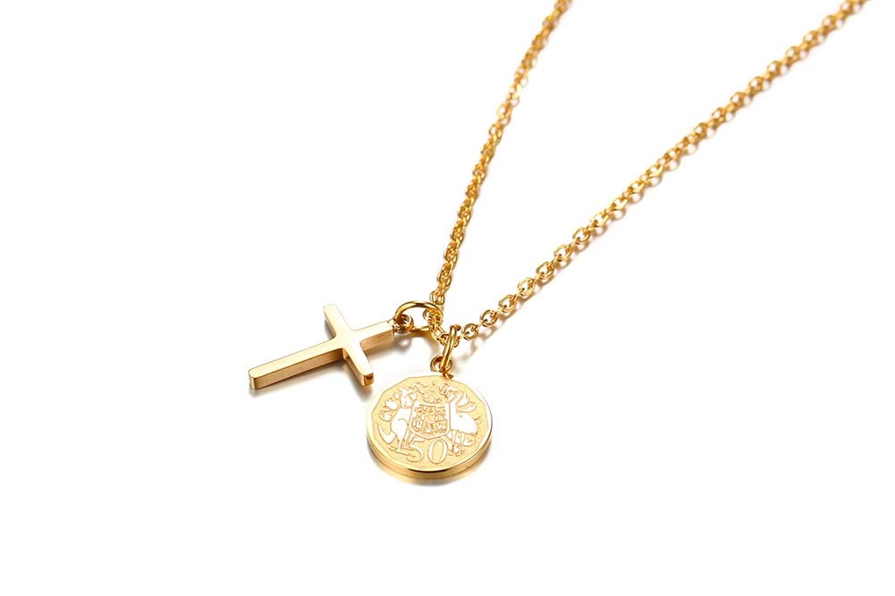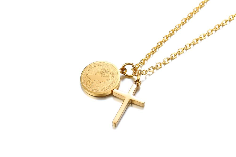 Rockyu クロス&コインペンダント レディースネックレス ステンレス製 18Kゴールド仕上げ