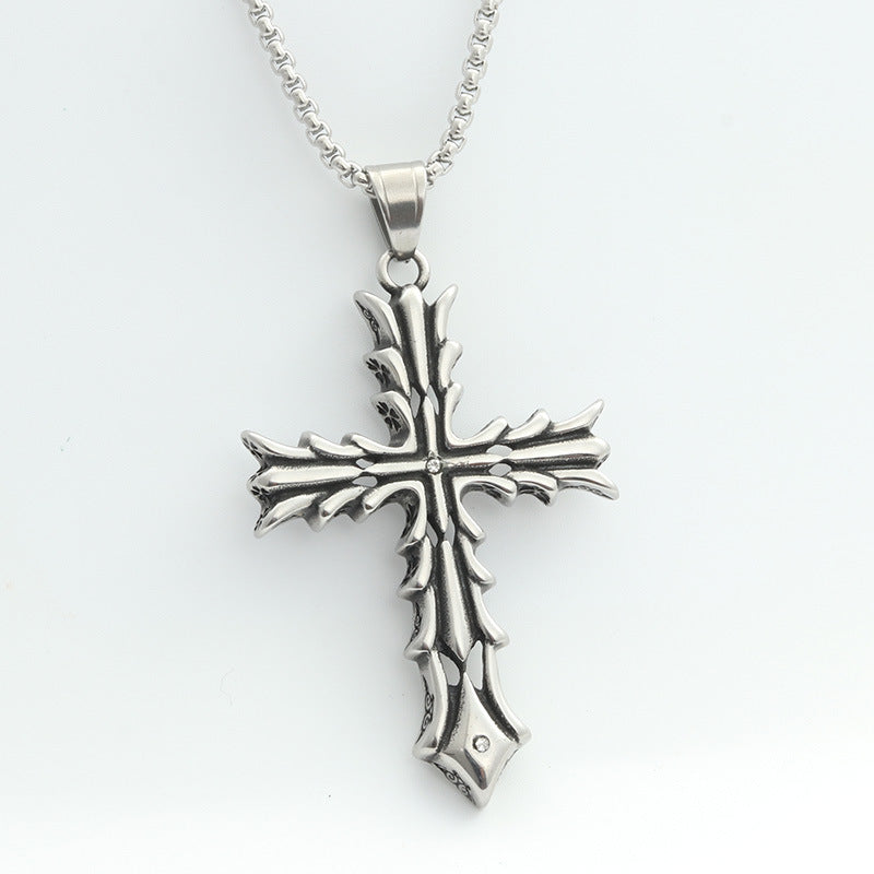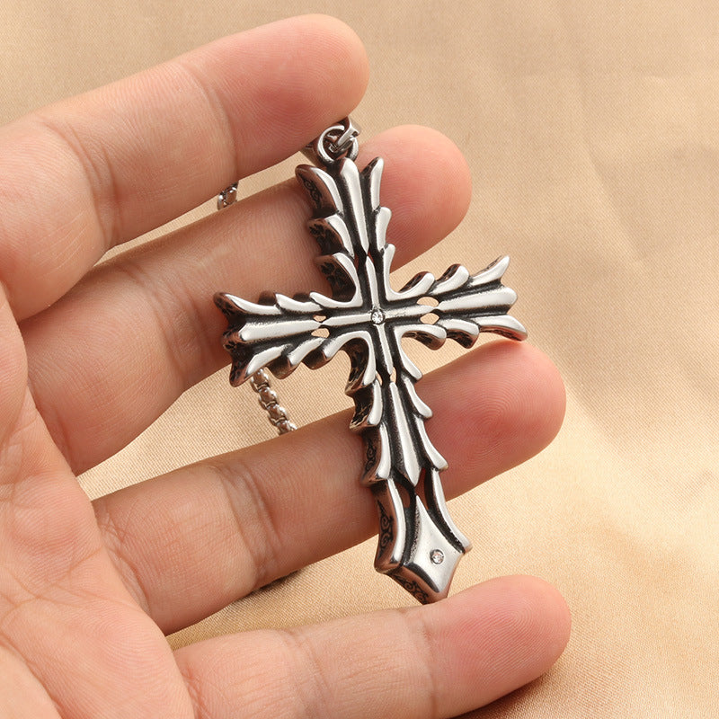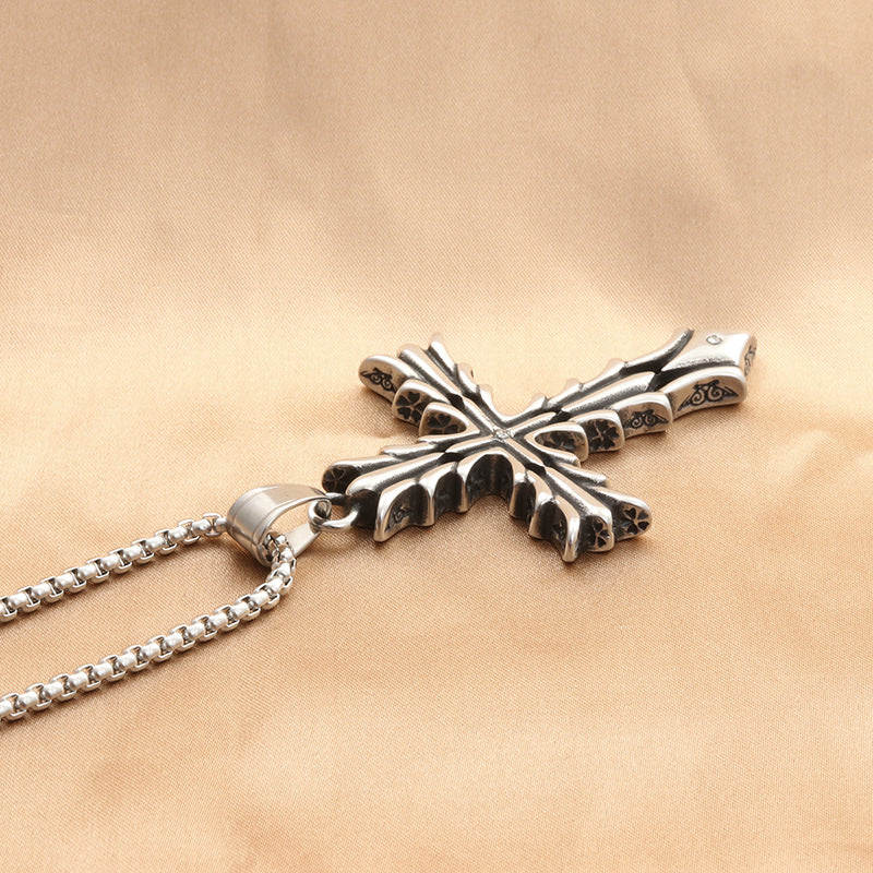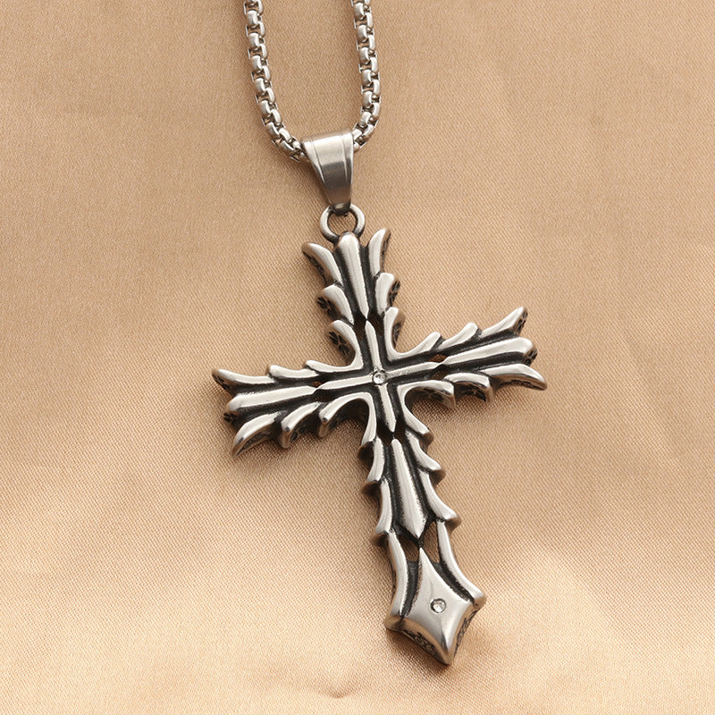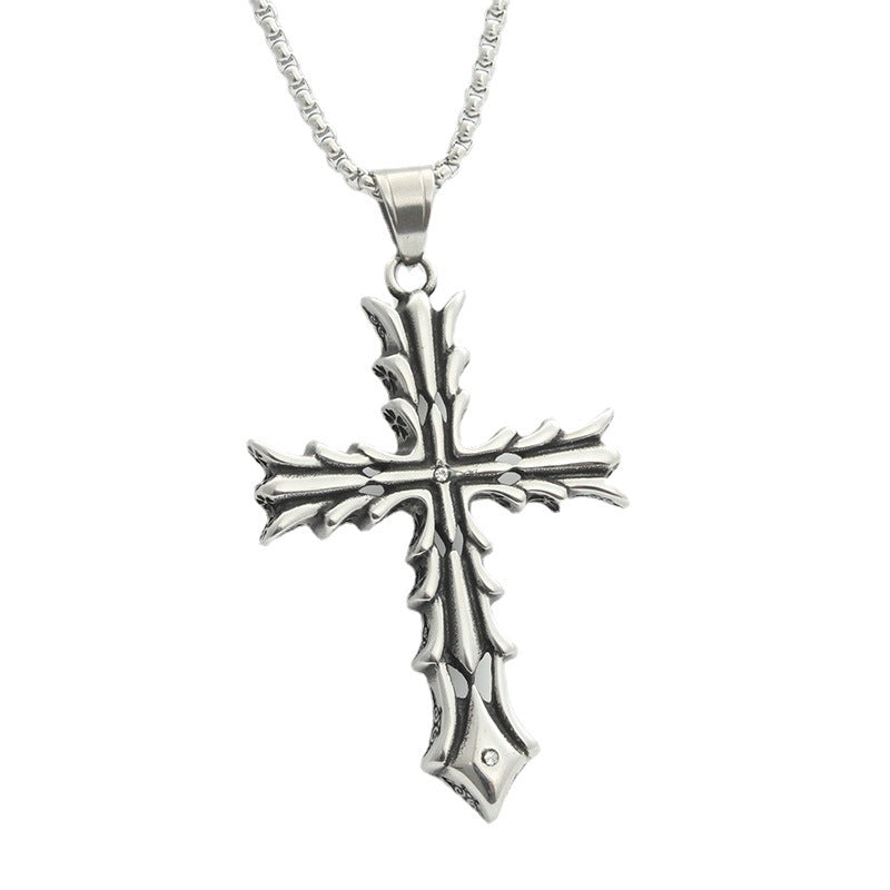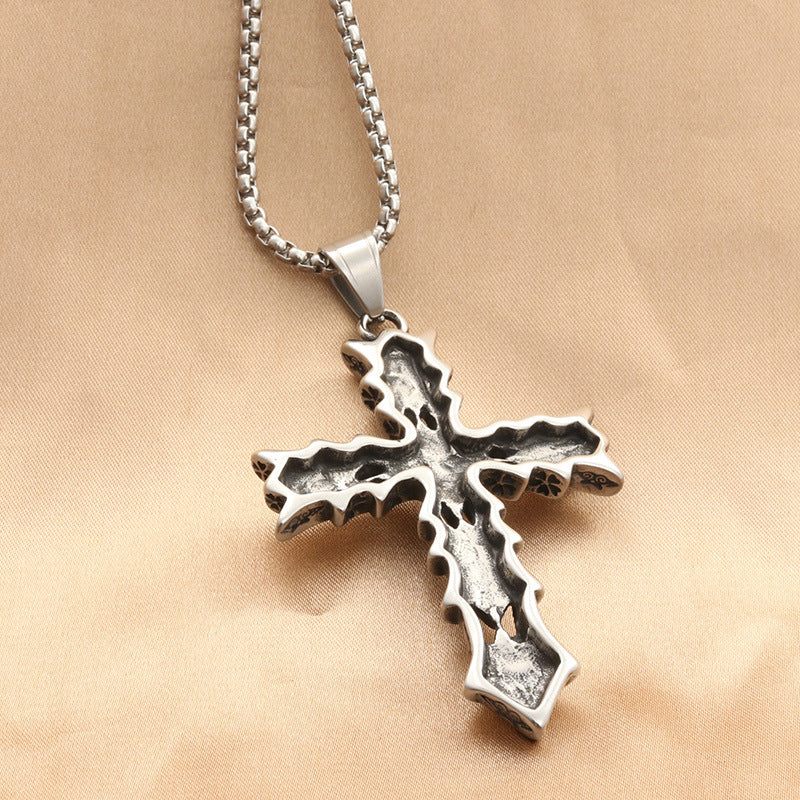 Rockyu がお届けする、男心をくすぐるシルバークロスペンダント。重厚感のあるベネチアンチェーンと、立体的にデザインされた十字架モチーフが胸元で存在感を放ちます。シンプルなのにどこかスパイシー、フォーマルにもカジュアルにも使える万能アクセサリーです。