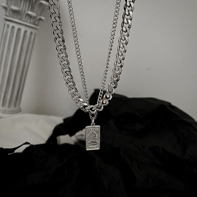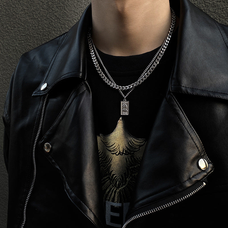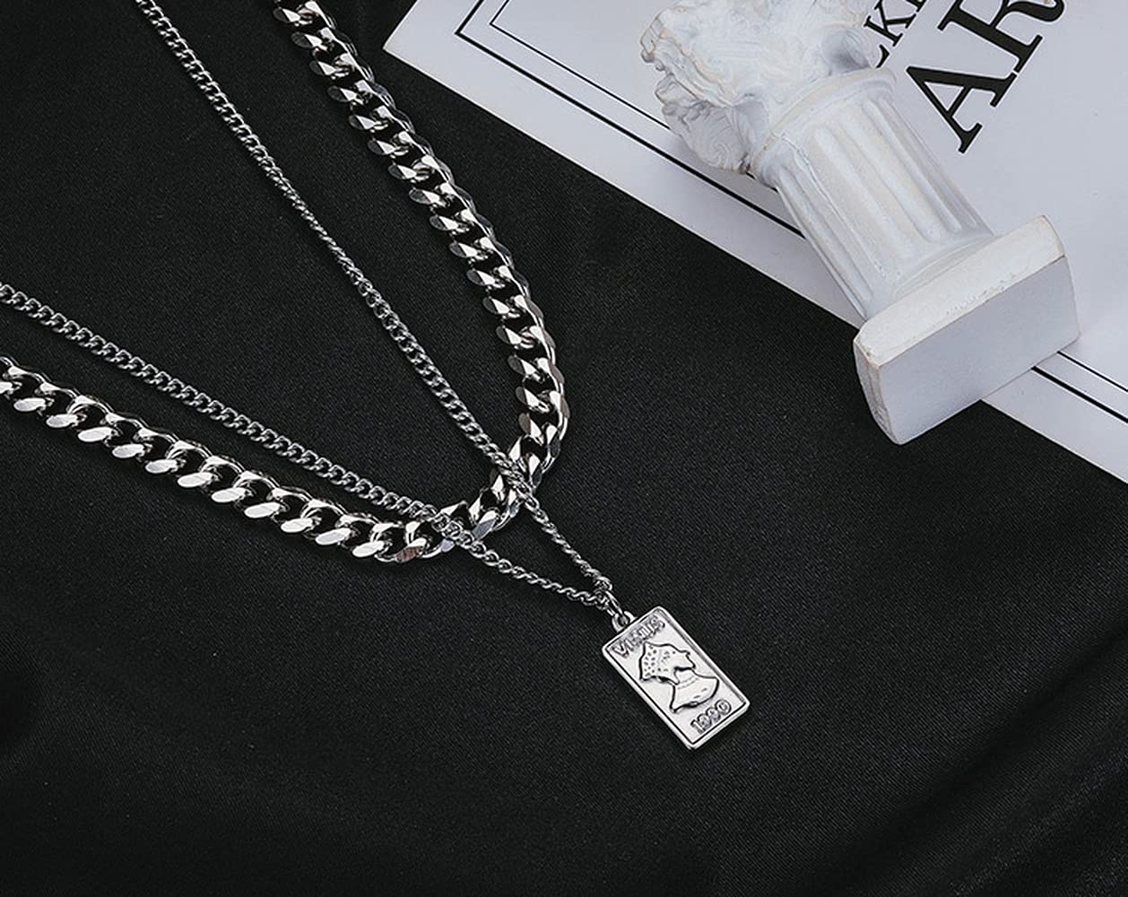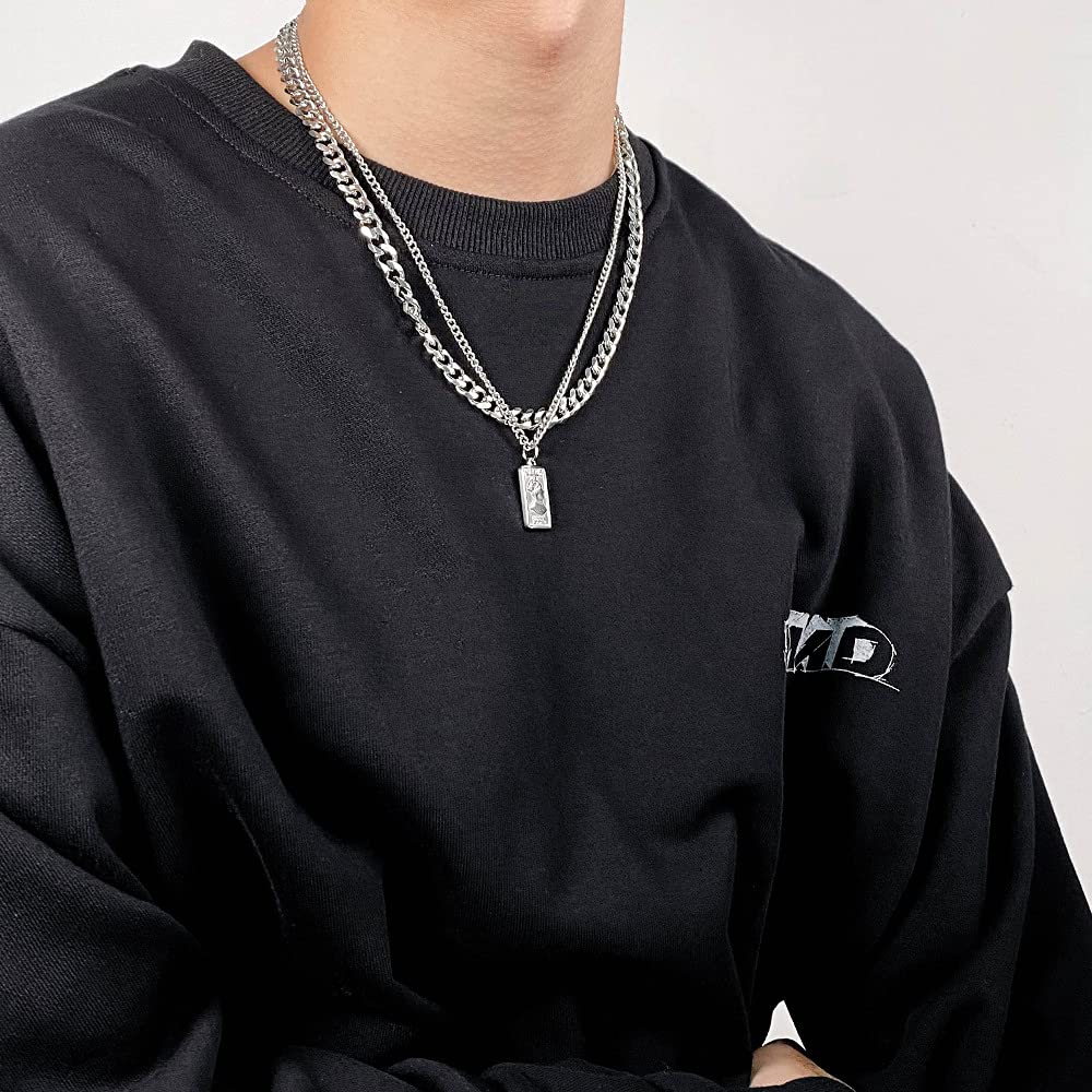 シンプルだけど主張強め。Rockyuが贈るこの二連ネックレスは、重厚感と洗練を同時に手に入れたいあなたにぴったりの一本です。太めの喜平チェーンと細身のチェーンが絶妙に重なり、スタイルに深みをプラス。ペンダントにはエッジの効いた方形プレートが輝き、胸元で静かに語りかけてきます。