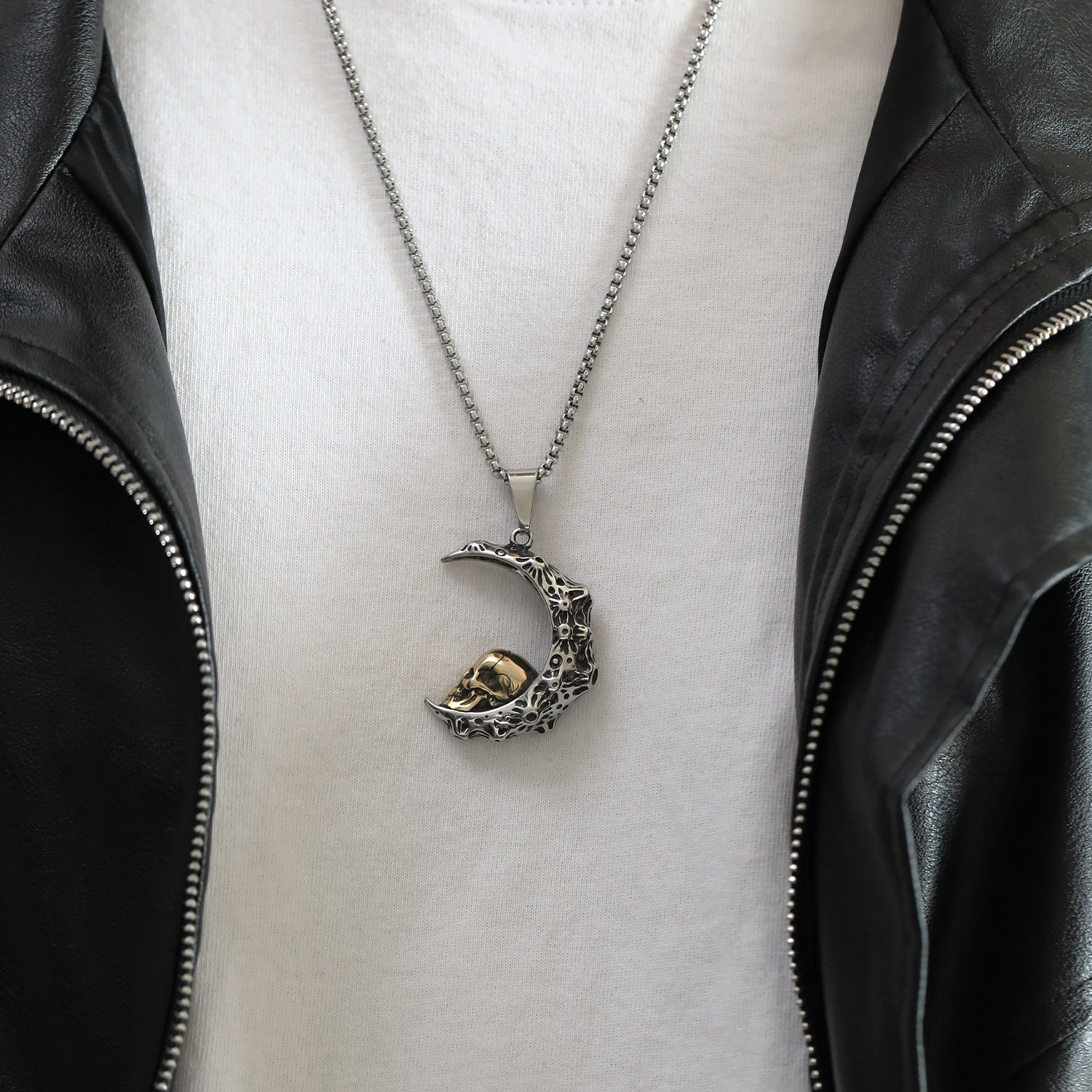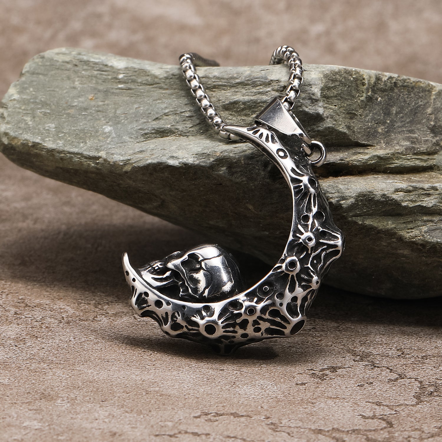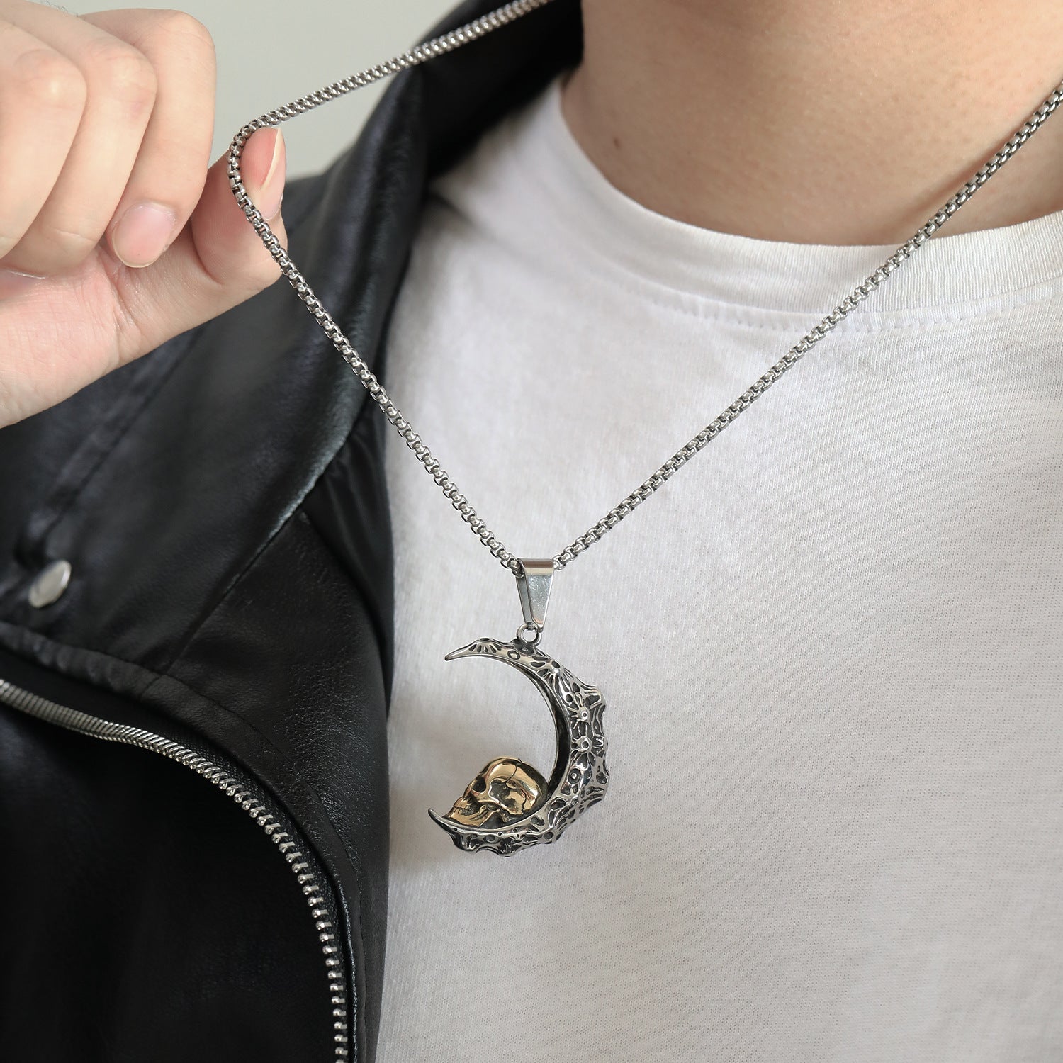 Rockyu メンズネックレス 月とスカルのダークペンダント ステンレス製 60cmチェーン付き