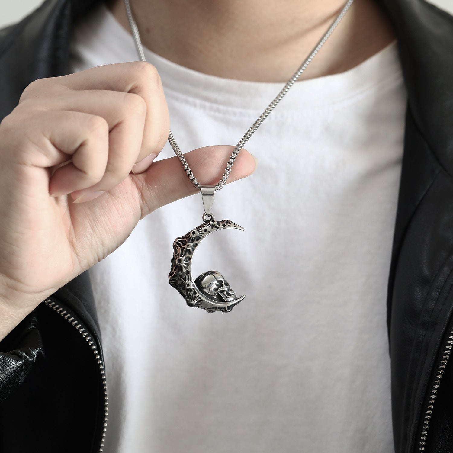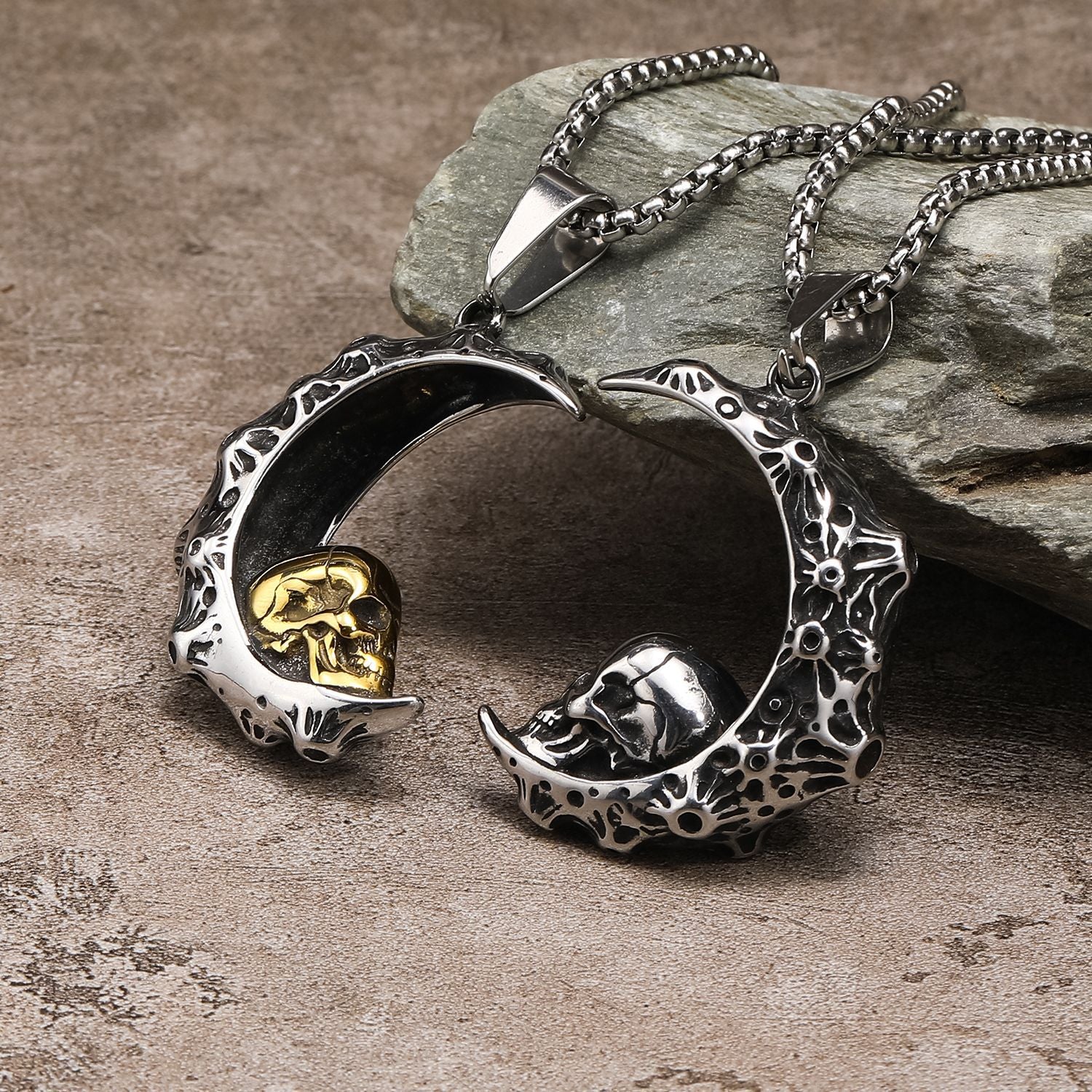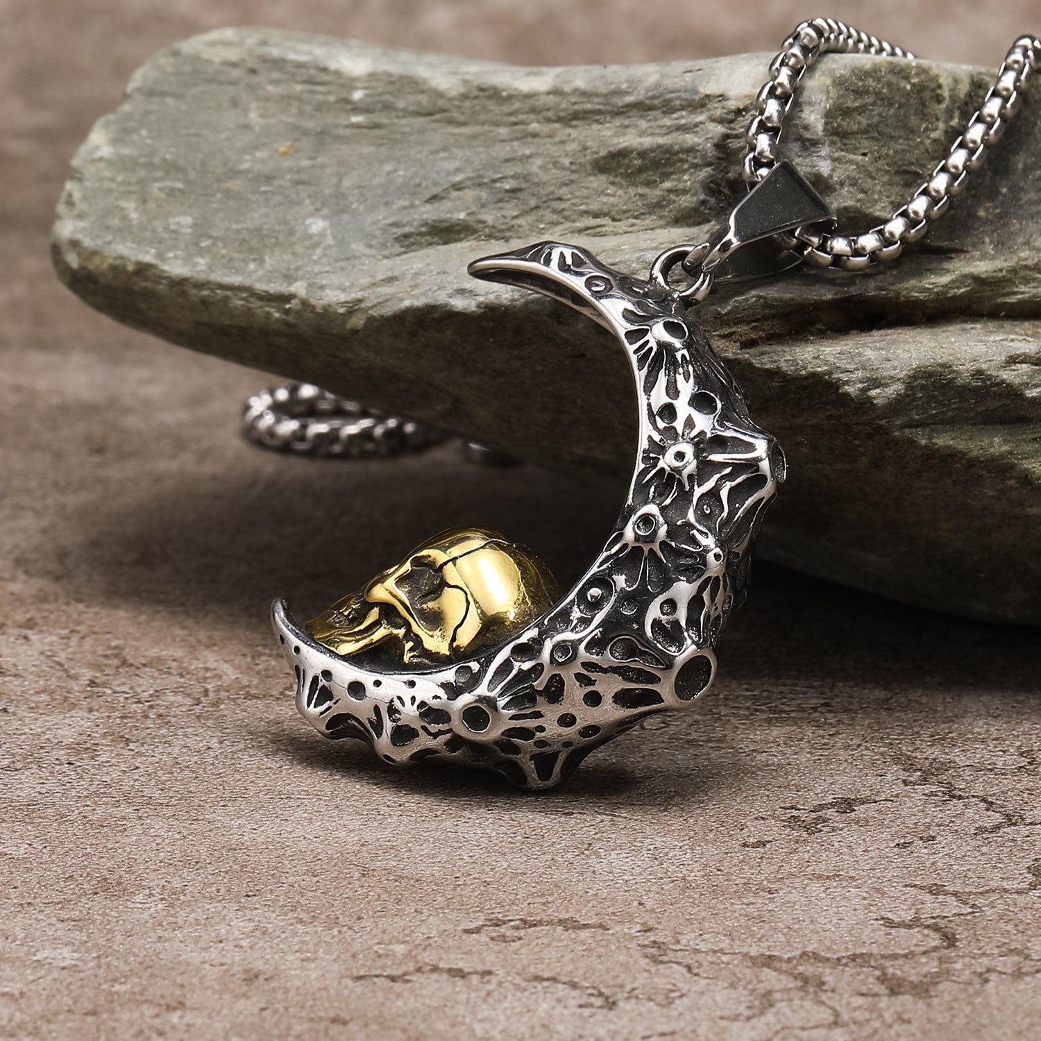 Rockyu メンズネックレス 月とスカルのダークペンダント ステンレス製 60cmチェーン付き