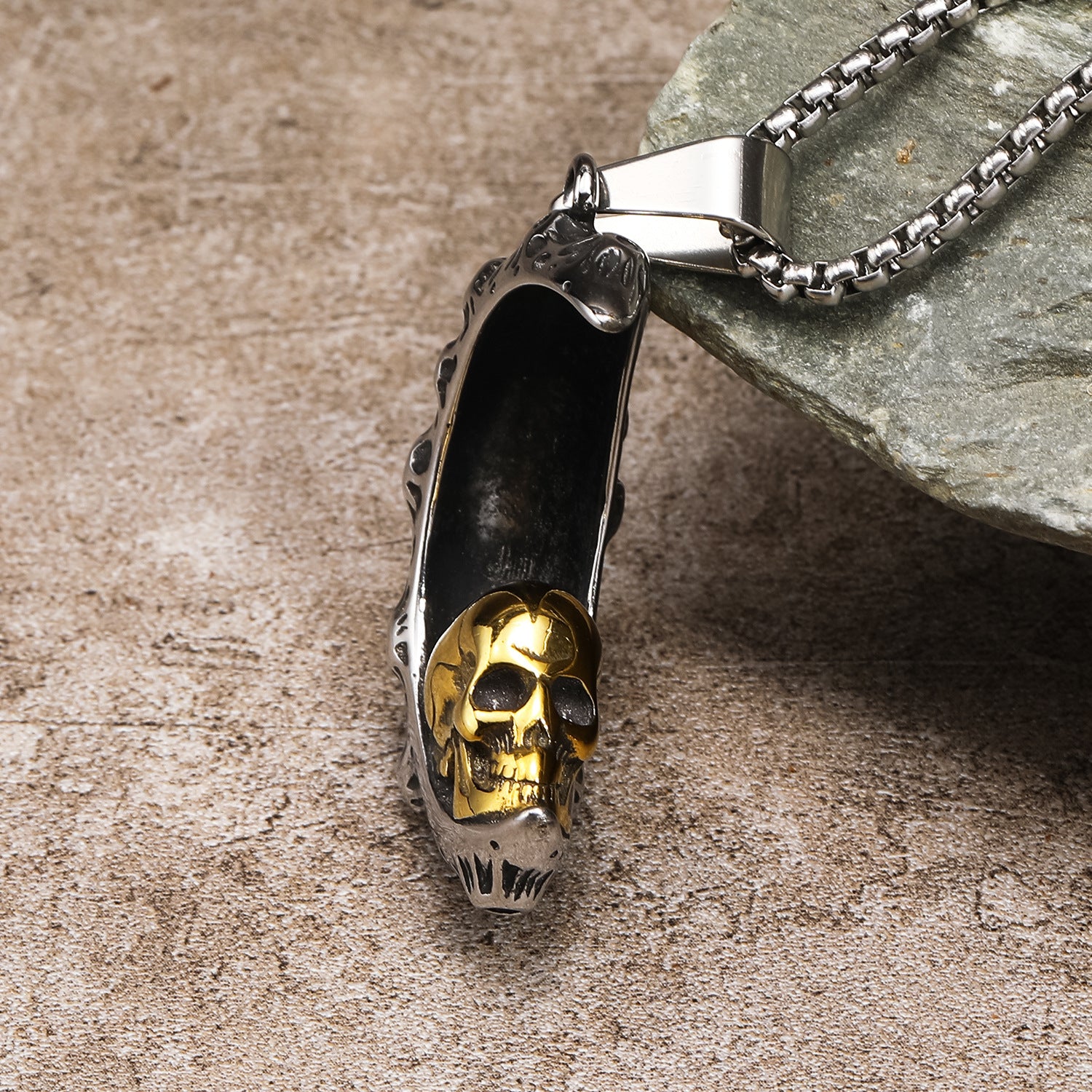 悪魔の月に抱かれたスカル…まるで夜の支配者のような存在感で、首元に圧倒的なインパクトをもたらします。ディテールまで緻密に造形された立体的なペンダントは、まさに“装着するアート”。