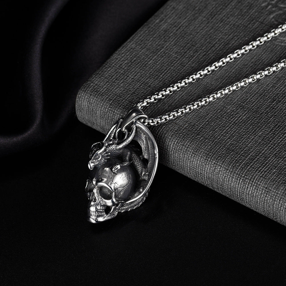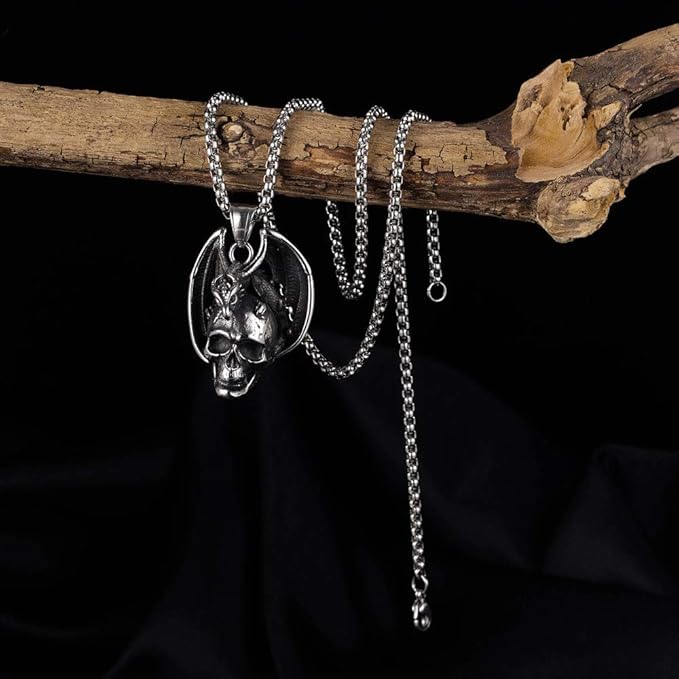 Rockyu ドクロ&ドラゴンウィングネックレス|ステンレス製 メンズ アンティーク風ペンダント