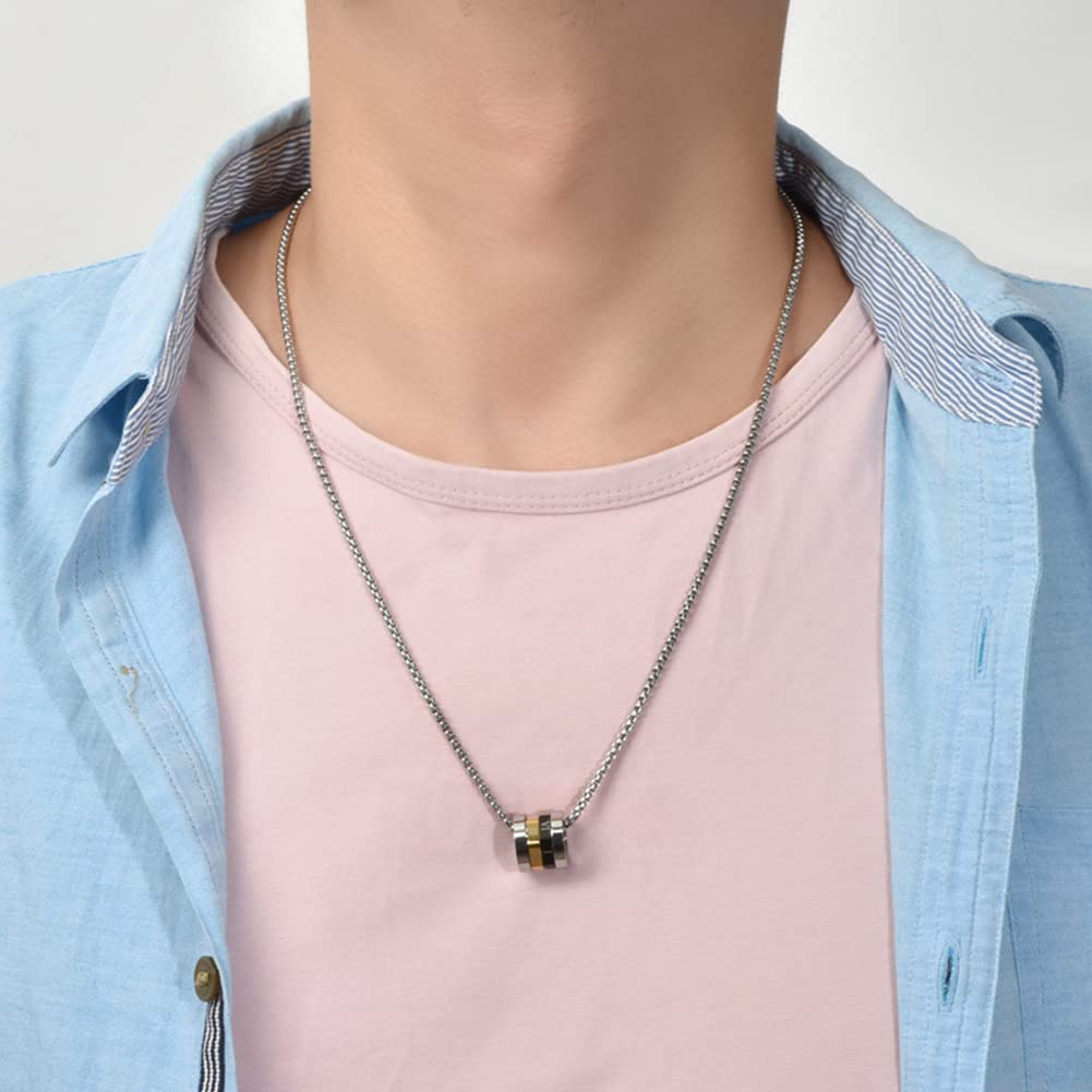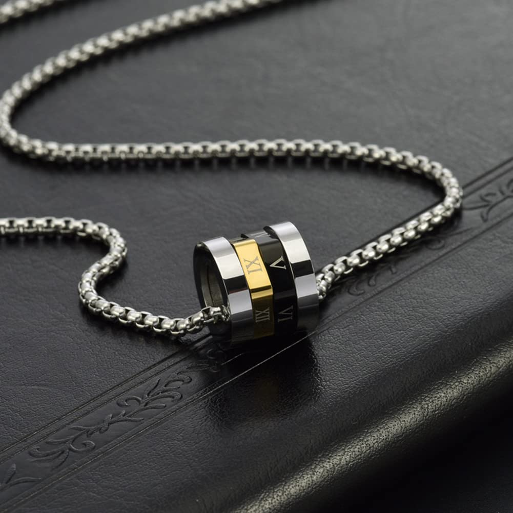 力強さとスマートさを兼ね備えた Rockyu メンズネックレス。シルバーに輝くリングペンダントは、ゴールドとブラックのローマ数字が刻まれた回転可能デザインで、遊び心と大人の余裕を演出します。高品質チタンを使用しており、金属アレルギーにも配慮した安心仕様。